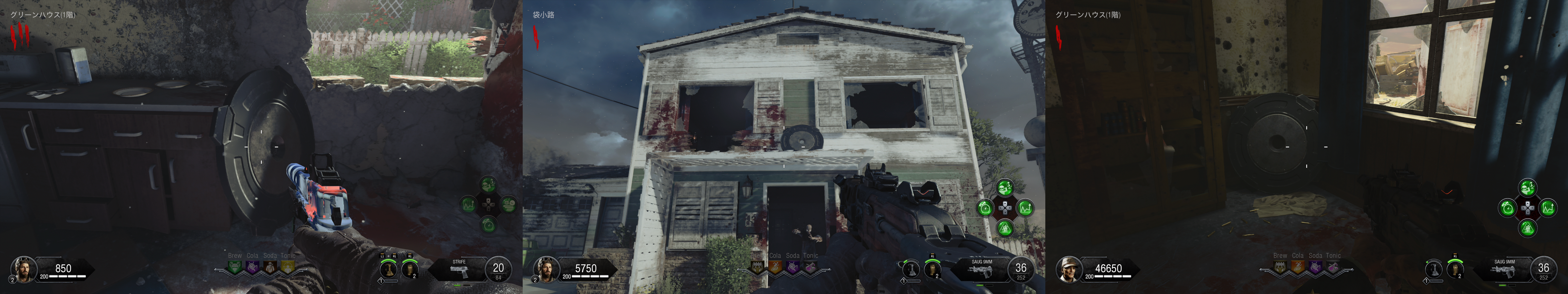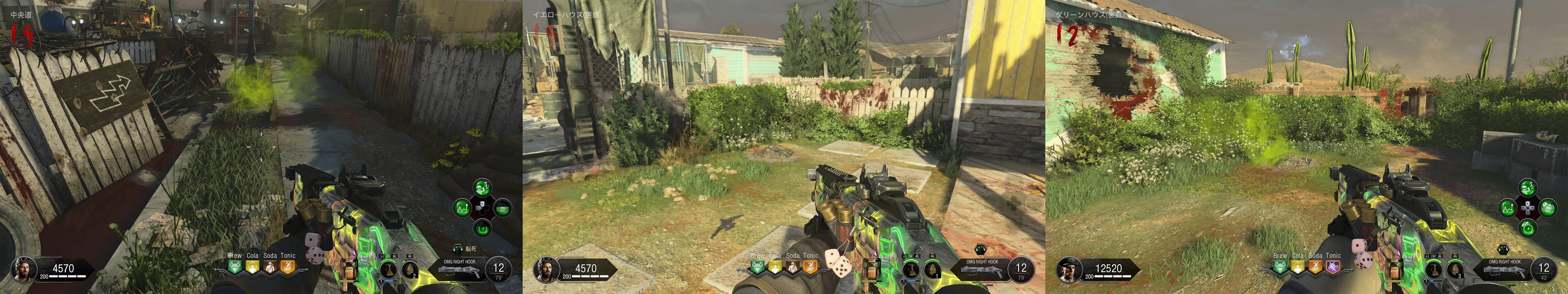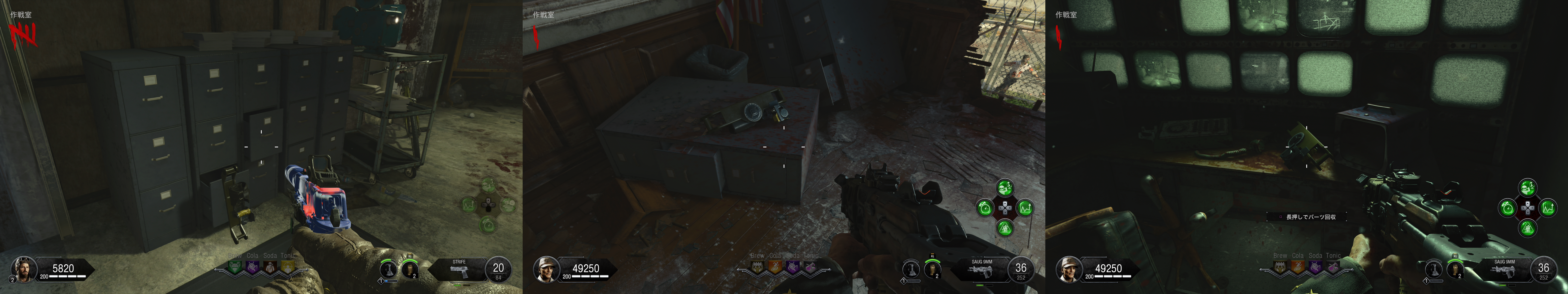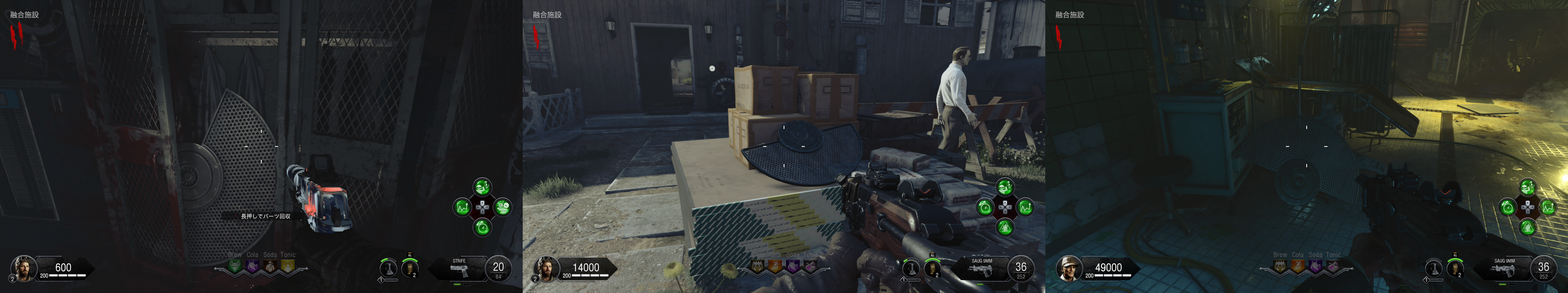 ギミック †シールド †組立台はグリーンハウス2階かAPD制御室。 パーツ1は作戦室に三か所 パーツ2は袋小路に三か所 パーツ3は寝室に三か所 テレパッド †組立台はグリーンハウス2階かAPD制御室。 発電機に三か所 グリーンハウスに三か所 融合施設に三か所 作成後はMAP各所のテレパッド設置場所に二か所設置。 メインイースターエッグ †ソロの場合、感染ゾンビの動きが早いので、Tonicにスタミンを入れておくと良い。あとは死に際の願いがあると保険になる。 あとはお好みだが、甲羅の守り、高速蘇生あたりが選択肢。今回はゾンビの攻撃力が高いので、逃げと回復を重視すると良い。 また、HELLION SALVOによる突破がボス戦も含めて有用なので、利用する場合はPhDスライダーを用意。ボス戦では地下エリアは自由に動き回れるため、PERKの配置もそれを意識すると良い。最終的にボス戦では発電機のPERK以外は取得が困難になるため、PhDスライダーに頼るならTONICに設置すること(どこかのタイミングで、ボス戦中はPERK補充できなくなっている可能性あり)。 エリクサーについては、大量のゾンビを捌くところが多いため、世界の終焉はあると楽。あと、金欠になりやすいので、へそくりあたりが余っていれば使いどころ。 ソロの場合、最初はガルバナックル購入と、PAPで脳死を付けられるように頑張って貯金し、その後PERKを購入し、全部の扉を開けるという流れになるはず。 パックアパンチまで †[ガス漏れを止めろ] 電源投入後、発電機で換気システムを作動させる。 この時点でシールドを作っておくと良い。 その後1ラウンド進めると、ラシュモアの声が聞こえる。 認証コード入力 †[緊急放送システムをテスト] 作戦室1階のモニターでラシュモアにインタラクト。 その後各地にある番号のメモを収集。 作戦室 → APD尋問室(候補地三か所) → APD制御室(書類を撃つと出てくる) → (近くのキーボックスから鍵を入手) → イエローハウス2階の引出 の順番で各地を回って調べる。 その上で、ラシュモア横の端末近くで数値に向かってインタラクトしENTERを押すとキー入力できる。 それぞれ、メッセージ終了後に1分の時間制限あり。 時刻合わせ †ここまででガルバナックルを購入しておくこと。 ラシュモアへの暗号入力が終わったら、地下の四つのうち電源のついているテレビの前で、ガルバナックルでゾンビを倒す。 A イエローハウス 各建物の中にある時計を、メッセージの出た順番どおりに併せていく。 また、時計はインタラクトボタン押しっぱなしで連続して回る。 全て合わせ終わった後、最後に余った家の建物の時計をインタラクトすると、時計が急回転して止まる。その時間を4つの数字に置き換えて(07:00なら0700)、ラシュモアに入力。 尚、この過程で、作戦室2階でレイガンマーク2を取得できるようになる。レイガンマーク2は、フレームキット(保管庫、独房、イエローハウス三か所にパーツが散らばっている)を組み立てて、更に他武器での追加属性を利用した手順をこなすことで属性武器に改造できるが、メインストーリ攻略だけを目指すなら不要。 また、囚人収容所の換気ユニット向かいのロッカーから、ランダムでPAP武器が一つ入手できる。 クロウラーゾンビ引き連れ †[科学と発明の道全て辿れ] 認証コード入力後、再度ラシュモアをインタラクト。 会話終了後、MAPのどこかに赤いクロウラーゾンビが現れるので、それを融合施設に連れていく。 赤いクロウラーゾンビは距離を離すと遠くへと逃げて行ってしまう。それを逆手にとり、行ってほしい方向の反対側でゾンビをトレインしていると意図した方向に向かってくれやすい。 赤いクロウラーゾンビを倒してしまった場合は、おそらくラウンド跨ぎで他の場所にスポーンする。また、引き連れてるときにラウンド跨ぎした場合はそのまま続行できる。 キャニスター取得 †赤いクロウラーゾンビの引き連れに成功した後、再度ラシュモアをインタラクト。 会話を聞きながら保管室に行くと、既に扉が開いているので、A.D.A.M.を起動。 そのままグリーンハウスから地下に向かう途中までA.D.A.M.を連れていくと(ゾンビが居なければ勝手についてくる)、会話が発生し、キャニスターが現れるので取得。 キャニスターを取得したら、融合施設のキャニスター置き場に設置。 サーバー起動 †ここまででテレパッド作成必須。グリーンハウス二階かAPD制御室で組み立てておくこと。パーツはグリーンハウス付近、発電機付近、融合施設付近に落ちている。 キャニスター設置後、ラシュモアをインタラクト。 絵画の暗号取得 †ここまでで、PAPで脳死付きの武器を作っておくこと。 次に、マップ各所にある絵画の中で、毒を吐いているものがあるので探し、その付近で脳死ゾンビを作る。するとゾンビが絵画を攻撃するので、その裏にある4桁の数字をメモ。寝室、ラウンジ、グリーンハウス2階にそれぞれある。 三か所の数字をメモしたら、ラシュモアのナンバーパッドに入力