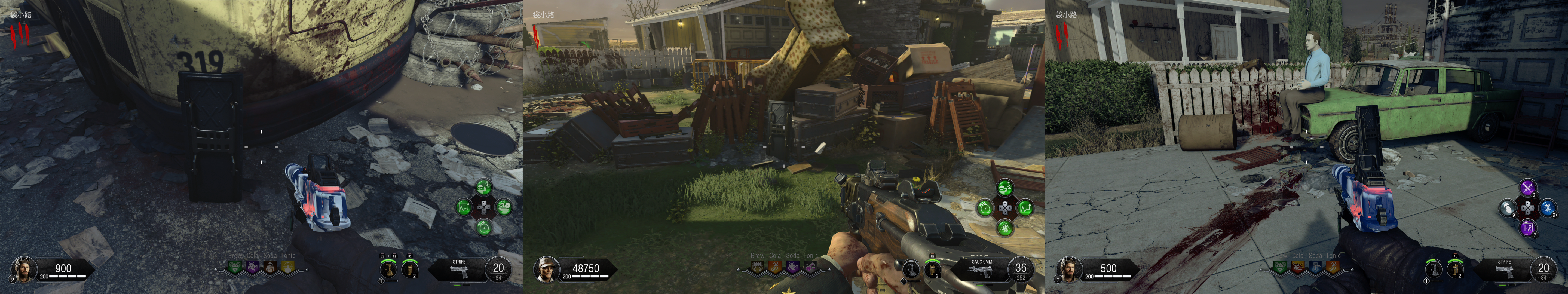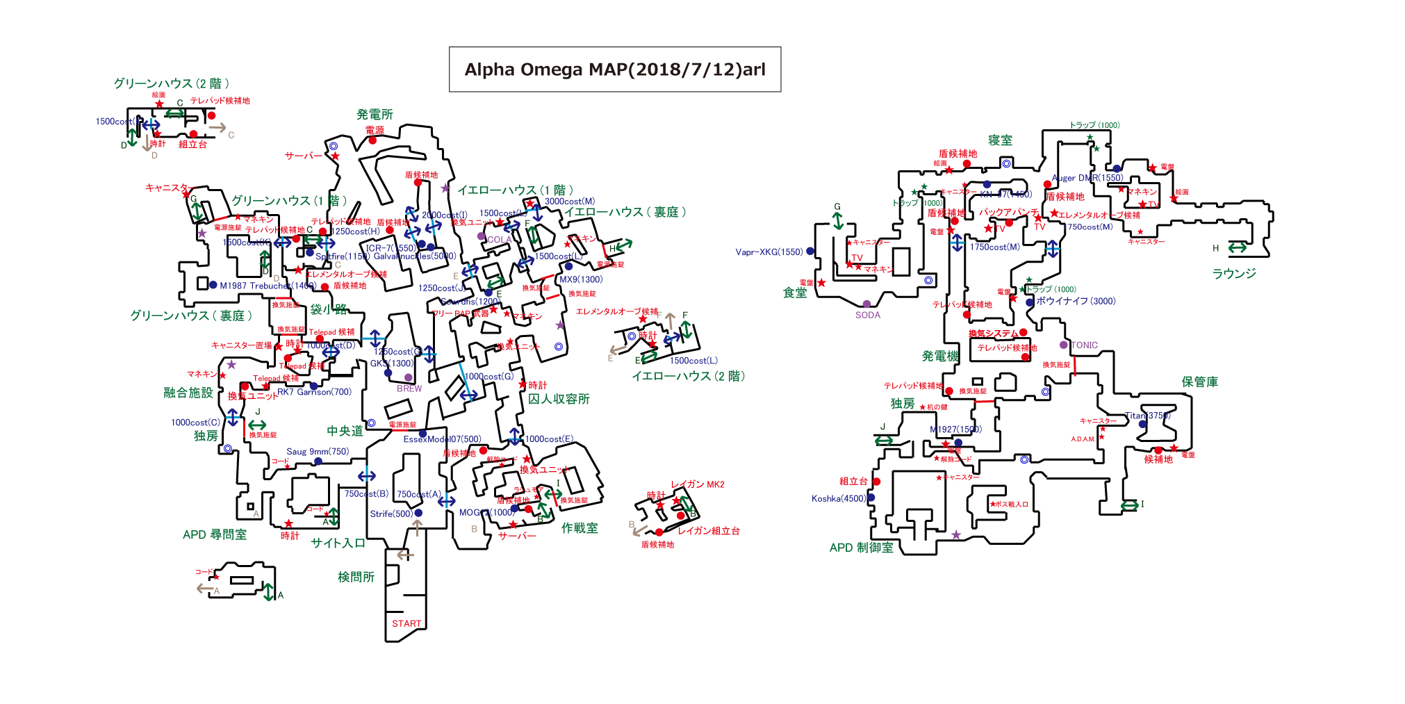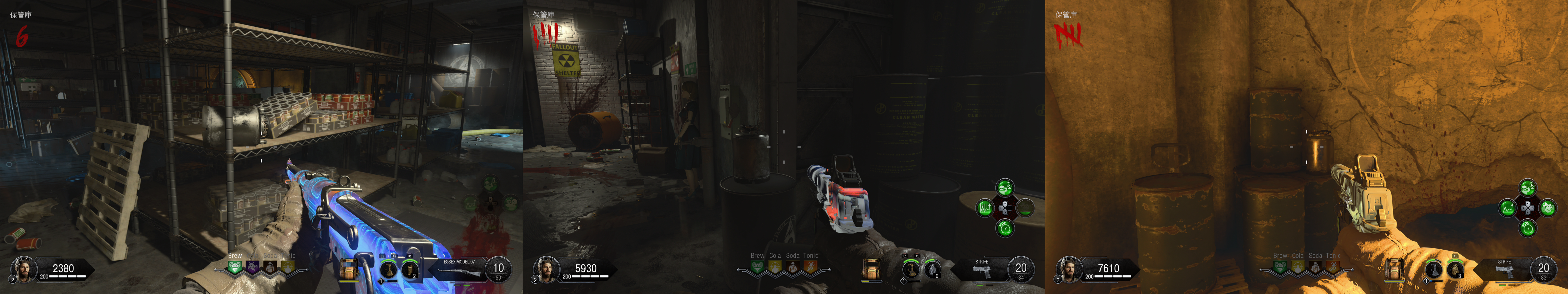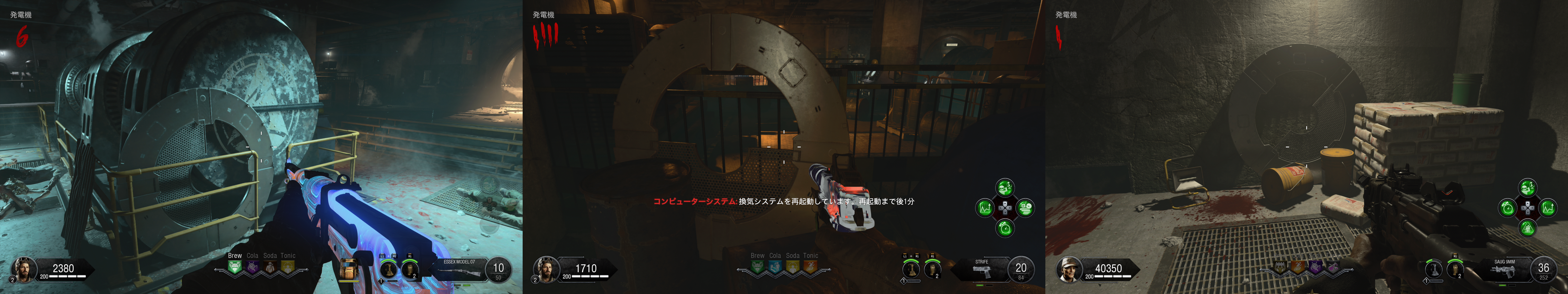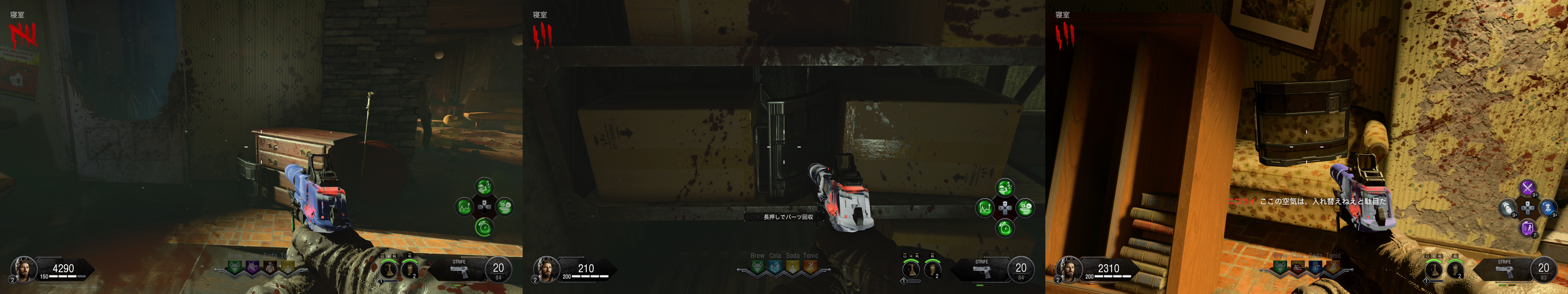 ギミック †シールド †組立台はグリーンハウス2階かAPD制御室。 パーツ1は作戦室に三か所 パーツ2は袋小路に三か所 パーツ3は寝室に三か所 テレパッド †組立台はグリーンハウス2階かAPD制御室。 発電機に三か所 グリーンハウスに三か所 融合施設に三か所 作成後はMAP各所のテレパッド設置場所に二か所設置。 メインイースターエッグ †ソロの場合、感染ゾンビの動きが早いので、Tonicにスタミンを入れておくと良い。あとは死に際の願いがあると保険になる。 あとはお好みだが、甲羅の守り、高速蘇生あたりが選択肢。今回はゾンビの攻撃力が高いので、逃げと回復を重視すると良い。 また、HELLION SALVOによる突破がボス戦も含めて有用なので、利用する場合はPhDスライダーを用意。ボス戦では地下エリアは自由に動き回れるため、PERKの配置もそれを意識すると良い。最終的にボス戦では発電機のPERK以外は取得が困難になるため、PhDスライダーに頼るならTONICに設置すること(どこかのタイミングで、ボス戦中はPERK補充できなくなっている可能性あり)。 エリクサーについては、大量のゾンビを捌くところが多いため、世界の終焉はあると楽。あと、金欠になりやすいので、へそくりあたりが余っていれば使いどころ。 ソロの場合、最初はガルバナックル購入と、PAPで脳死を付けられるように頑張って貯金し、その後PERKを購入し、全部の扉を開けるという流れになるはず。 パックアパンチまで †[ガス漏れを止めろ] 電源投入後、発電機で換気システムを作動させる。 この時点でシールドを作っておくと良い。 その後1ラウンド進めると、ラシュモアの声が聞こえる。 認証コード入力 †[緊急放送システムをテスト] 作戦室1階のモニターでラシュモアにインタラクト。 その後各地にある番号のメモを収集。 作戦室 → APD尋問室(候補地三か所) → APD制御室(書類を撃つと出てくる) → (近くのキーボックスから鍵を入手) → イエローハウス2階の引出 の順番で各地を回って調べる。 その上で、ラシュモア横の端末近くで数値に向かってインタラクトしENTERを押すとキー入力できる。 それぞれ、メッセージ終了後に1分の時間制限あり。 時刻合わせ †ここまででガルバナックルを購入しておくこと。 ラシュモアへの暗号入力が終わったら、地下の四つのうち電源のついているテレビの前で、ガルバナックルでゾンビを倒す。 A イエローハウス 各建物の中にある時計を、メッセージの出た順番どおりに併せていく。 また、時計はインタラクトボタン押しっぱなしで連続して回る。 全て合わせ終わった後、最後に余った家の建物の時計をインタラクトすると、時計が急回転して止まる。その時間を4つの数字に置き換えて(07:00なら0700)、ラシュモアに入力。 尚、この過程で、作戦室2階でレイガンマーク2を取得できるようになる。レイガンマーク2は、フレームキット(保管庫、独房、イエローハウス三か所にパーツが散らばっている)を組み立てて、更に他武器での追加属性を利用した手順をこなすことで属性武器に改造できるが、メインストーリ攻略だけを目指すなら不要。 また、囚人収容所の換気ユニット向かいのロッカーから、ランダムでPAP武器が一つ入手できる。 クロウラーゾンビ引き連れ †[科学と発明の道全て辿れ] 認証コード入力後、再度ラシュモアをインタラクト。 会話終了後、MAPのどこかに赤いクロウラーゾンビが現れるので、それを融合施設に連れていく。 赤いクロウラーゾンビは距離を離すと遠くへと逃げて行ってしまう。それを逆手にとり、行ってほしい方向の反対側でゾンビをトレインしていると意図した方向に向かってくれやすい。 赤いクロウラーゾンビを倒してしまった場合は、おそらくラウンド跨ぎで他の場所にスポーンする。また、引き連れてるときにラウンド跨ぎした場合はそのまま続行できる。 キャニスター取得 †赤いクロウラーゾンビの引き連れに成功した後、再度ラシュモアをインタラクト。 会話を聞きながら保管室に行くと、既に扉が開いているので、A.D.A.M.を起動。 そのままグリーンハウスから地下に向かう途中までA.D.A.M.を連れていくと(ゾンビが居なければ勝手についてくる)、会話が発生し、キャニスターが現れるので取得。 キャニスターを取得したら、融合施設のキャニスター置き場に設置。 サーバー起動 †ここまででテレパッド作成必須。グリーンハウス二階かAPD制御室で組み立てておくこと。パーツはグリーンハウス付近、発電機付近、融合施設付近に落ちている。 キャニスター設置後、ラシュモアをインタラクト。 絵画の暗号取得 †ここまでで、PAPで脳死付きの武器を作っておくこと。 次に、マップ各所にある絵画の中で、毒を吐いているものがあるので探し、その付近で脳死ゾンビを作る。するとゾンビが絵画を攻撃するので、その裏にある4桁の数字をメモ。寝室、ラウンジ、グリーンハウス2階にそれぞれある。 三か所の数字をメモしたら、ラシュモアのナンバーパッドに入力