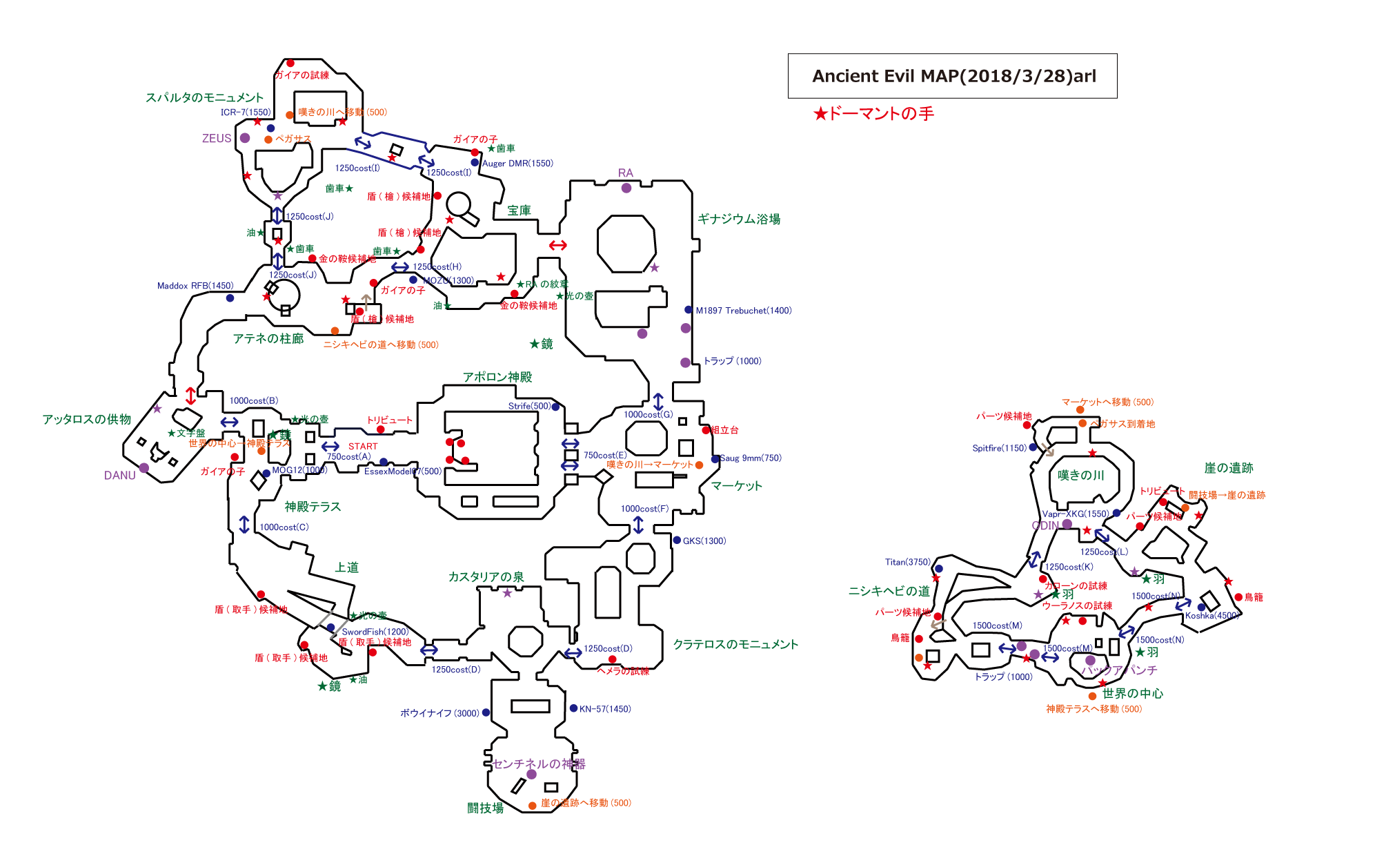 メインクエスト †トリビュート †今作のチャレンジ。内容は ・ダメージを受けない 等。 クエスト攻略には、報酬を受け取らずに何度もチャレンジを行い、ソロならエピックを1度、レジェンド以上も1度達成しておく必要がある。 (盾)アポロンの意思 †マップ各所に置いてるハンドルと槍、および、ギギネスを倒すと出てくる面をマーケットの組立台で組み立てる。 鷲を解き放つ †パックアパンチ解放 †闘技場でセンチネルの神器を拾う。 大量のスケルトンと骸骨が襲ってくるので倒す。 金の鞍を入手。候補地二か所 その後、スパルタのモニュメントに魔方陣ができてペガサスに乗れる。 ニシキヘビの道の鳥籠の鎖を銃で撃ち、地面に鳥籠を落とし、特殊装備武器で殴って鷲を開放。 同じく崖の遺跡で鳥籠を特殊装備武器で殴って鷲を開放。 世界の中心に一定数スケルトンが湧くので、適当に倒してるとPAP解放。 ワンダーウェポン獲得 †序盤で入手できるため、ボウイナイフよりもこちらの入手を先行させるべき。 まず、マップ各所に落ちている「ドーマントの手」を入手。落ちてる場所についてはアポロン神殿でヒントを得られるが、候補地を周ったほうが早い。 それを各所の祭壇に設置し、魔方陣に閉じ込められた状態で一定数ゾンビを倒す。おそらく、体が燃えているゾンビのみがカウントされる。 達成後、「堕ちた~の手」が入手できるので、それを持ってそれぞれのクエストを攻略。 再度祭壇から、チャージショットのチュートリアルを受けられるので、それを達成することで強化完了。 チュートリアルは結構難易度が高いので、惜しげなくチャージショットを連打したほうが攻略しやすい。 堕ちたヘメラの手~續われたヘメラの手 †ヘメラの試練を受け、堕ちたガイアの手を入手。 その後、MAP三か所に、鏡がある場所がある。 三か所全て実施でチュートリアルを受けることができる。達成で續われたヘメラの手を入手。 續われたヘメラの手のチャージショットは、光の柱を出現させることができ、それに当たった敵を攻撃することができる。弾が減らないのは強いが緊急回避には使えない。 堕ちたガイアの手~續われたガイアの手 †ガイアの試練を受け、堕ちたガイアの手を入手。 その後、MAP三か所に、赤色の宝石がなった樹があるので、その赤色の宝石を全て「堕ちたガイアの手」のショットで撃ち落とす。 すると「ガイアの子」という小さな木を拾えるので、拾ったまま祭壇まで持っていき、三つとも捧げる。 チュートリアルを受けられるので、完了後、續われたガイアの手を入手完了。 堕ちたウーラノスの手~續われたウーラノスの手 †ウーラノスの試練を受け、堕ちたウーラノスの手を入手。 その後、滝裏の洞窟内の、ニシキヘビの道、崖の遺跡、世界の中心のそれぞれにある羽に向かって、「堕ちたウーラノスの手」のショットでゾンビを撃つと、ふっとんだゾンビは羽に当たって、一定時間クリスタルが出現する。 三つとも完了すると、元の場所でチュートリアルを受けられるので、完了後、續われたウーラノスの手を入手完了。 ウーラノスの手はチャージしてるだけで敵を吹き飛ばせるので強力 堕ちたカローンの手~續われたカローンの手 †カローンの試練を受け、堕ちたカローンの手を入手。 その後、嘆きの川のODINパークの前の水たまりで、堕ちたカローンの手のショットで敵を倒し、水に沈める。 その後、滝の裏の洞窟の各所にたくさんのコインが出現するので、全体をくまなく走って探す。この間、体力が回復しなくなるので、敵からのダメージを受けないよう、最大限に注意。 チュートリアル成功で續われたカローンの手を入手できる。 續われたカローンの手のチャージショットは、敵を大範囲で消滅させることができるが、いまいち使いづらい。 ビーコンに点火する †死人を直視する †住民を整列させる †杖と日時計 † |
