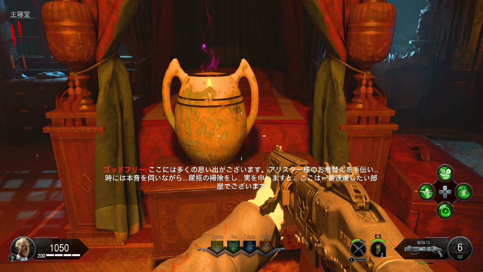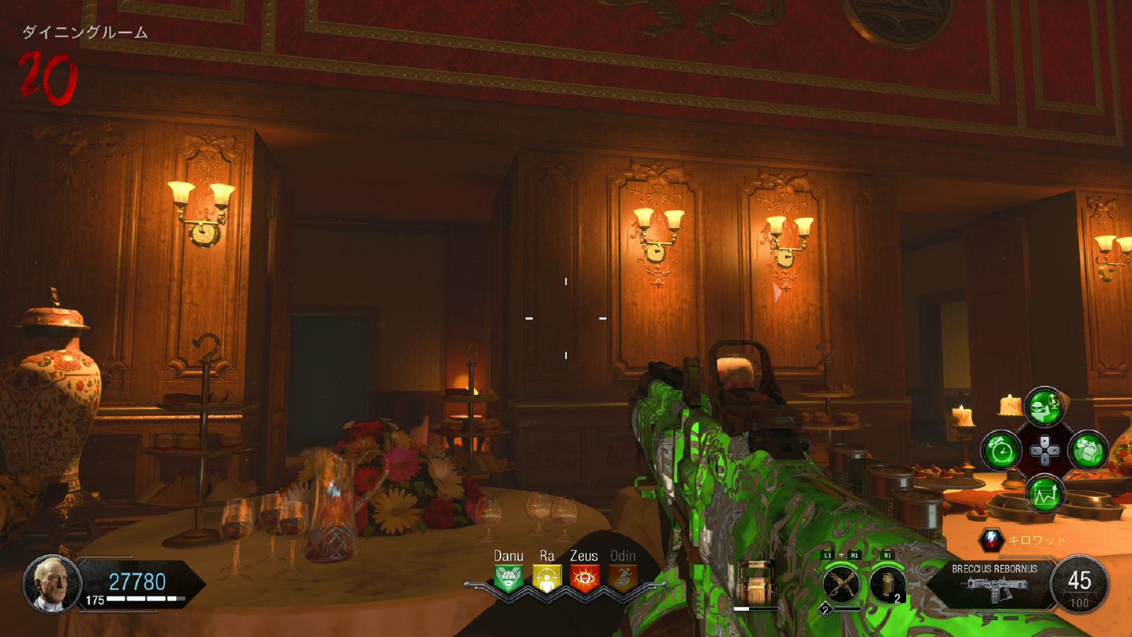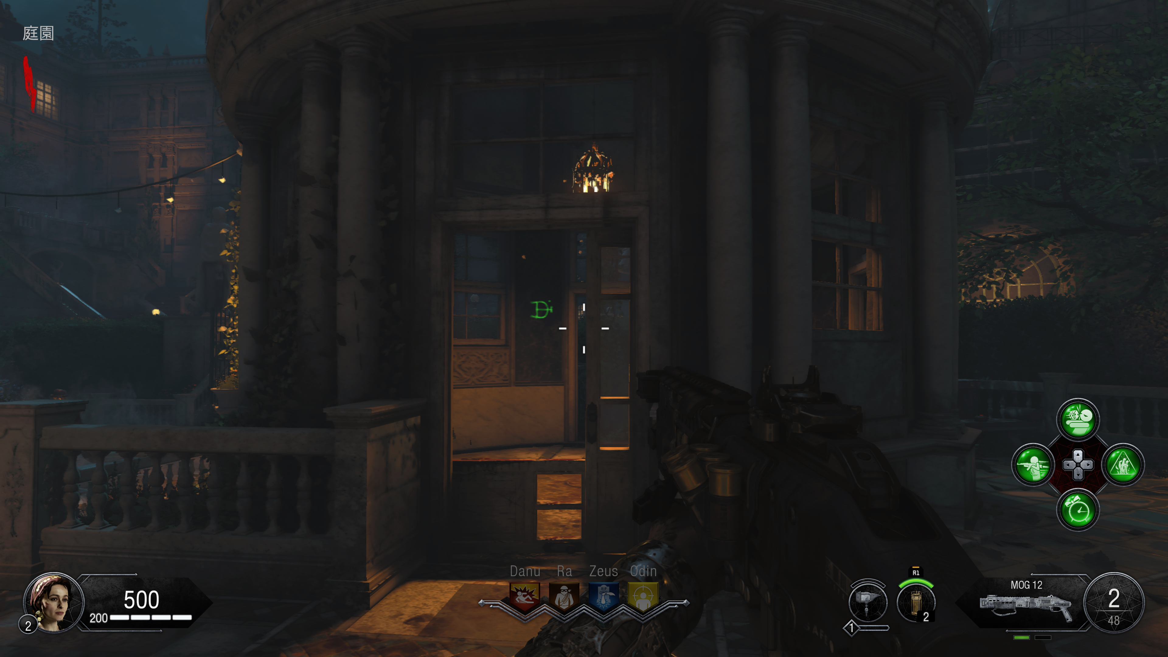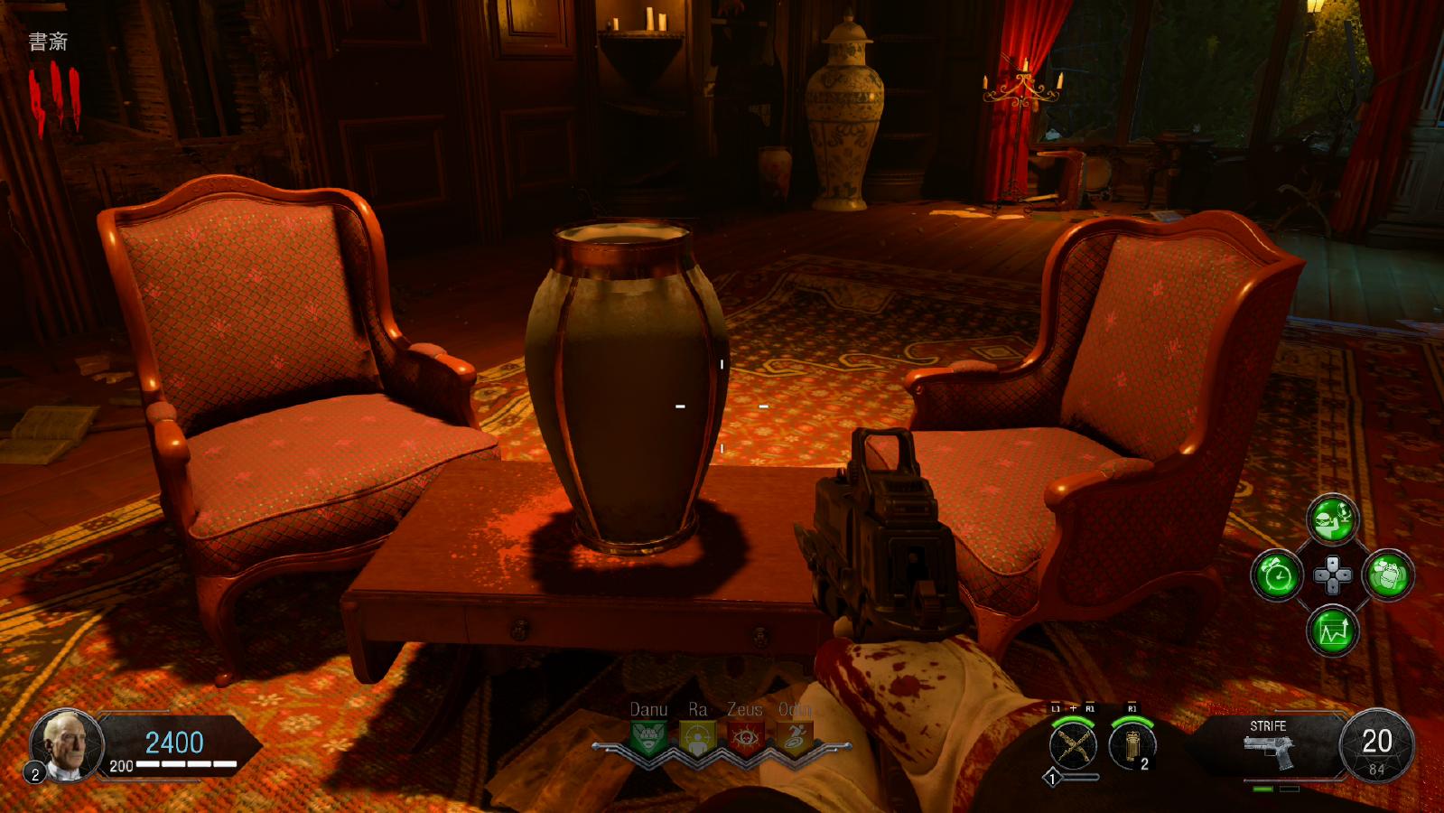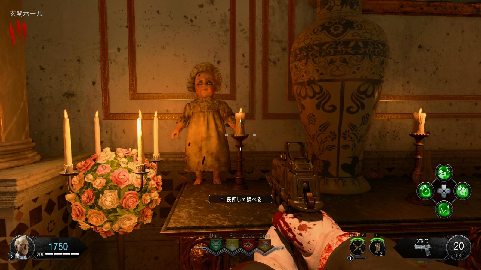 メインクエスト †パックアパンチ解放 †大階段でセンチネルの神器を使う。 その後、各部屋に石の入った壺があるので、打撃で破壊。周囲でゾンビを4キルすると石が輝くので、全て行う。候補地7か所。石は3か所 主寝室 ワインセラー(1) ワインセラー(2) 図書室 書斎 トロフィールーム 寝室廊下 石はチャージが完了すると、中を覗き込むことができる。 時計 ビリヤードルーム、メインホール、ダイニングルームに時計があるのでインタラクト。 インタラクトすると地面に紋章が現れるので、その中で一定時間待機。 完了すると音叉が出てくるので拾う。また、クリアでトロフィー「オンザクロック」入手。 PERK 表示されたPERKの像へ移動。 周辺にヴァンパイアが現れるので全員倒す。 完了すると音叉が出てくるので拾う。 人形 2階玄関ホールに人形があるのでインタラクト。幽霊が現れる。 幽霊の周囲に行くと移動するので、近づいては追いかけるを繰り返す。 最終的に墓地まで移動。 完了すると音叉を落とすので拾う。 女性の絵画 流れは人形と一緒。ゴールは温室テラス。 ロープの輪っか 流れは人形と一緒。 少女と老人 流れは人形と一緒。 悪そうな顔の女 流れは人形と一緒。 聖書 書斎の本棚。 流れは人形と一緒。 音叉を三つ入手したら、森のテラスにある玄関の黒い塊に使用。玄関が開くので奥へ進む。 一番奥にPAPがある。 途中、狼男が出現するので注意。 一番奥まで行くとPAPがある。 シルバー弾入手 †まず、6つのパーツを集める。候補地はそれぞれ三か所 ボトル 図書室からメインホールへ抜ける途中の西廊下のソファー ダイニングルームの時計の裏側にある赤いテーブル 燭台 メインホールの壁の前の壺 ビリヤードルームの床 ワインセラー右側の壁のあたり 皿 ワインセラー、テーブルの上 ワインセラー、棚の上 糞 墓地と霊廟のあたり。霊廟から屋敷側を見て正面の壁の左端 墓地と霊廟の階段の近くの木の後ろ 木炭 ビリヤード室の暖炉 メインホールの暖炉 硫黄 その後、ワインセラーの組立台で銀を作る。 ALISTER'S FOLLY †図書室に暗号を入力できるパネルがある。 マップ各地に正解の記号が点在しているので、それを確認して入力する。 青のシンボルは墓~霊廟あたり。候補地4箇所。 緑のシンボルは庭園。候補地4箇所。 黄色のシンボルは森のテラス。候補地4箇所。 赤のシンボルは、主寝室、西ギャラリー、ワインセラー、ダイニングルーム。 どれもMAP外やバリケードの外にある。 正解のコードを入力すると銃が取れるようになる。 一度入手すると、M.BOXでも出現するようになる。 バリスティックシールド †各地にある盾のパーツを組立台で組み立てる。部品はそれぞれ3箇所にランダムでスポーン シールドプレート メーター 喫煙室で組み立てる。 Chaos Theory †狼男をシルバー弾で倒すと、狼人間カオス素材を落とすので入手。 その後、温室研究所でプリママテリア装置を起動。 暫く待つと装置の側面にプリママテリアが出てくるので入手。 図書室へ行き、バリスティックシールドで左側の本棚を殴ると、隠し空間が現れて、銃のパーツが入手できる。 再度温室研究所へ向かい、ALISTER'S FOLLY を Chaos Theory 組立台でパワーアップすることができる。 R2でチャージショット発射可能。 Alistair's Annihilator †霊廟の正面、消えているランプの前あたりで、Chaos Theoryのチャージショットでヴァンパイアを倒す。黄色い何かに当ててる間にさらに竜巻を当てるといいのかもしれない。 そのうち、ヴァンパイアが胆汁を落とす。 何個か胆汁を拾っていると、霊廟正面の墓が赤く光る。 インタラクトすると、赤いヴァンパイアが現れるので倒す。 すると、吸血鬼カオス素材が手に入るので入手。 これを温室研究所のプリママテリアにかけるとパーツが一つ入手できる。 次に、霊廟の正面、1ラウンドごとに、ランプが一つ追加で点灯する。 これをChaos Theoryで撃つと、他のランプが点灯する。一定時間以内にランプを撃ち続けていると、3箇所目くらいで蝙蝠が空に向かって飛び立つ。それをChaos Theoryで撃ち落とすと蝙蝠カオス素材が入手できる。 これを温室研究所のプリママテリアにかけるとパーツが一つ入手できる。 最後に森で、土に埋まってキノコが生えている骨の周囲にいく。 この骨の上で、チャージショットをゾンビを直接当て、黄色い何かが発動すると、地面を掘ってパーツが出現する。三か所のうち正解は一か所。 これを入手。 三つのパーツを集めた後、温室研究所の Alistair's Annihilator組立台で、Chaos TheoryをAlistair's Annihilatorに加工できるようになる。 結晶からチャレンジを受ける †PAP解放の際にチャージした結晶を再度インタラクトすると、イラストが見える。それに対応したクエストをこなす必要がある。 騎士 †ALISTER'S ANNIHILATOR とシールド必須。 図書室のファイアゲートの罠を作成する。 ファイアゲートを起動するためのアイテムはランダムで各地に散らばってる。 暖炉にランダムに決まる順番に