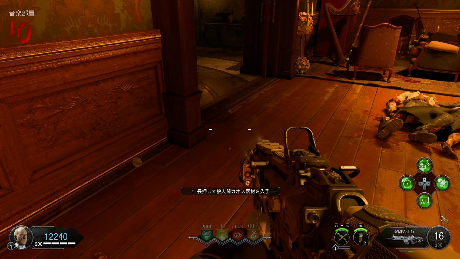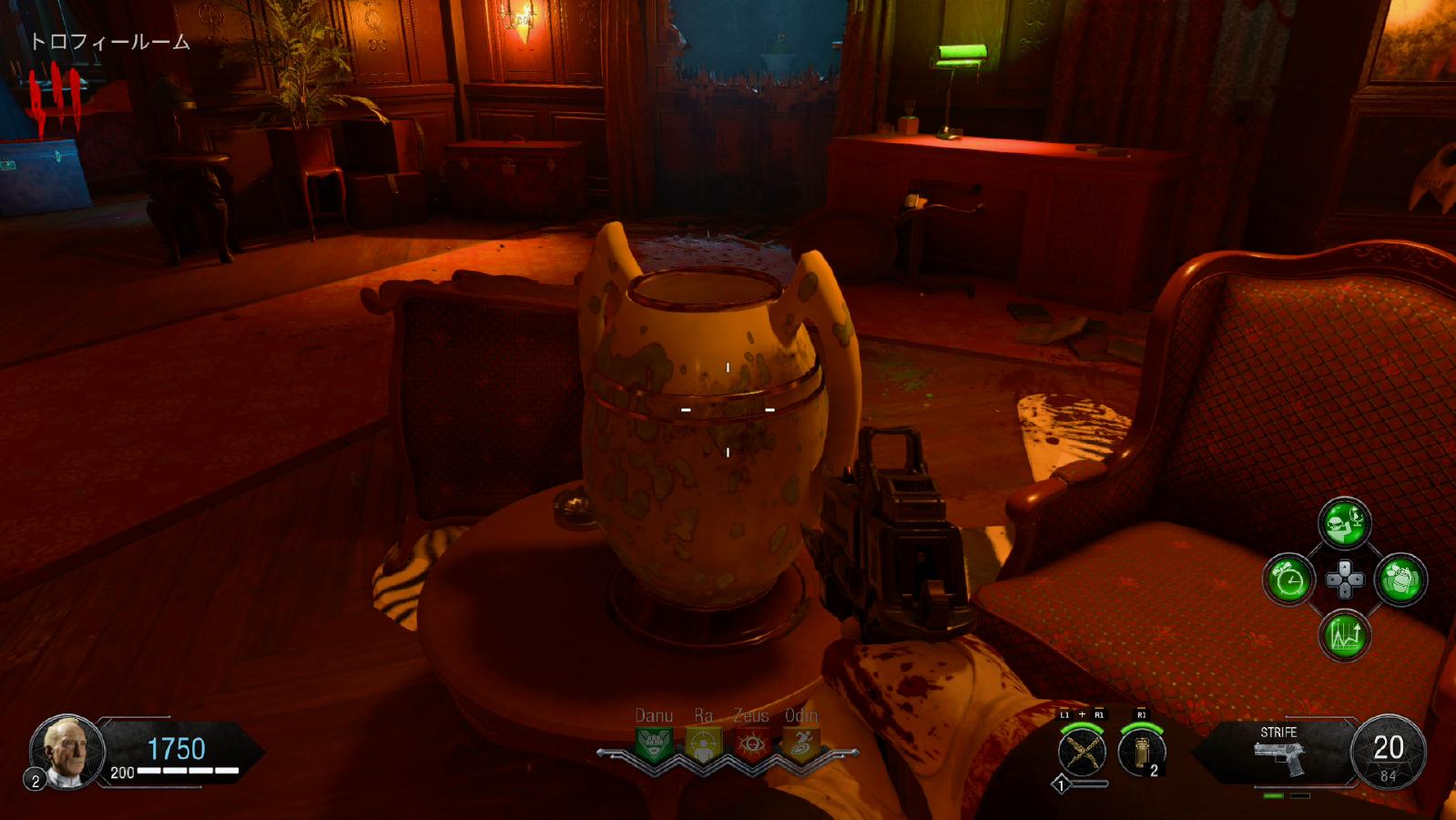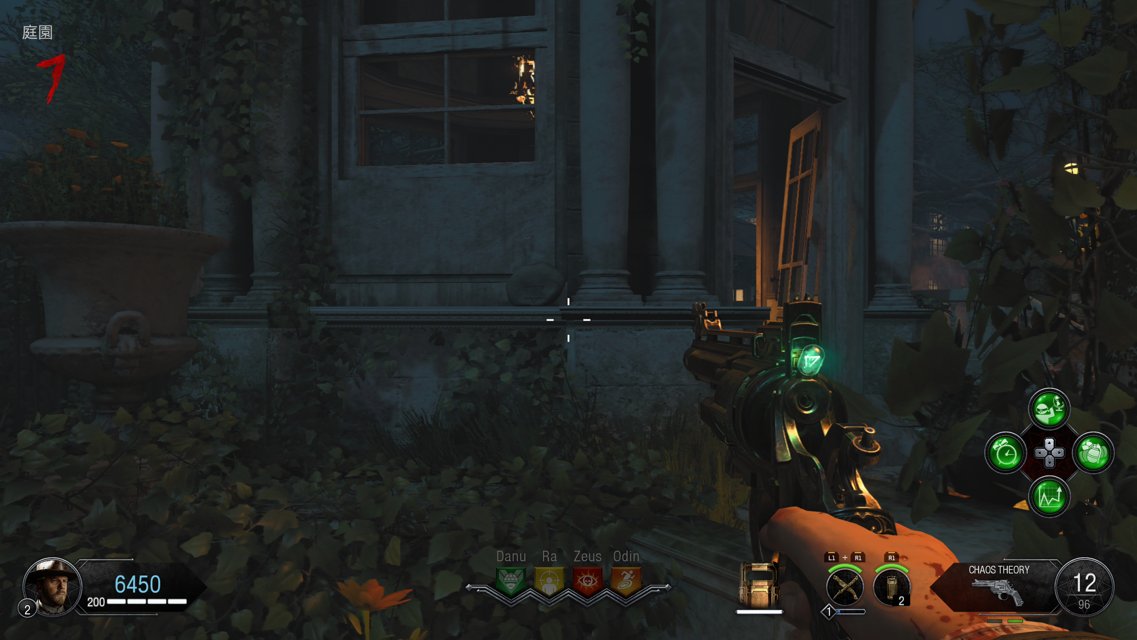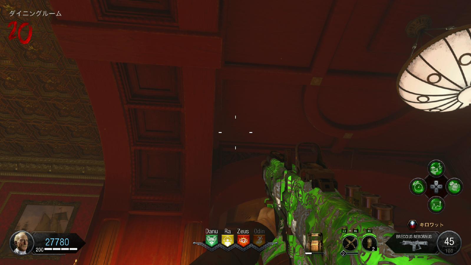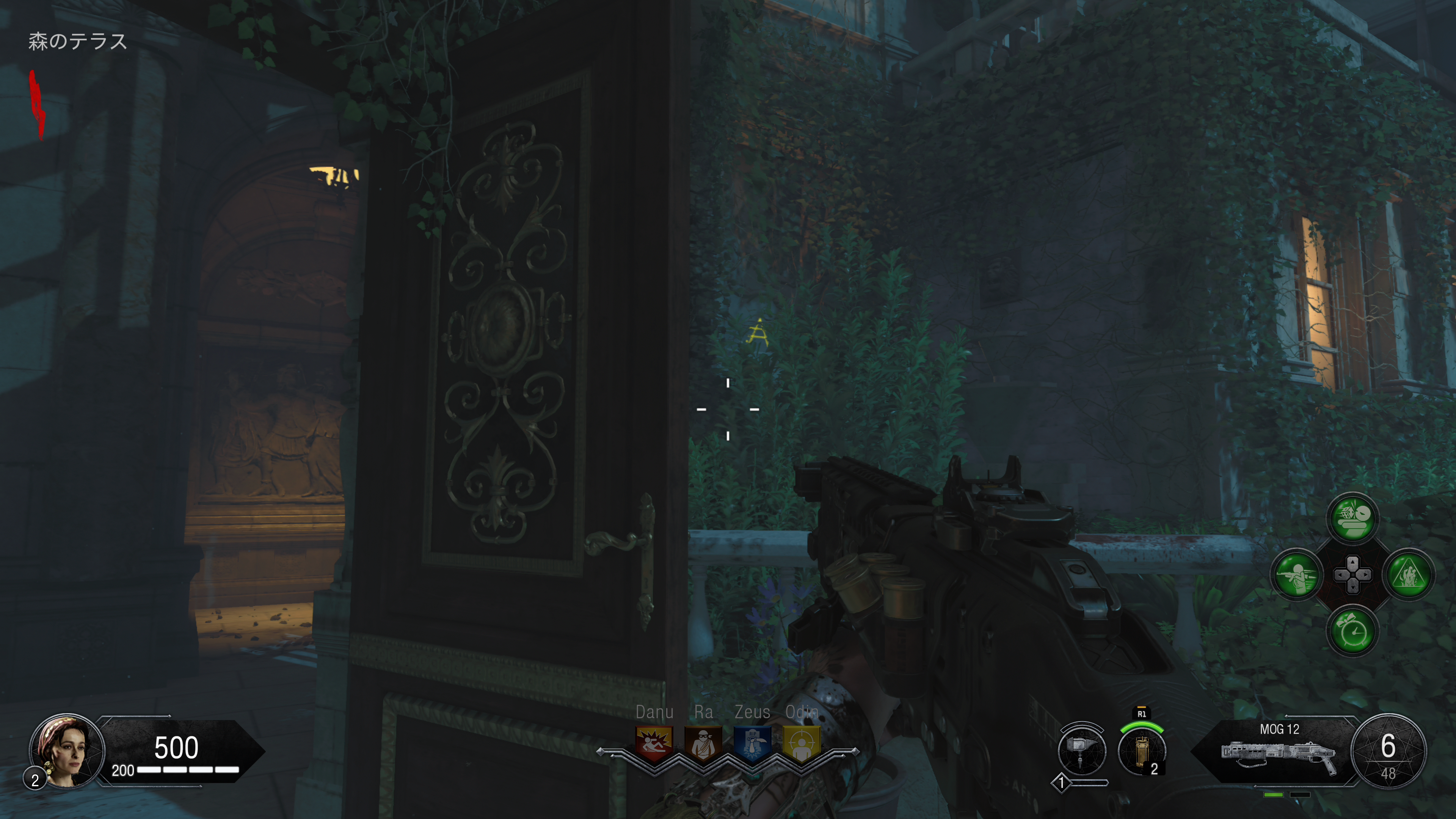 メインクエスト †パックアパンチ解放 †大階段でセンチネルの神器を使う。 その後、各部屋に石の入った壺があるので、打撃で破壊。周囲でゾンビを4キルすると石が輝くので、全て行う。候補地7か所。石は3か所 主寝室 ワインセラー(1) ワインセラー(2) 図書室 書斎 トロフィールーム 寝室廊下 石はチャージが完了すると、中を覗き込むことができる。 時計 ビリヤードルーム、メインホール、ダイニングルームに時計があるのでインタラクト。 インタラクトすると地面に紋章が現れるので、その中で一定時間待機。 完了すると音叉が出てくるので拾う。また、クリアでトロフィー「オンザクロック」入手。 PERK 表示されたPERKの像へ移動。 周辺にヴァンパイアが現れるので全員倒す。 完了すると音叉が出てくるので拾う。 人形 2階玄関ホールに人形があるのでインタラクト。幽霊が現れる。 幽霊の周囲に行くと移動するので、近づいては追いかけるを繰り返す。 最終的に墓地まで移動。 完了すると音叉を落とすので拾う。 女性の絵画 流れは人形と一緒。ゴールは温室テラス。 ロープの輪っか 流れは人形と一緒。 少女と老人 流れは人形と一緒。 悪そうな顔の女 流れは人形と一緒。 聖書 書斎の本棚。 流れは人形と一緒。 音叉を三つ入手したら、森のテラスにある玄関の黒い塊に使用。玄関が開くので奥へ進む。 一番奥にPAPがある。 途中、狼男が出現するので注意。 一番奥まで行くとPAPがある。 シルバー弾入手 †まず、6つのパーツを集める。候補地はそれぞれ三か所 ボトル 図書室からメインホールへ抜ける途中の西廊下のソファー ダイニングルームの時計の裏側にある赤いテーブル 燭台 メインホールの壁の前の壺 ビリヤードルームの床 ワインセラー右側の壁のあたり 皿 ワインセラー、テーブルの上 ワインセラー、棚の上 糞 墓地と霊廟のあたり。霊廟から屋敷側を見て正面の壁の左端 墓地と霊廟の階段の近くの木の後ろ 木炭 ビリヤード室の暖炉 メインホールの暖炉 硫黄 その後、ワインセラーの組立台で銀を作る。 ALISTER'S FOLLY †図書室に暗号を入力できるパネルがある。 マップ各地に正解の記号が点在しているので、それを確認して入力する。 青のシンボルは墓~霊廟あたり。候補地4箇所。 緑のシンボルは庭園。候補地4箇所。 黄色のシンボルは森のテラス。候補地4箇所。 赤のシンボルは、主寝室、西ギャラリー、ワインセラー、ダイニングルーム。 どれもMAP外やバリケードの外にある。 正解のコードを入力すると銃が取れるようになる。 一度入手すると、M.BOXでも出現するようになる。 バリスティックシールド †各地にある盾のパーツを組立台で組み立てる。部品はそれぞれ3箇所にランダムでスポーン シールドプレート メーター 喫煙室で組み立てる。 Chaos Theory †狼男をシルバー弾で倒すと、狼人間カオス素材を落とすので入手。 その後、温室研究所でプリママテリア装置を起動。 暫く待つと装置の側面にプリママテリアが出てくるので入手。 図書室へ行き、バリスティックシールドで左側の本棚を殴ると、隠し空間が現れて、銃のパーツが入手できる。 再度温室研究所へ向かい、ALISTER'S FOLLY を Chaos Theory 組立台でパワーアップすることができる。 R2でチャージショット発射可能。 Alistair's Annihilator †霊廟の正面、消えているランプの前あたりで、Chaos Theoryのチャージショットでヴァンパイアを倒す。黄色い何かに当ててる間にさらに竜巻を当てるといいのかもしれない。 そのうち、ヴァンパイアが胆汁を落とす。 何個か胆汁を拾っていると、霊廟正面の墓が赤く光る。 インタラクトすると、赤いヴァンパイアが現れるので倒す。 すると、吸血鬼カオス素材が手に入るので入手。 これを温室研究所のプリママテリアにかけるとパーツが一つ入手できる。 次に、霊廟の正面、1ラウンドごとに、ランプが一つ追加で点灯する。 これをChaos Theoryで撃つと、他のランプが点灯する。一定時間以内にランプを撃ち続けていると、3箇所目くらいで蝙蝠が空に向かって飛び立つ。それをChaos Theoryで撃ち落とすと蝙蝠カオス素材が入手できる。 これを温室研究所のプリママテリアにかけるとパーツが一つ入手できる。 最後に森で、土に埋まってキノコが生えている骨の周囲にいく。 この骨の上で、チャージショットをゾンビを直接当て、黄色い何かが発動すると、地面を掘ってパーツが出現する。三か所のうち正解は一か所。 これを入手。 三つのパーツを集めた後、温室研究所の Alistair's Annihilator組立台で、Chaos TheoryをAlistair's Annihilatorに加工できるようになる。 結晶からチャレンジを受ける †PAP解放の際にチャージした結晶を再度インタラクトすると、イラストが見える。それに対応したクエストをこなす必要がある。 騎士 †ALISTER'S ANNIHILATOR とシールド必須。 図書室のファイアゲートの罠を作成する。 ファイアゲートを起動するためのアイテムはランダムで各地に散らばってる。 暖炉にランダムに決まる順番に