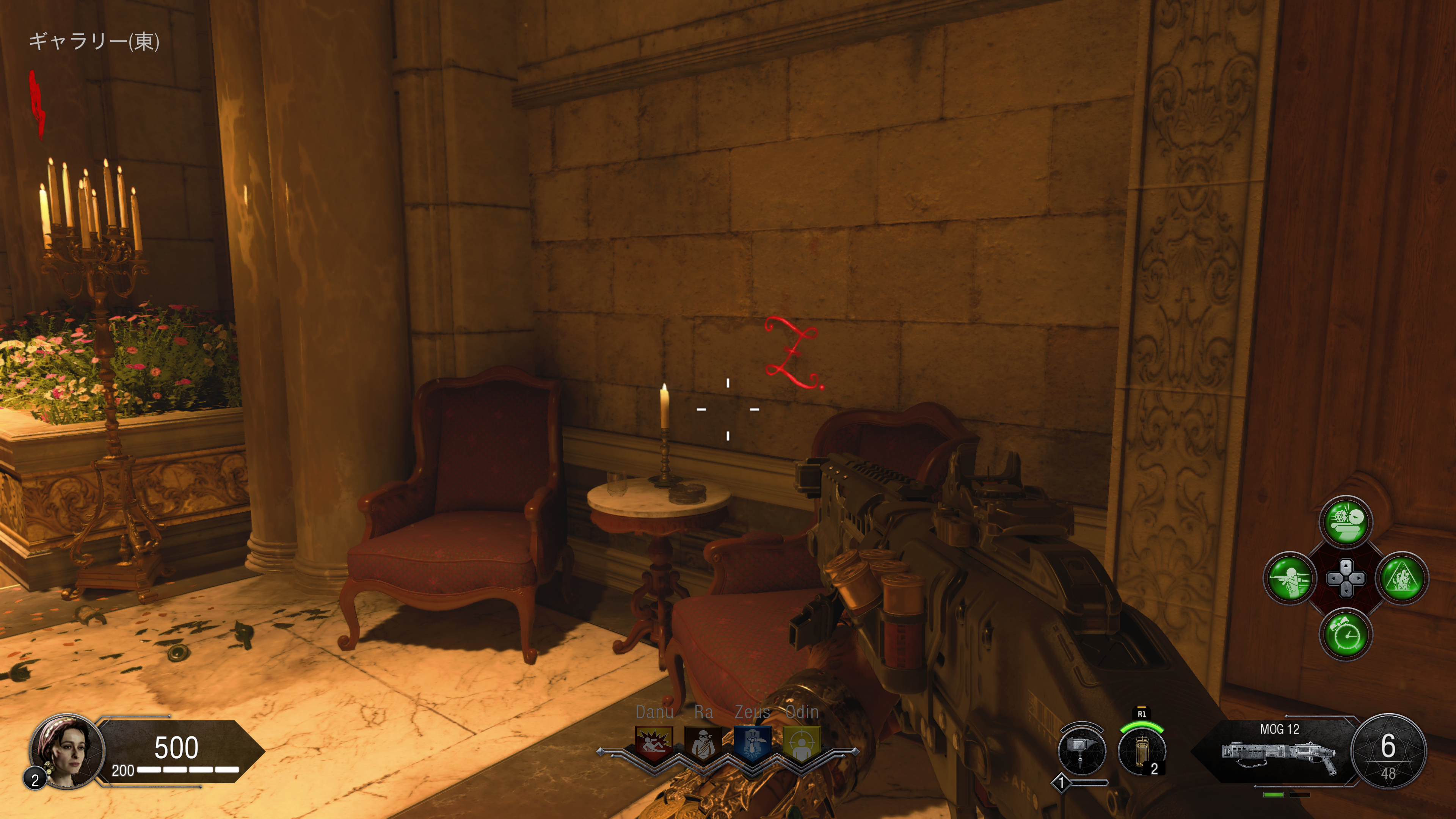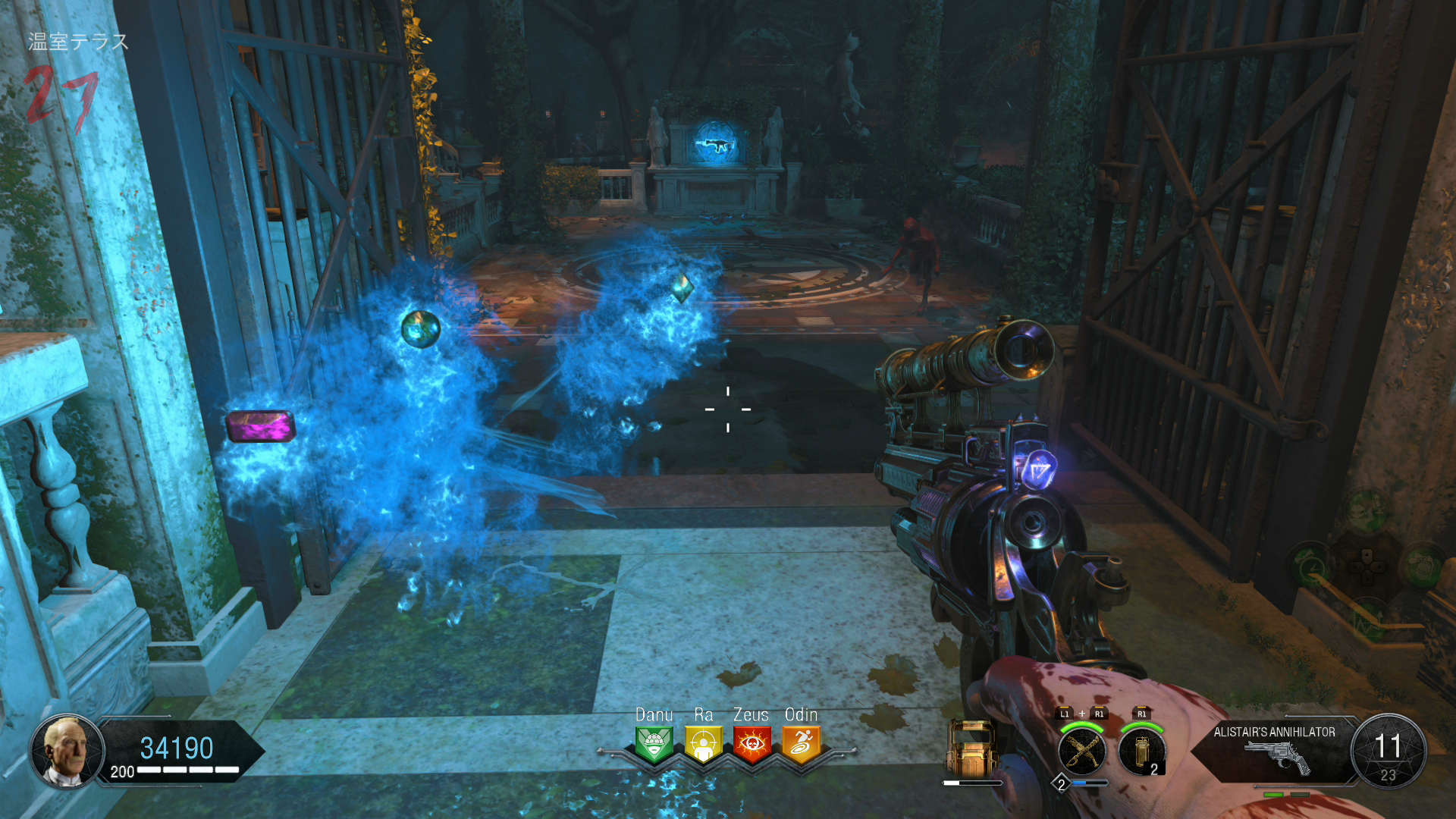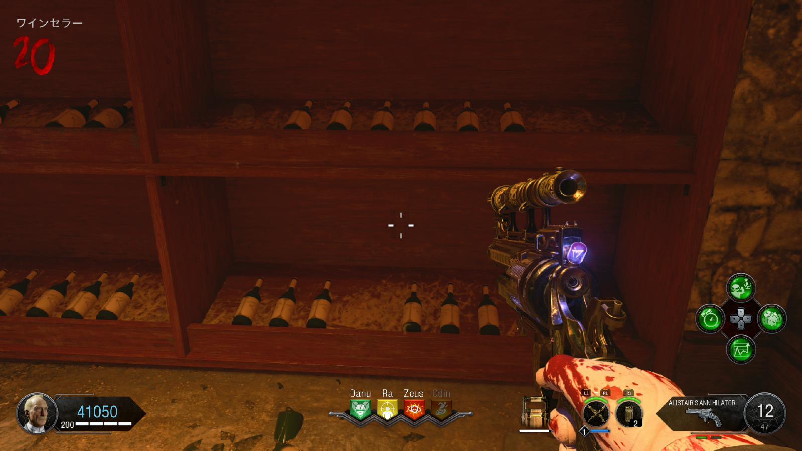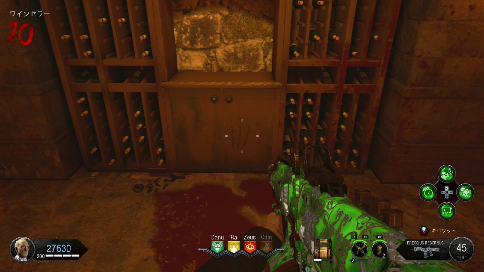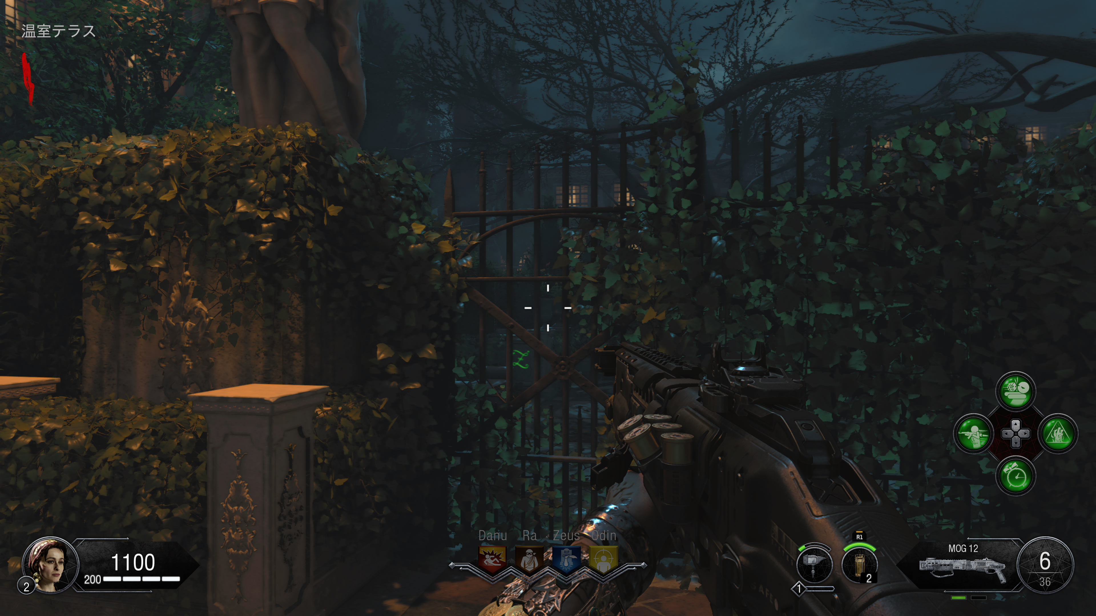メインクエスト †パックアパンチ解放 †大階段でセンチネルの神器を使う。 その後、各部屋に石の入った壺があるので、打撃で破壊。周囲でゾンビを4キルすると石が輝くので、全て行う。候補地7か所。石は3か所 主寝室 ワインセラー(1) ワインセラー(2) 図書室 書斎 トロフィールーム 寝室廊下 石はチャージが完了すると、中を覗き込むことができる。 時計 ビリヤードルーム、メインホール、ダイニングルームに時計があるのでインタラクト。 インタラクトすると地面に紋章が現れるので、その中で一定時間待機。 完了すると音叉が出てくるので拾う。また、クリアでトロフィー「オンザクロック」入手。 PERK 表示されたPERKの像へ移動。 周辺にヴァンパイアが現れるので全員倒す。 完了すると音叉が出てくるので拾う。 人形 2階玄関ホールに人形があるのでインタラクト。幽霊が現れる。 幽霊の周囲に行くと移動するので、近づいては追いかけるを繰り返す。 最終的に墓地まで移動。 完了すると音叉を落とすので拾う。 女性の絵画 流れは人形と一緒。ゴールは温室テラス。 ロープの輪っか 流れは人形と一緒。 少女と老人 流れは人形と一緒。 悪そうな顔の女 流れは人形と一緒。 聖書 書斎の本棚。 流れは人形と一緒。 音叉を三つ入手したら、森のテラスにある玄関の黒い塊に使用。玄関が開くので奥へ進む。 一番奥にPAPがある。 途中、狼男が出現するので注意。 一番奥まで行くとPAPがある。 シルバー弾入手 †まず、6つのパーツを集める。候補地はそれぞれ三か所 ボトル 図書室からメインホールへ抜ける途中の西廊下のソファー ダイニングルームの時計の裏側にある赤いテーブル 燭台 メインホールの壁の前の壺 ビリヤードルームの床 ワインセラー右側の壁のあたり 皿 ワインセラー、テーブルの上 ワインセラー、棚の上 糞 墓地と霊廟のあたり。霊廟から屋敷側を見て正面の壁の左端 墓地と霊廟の階段の近くの木の後ろ 木炭 ビリヤード室の暖炉 メインホールの暖炉 硫黄 その後、ワインセラーの組立台で銀を作る。 ALISTER'S FOLLY †図書室に暗号を入力できるパネルがある。 マップ各地に正解の記号が点在しているので、それを確認して入力する。 青のシンボルは墓~霊廟あたり。候補地4箇所。 緑のシンボルは庭園。候補地4箇所。 黄色のシンボルは森のテラス。候補地4箇所。 赤のシンボルは、主寝室、西ギャラリー、ワインセラー、ダイニングルーム。 どれもMAP外やバリケードの外にある。 正解のコードを入力すると銃が取れるようになる。 一度入手すると、M.BOXでも出現するようになる。 バリスティックシールド †各地にある盾のパーツを組立台で組み立てる。部品はそれぞれ3箇所にランダムでスポーン シールドプレート メーター 喫煙室で組み立てる。 Chaos Theory †狼男をシルバー弾で倒すと、狼人間カオス素材を落とすので入手。 その後、温室研究所でプリママテリア装置を起動。 暫く待つと装置の側面にプリママテリアが出てくるので入手。 図書室へ行き、バリスティックシールドで左側の本棚を殴ると、隠し空間が現れて、銃のパーツが入手できる。 再度温室研究所へ向かい、ALISTER'S FOLLY を Chaos Theory 組立台でパワーアップすることができる。 R2でチャージショット発射可能。 Alistair's Annihilator †霊廟の正面、消えているランプの前あたりで、Chaos Theoryのチャージショットでヴァンパイアを倒す。黄色い何かに当ててる間にさらに竜巻を当てるといいのかもしれない。 そのうち、ヴァンパイアが胆汁を落とす。 何個か胆汁を拾っていると、霊廟正面の墓が赤く光る。 インタラクトすると、赤いヴァンパイアが現れるので倒す。 すると、吸血鬼カオス素材が手に入るので入手。 これを温室研究所のプリママテリアにかけるとパーツが一つ入手できる。 次に、霊廟の正面、1ラウンドごとに、ランプが一つ追加で点灯する。 これをChaos Theoryで撃つと、他のランプが点灯する。一定時間以内にランプを撃ち続けていると、3箇所目くらいで蝙蝠が空に向かって飛び立つ。それをChaos Theoryで撃ち落とすと蝙蝠カオス素材が入手できる。 これを温室研究所のプリママテリアにかけるとパーツが一つ入手できる。 最後に森で、土に埋まってキノコが生えている骨の周囲にいく。 この骨の上で、チャージショットをゾンビを直接当て、黄色い何かが発動すると、地面を掘ってパーツが出現する。三か所のうち正解は一か所。 これを入手。 三つのパーツを集めた後、温室研究所の Alistair's Annihilator組立台で、Chaos TheoryをAlistair's Annihilatorに加工できるようになる。 結晶からチャレンジを受ける †PAP解放の際にチャージした結晶を再度インタラクトすると、イラストが見える。それに対応したクエストをこなす必要がある。 騎士 †ALISTER'S ANNIHILATOR とシールド必須。 図書室のファイアゲートの罠を作成する。 ファイアゲートを起動するためのアイテムはランダムで各地に散らばってる。 暖炉にランダムに決まる順番に