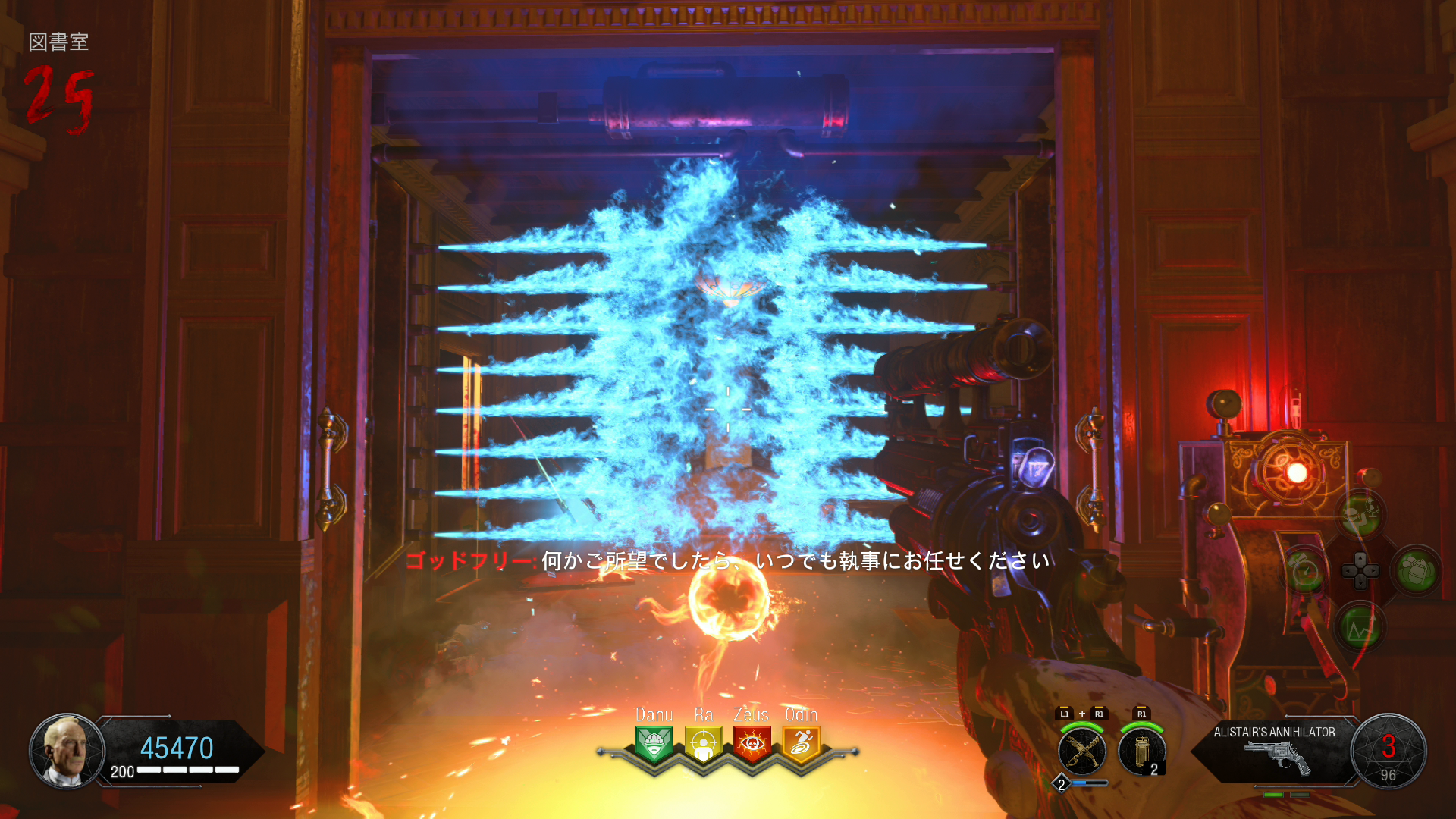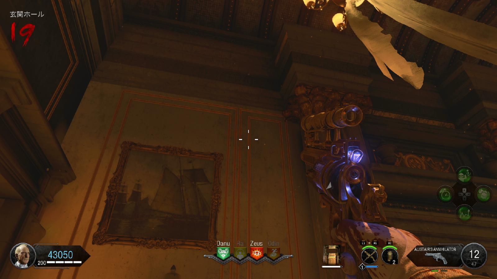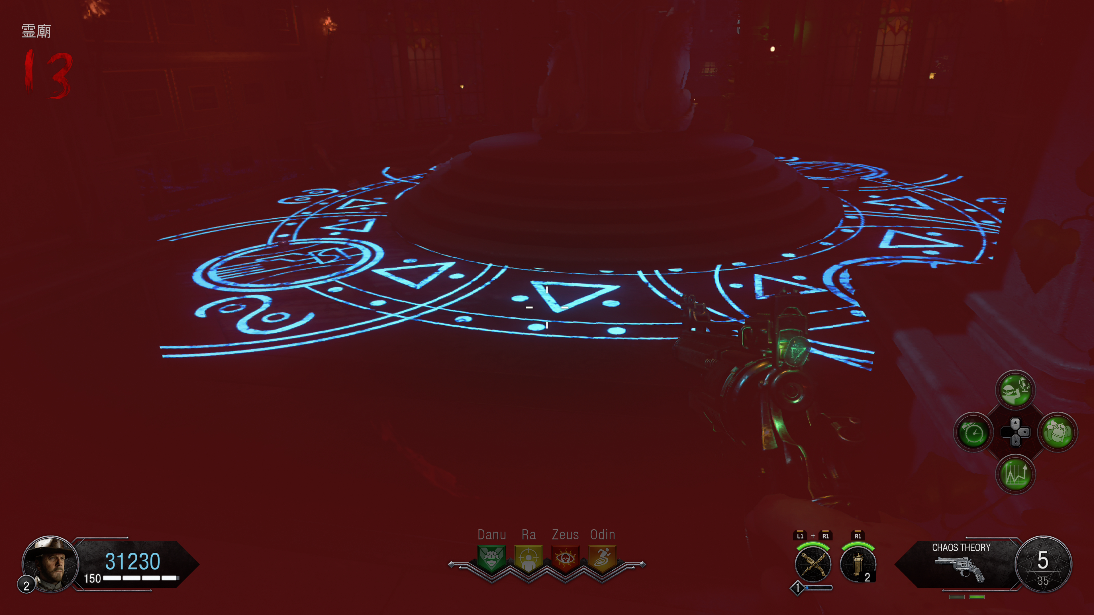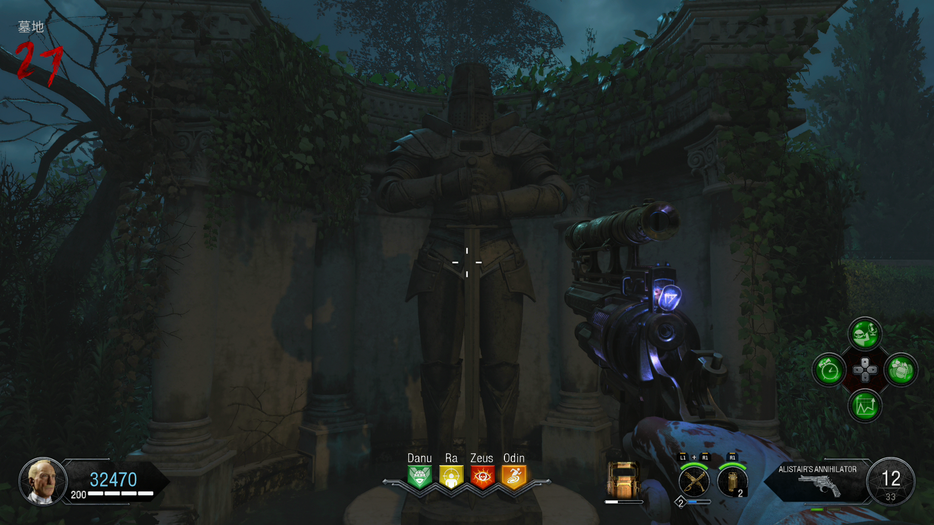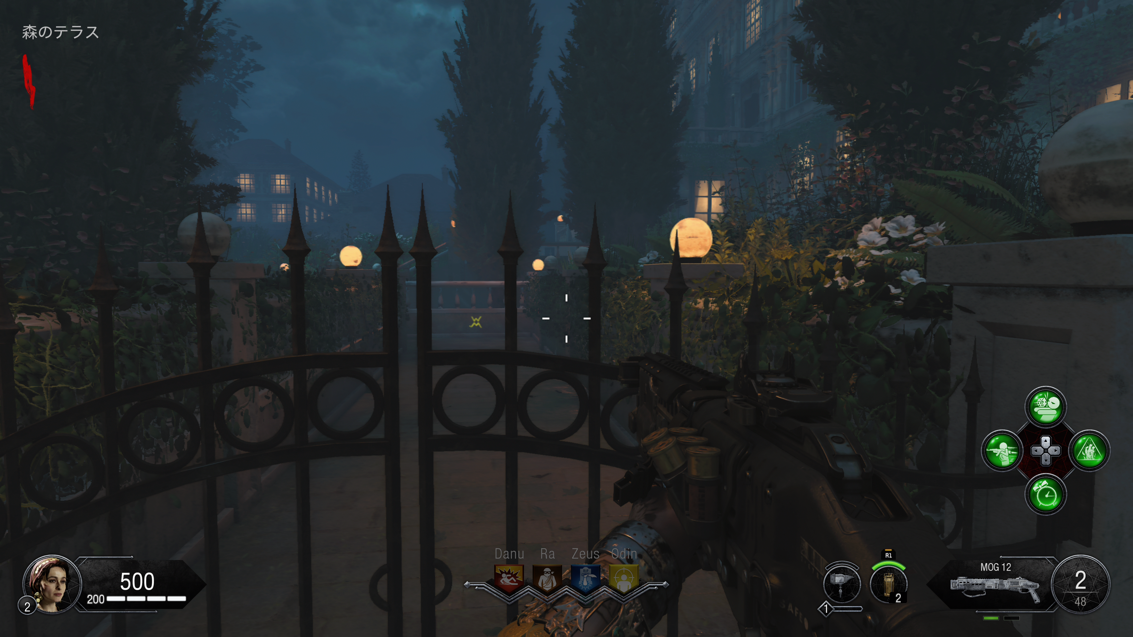 メインクエスト †パックアパンチ解放 †大階段でセンチネルの神器を使う。 その後、各部屋に石の入った壺があるので、打撃で破壊。周囲でゾンビを4キルすると石が輝くので、全て行う。候補地7か所。石は3か所 主寝室 ワインセラー(1) ワインセラー(2) 図書室 書斎 トロフィールーム 寝室廊下 石はチャージが完了すると、中を覗き込むことができる。 時計 ビリヤードルーム、メインホール、ダイニングルームに時計があるのでインタラクト。 インタラクトすると地面に紋章が現れるので、その中で一定時間待機。 完了すると音叉が出てくるので拾う。また、クリアでトロフィー「オンザクロック」入手。 PERK 表示されたPERKの像へ移動。 周辺にヴァンパイアが現れるので全員倒す。 完了すると音叉が出てくるので拾う。 人形 2階玄関ホールに人形があるのでインタラクト。幽霊が現れる。 幽霊の周囲に行くと移動するので、近づいては追いかけるを繰り返す。 最終的に墓地まで移動。 完了すると音叉を落とすので拾う。 女性の絵画 流れは人形と一緒。ゴールは温室テラス。 ロープの輪っか 流れは人形と一緒。 少女と老人 流れは人形と一緒。 悪そうな顔の女 流れは人形と一緒。 聖書 書斎の本棚。 流れは人形と一緒。 音叉を三つ入手したら、森のテラスにある玄関の黒い塊に使用。玄関が開くので奥へ進む。 一番奥にPAPがある。 途中、狼男が出現するので注意。 一番奥まで行くとPAPがある。 シルバー弾入手 †まず、6つのパーツを集める。候補地はそれぞれ三か所 ボトル 図書室からメインホールへ抜ける途中の西廊下のソファー ダイニングルームの時計の裏側にある赤いテーブル 燭台 メインホールの壁の前の壺 ビリヤードルームの床 ワインセラー右側の壁のあたり 皿 ワインセラー、テーブルの上 ワインセラー、棚の上 糞 墓地と霊廟のあたり。霊廟から屋敷側を見て正面の壁の左端 墓地と霊廟の階段の近くの木の後ろ 木炭 ビリヤード室の暖炉 メインホールの暖炉 硫黄 その後、ワインセラーの組立台で銀を作る。 ALISTER'S FOLLY †図書室に暗号を入力できるパネルがある。 マップ各地に正解の記号が点在しているので、それを確認して入力する。 青のシンボルは墓~霊廟あたり。候補地4箇所。 緑のシンボルは庭園。候補地4箇所。 黄色のシンボルは森のテラス。候補地4箇所。 赤のシンボルは、主寝室、西ギャラリー、ワインセラー、ダイニングルーム。 どれもMAP外やバリケードの外にある。 正解のコードを入力すると銃が取れるようになる。 一度入手すると、M.BOXでも出現するようになる。 バリスティックシールド †各地にある盾のパーツを組立台で組み立てる。部品はそれぞれ3箇所にランダムでスポーン シールドプレート メーター 喫煙室で組み立てる。 Chaos Theory †狼男をシルバー弾で倒すと、狼人間カオス素材を落とすので入手。 その後、温室研究所でプリママテリア装置を起動。 暫く待つと装置の側面にプリママテリアが出てくるので入手。 図書室へ行き、バリスティックシールドで左側の本棚を殴ると、隠し空間が現れて、銃のパーツが入手できる。 再度温室研究所へ向かい、ALISTER'S FOLLY を Chaos Theory 組立台でパワーアップすることができる。 R2でチャージショット発射可能。 Alistair's Annihilator †霊廟の正面、消えているランプの前あたりで、Chaos Theoryのチャージショットでヴァンパイアを倒す。黄色い何かに当ててる間にさらに竜巻を当てるといいのかもしれない。 そのうち、ヴァンパイアが胆汁を落とす。 何個か胆汁を拾っていると、霊廟正面の墓が赤く光る。 インタラクトすると、赤いヴァンパイアが現れるので倒す。 すると、吸血鬼カオス素材が手に入るので入手。 これを温室研究所のプリママテリアにかけるとパーツが一つ入手できる。 次に、霊廟の正面、1ラウンドごとに、ランプが一つ追加で点灯する。 これをChaos Theoryで撃つと、他のランプが点灯する。一定時間以内にランプを撃ち続けていると、3箇所目くらいで蝙蝠が空に向かって飛び立つ。それをChaos Theoryで撃ち落とすと蝙蝠カオス素材が入手できる。 これを温室研究所のプリママテリアにかけるとパーツが一つ入手できる。 最後に森で、土に埋まってキノコが生えている骨の周囲にいく。 この骨の上で、チャージショットをゾンビを直接当て、黄色い何かが発動すると、地面を掘ってパーツが出現する。三か所のうち正解は一か所。 これを入手。 三つのパーツを集めた後、温室研究所の Alistair's Annihilator組立台で、Chaos TheoryをAlistair's Annihilatorに加工できるようになる。 結晶からチャレンジを受ける †PAP解放の際にチャージした結晶を再度インタラクトすると、イラストが見える。それに対応したクエストをこなす必要がある。 騎士 †ALISTER'S ANNIHILATOR とシールド必須。 図書室のファイアゲートの罠を作成する。 ファイアゲートを起動するためのアイテムはランダムで各地に散らばってる。 暖炉にランダムに決まる順番に