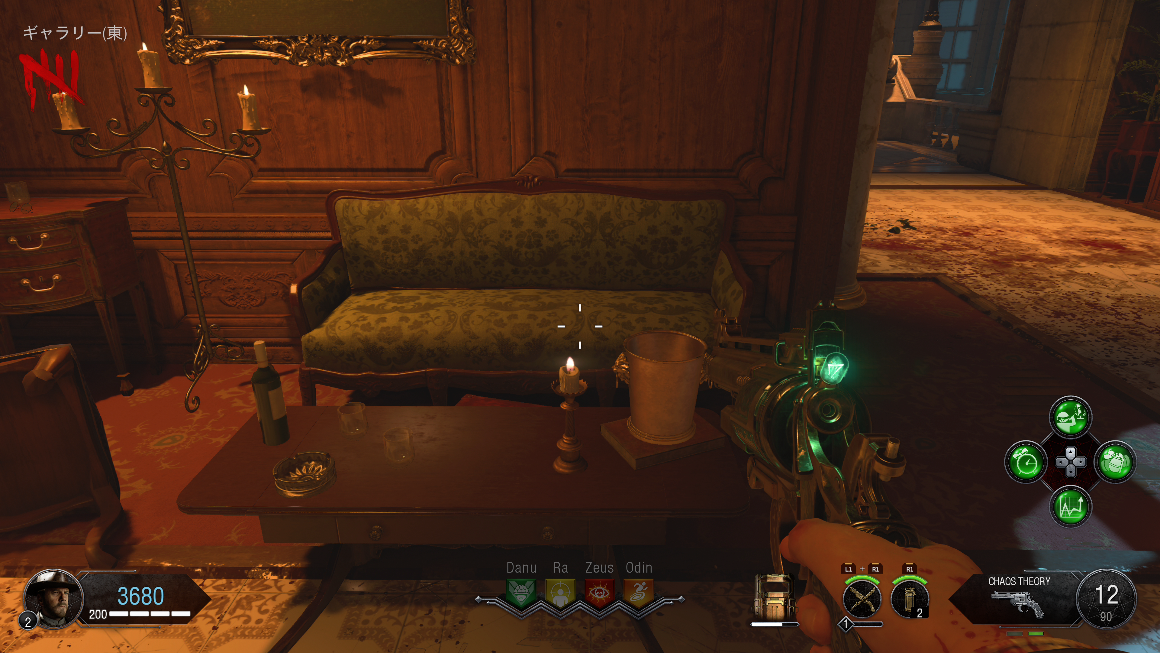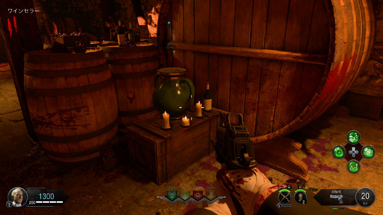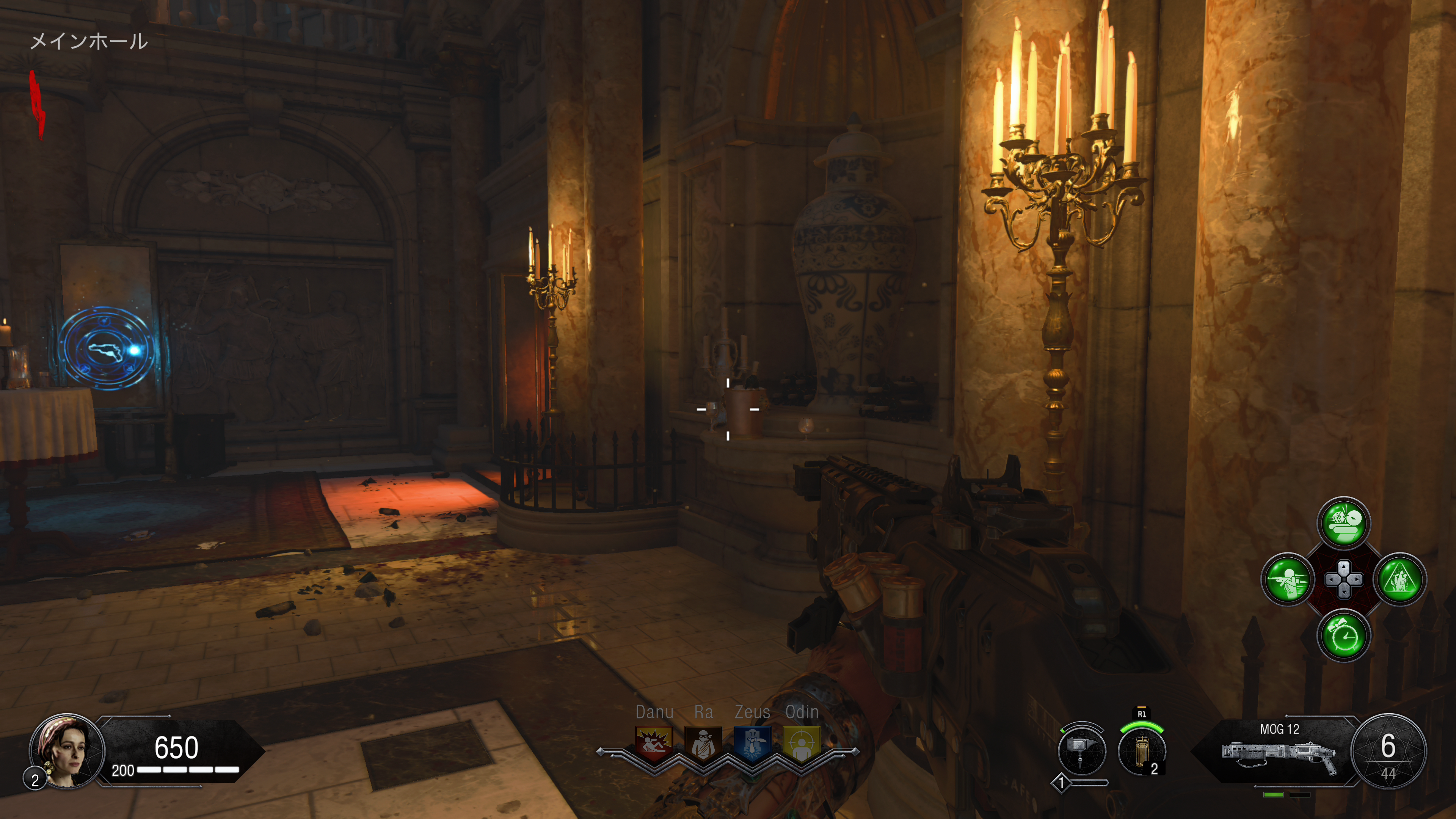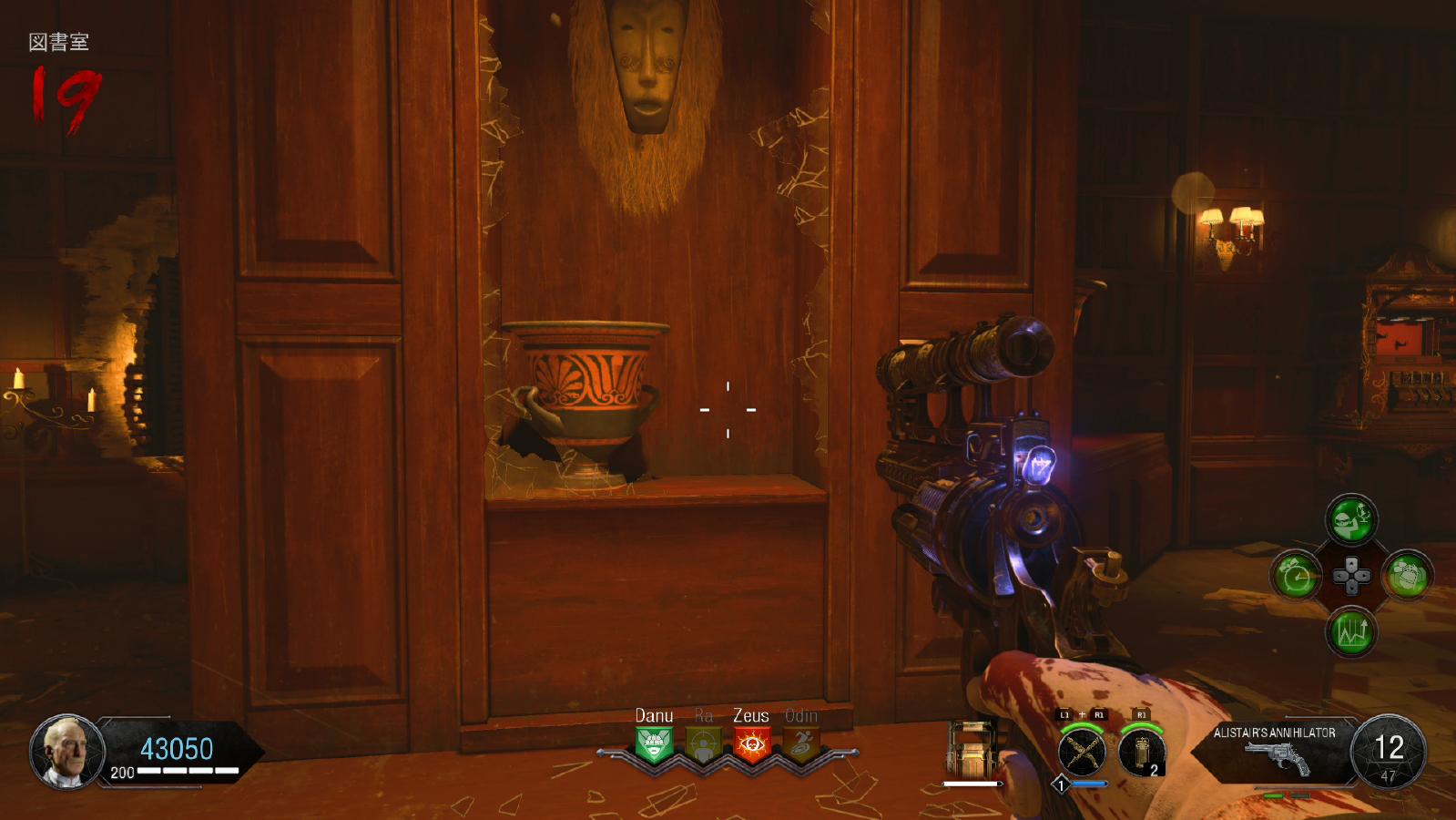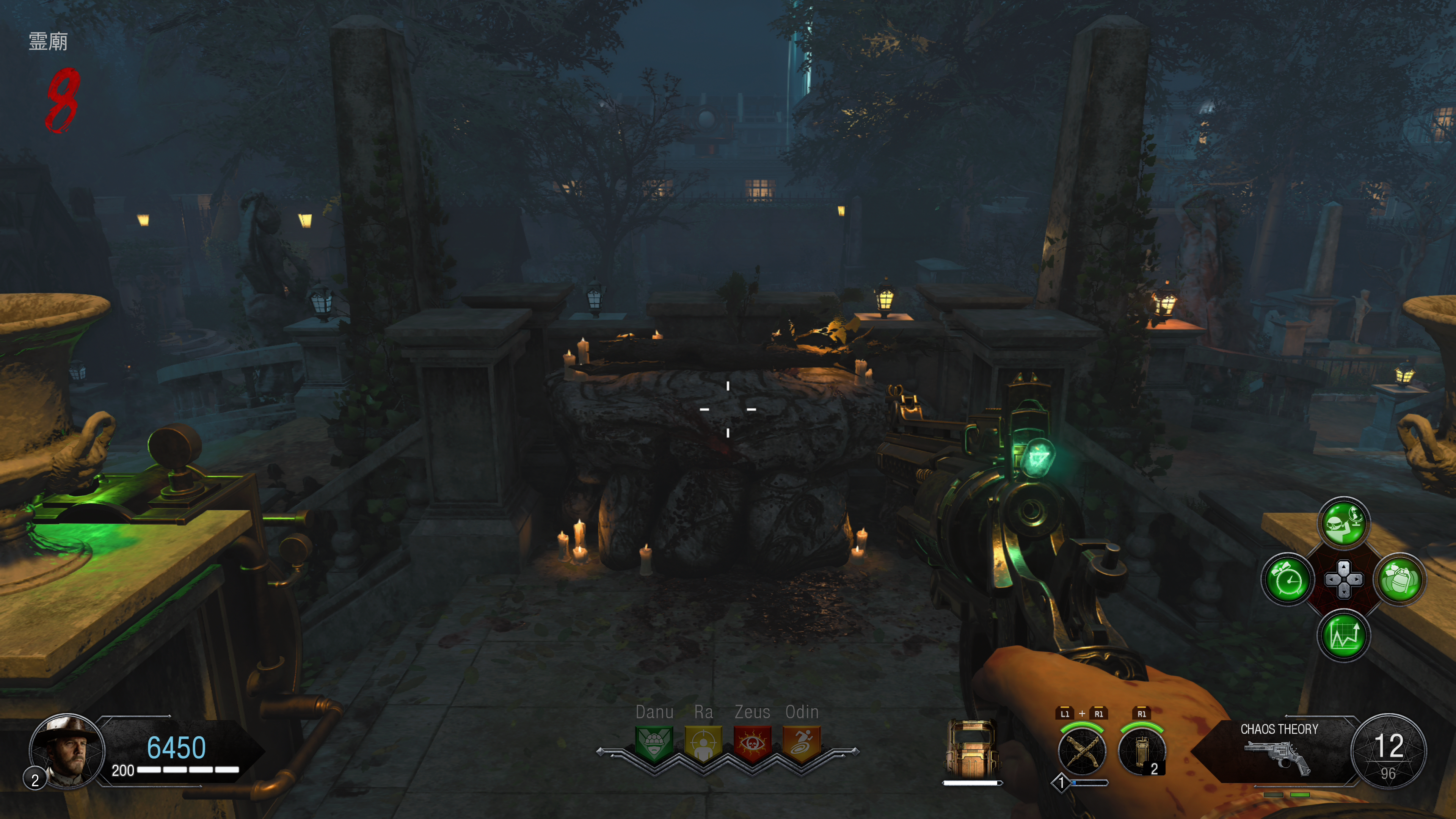 メインクエスト †パックアパンチ解放 †大階段でセンチネルの神器を使う。 その後、各部屋に石の入った壺があるので、打撃で破壊。周囲でゾンビを4キルすると石が輝くので、全て行う。候補地7か所。石は3か所 主寝室 ワインセラー(1) ワインセラー(2) 図書室 書斎 トロフィールーム 寝室廊下 石はチャージが完了すると、中を覗き込むことができる。 時計 ビリヤードルーム、メインホール、ダイニングルームに時計があるのでインタラクト。 インタラクトすると地面に紋章が現れるので、その中で一定時間待機。 完了すると音叉が出てくるので拾う。また、クリアでトロフィー「オンザクロック」入手。 PERK 表示されたPERKの像へ移動。 周辺にヴァンパイアが現れるので全員倒す。 完了すると音叉が出てくるので拾う。 人形 2階玄関ホールに人形があるのでインタラクト。幽霊が現れる。 幽霊の周囲に行くと移動するので、近づいては追いかけるを繰り返す。 最終的に墓地まで移動。 完了すると音叉を落とすので拾う。 女性の絵画 流れは人形と一緒。ゴールは温室テラス。 ロープの輪っか 流れは人形と一緒。 少女と老人 流れは人形と一緒。 悪そうな顔の女 流れは人形と一緒。 聖書 書斎の本棚。 流れは人形と一緒。 音叉を三つ入手したら、森のテラスにある玄関の黒い塊に使用。玄関が開くので奥へ進む。 一番奥にPAPがある。 途中、狼男が出現するので注意。 一番奥まで行くとPAPがある。 シルバー弾入手 †まず、6つのパーツを集める。候補地はそれぞれ三か所 ボトル 図書室からメインホールへ抜ける途中の西廊下のソファー ダイニングルームの時計の裏側にある赤いテーブル 燭台 メインホールの壁の前の壺 ビリヤードルームの床 ワインセラー右側の壁のあたり 皿 ワインセラー、テーブルの上 ワインセラー、棚の上 糞 墓地と霊廟のあたり。霊廟から屋敷側を見て正面の壁の左端 墓地と霊廟の階段の近くの木の後ろ 木炭 ビリヤード室の暖炉 メインホールの暖炉 硫黄 その後、ワインセラーの組立台で銀を作る。 ALISTER'S FOLLY †図書室に暗号を入力できるパネルがある。 マップ各地に正解の記号が点在しているので、それを確認して入力する。 青のシンボルは墓~霊廟あたり。候補地4箇所。 緑のシンボルは庭園。候補地4箇所。 黄色のシンボルは森のテラス。候補地4箇所。 赤のシンボルは、主寝室、西ギャラリー、ワインセラー、ダイニングルーム。 どれもMAP外やバリケードの外にある。 正解のコードを入力すると銃が取れるようになる。 一度入手すると、M.BOXでも出現するようになる。 バリスティックシールド †各地にある盾のパーツを組立台で組み立てる。部品はそれぞれ3箇所にランダムでスポーン シールドプレート メーター 喫煙室で組み立てる。 Chaos Theory †狼男をシルバー弾で倒すと、狼人間カオス素材を落とすので入手。 その後、温室研究所でプリママテリア装置を起動。 暫く待つと装置の側面にプリママテリアが出てくるので入手。 図書室へ行き、バリスティックシールドで左側の本棚を殴ると、隠し空間が現れて、銃のパーツが入手できる。 再度温室研究所へ向かい、ALISTER'S FOLLY を Chaos Theory 組立台でパワーアップすることができる。 R2でチャージショット発射可能。 Alistair's Annihilator †霊廟の正面、消えているランプの前あたりで、Chaos Theoryのチャージショットでヴァンパイアを倒す。黄色い何かに当ててる間にさらに竜巻を当てるといいのかもしれない。 そのうち、ヴァンパイアが胆汁を落とす。 何個か胆汁を拾っていると、霊廟正面の墓が赤く光る。 インタラクトすると、赤いヴァンパイアが現れるので倒す。 すると、吸血鬼カオス素材が手に入るので入手。 これを温室研究所のプリママテリアにかけるとパーツが一つ入手できる。 次に、霊廟の正面、1ラウンドごとに、ランプが一つ追加で点灯する。 これをChaos Theoryで撃つと、他のランプが点灯する。一定時間以内にランプを撃ち続けていると、3箇所目くらいで蝙蝠が空に向かって飛び立つ。それをChaos Theoryで撃ち落とすと蝙蝠カオス素材が入手できる。 これを温室研究所のプリママテリアにかけるとパーツが一つ入手できる。 最後に森で、土に埋まってキノコが生えている骨の周囲にいく。 この骨の上で、チャージショットをゾンビを直接当て、黄色い何かが発動すると、地面を掘ってパーツが出現する。三か所のうち正解は一か所。 これを入手。 三つのパーツを集めた後、温室研究所の Alistair's Annihilator組立台で、Chaos TheoryをAlistair's Annihilatorに加工できるようになる。 結晶からチャレンジを受ける †PAP解放の際にチャージした結晶を再度インタラクトすると、イラストが見える。それに対応したクエストをこなす必要がある。 騎士 †ALISTER'S ANNIHILATOR とシールド必須。 図書室のファイアゲートの罠を作成する。 ファイアゲートを起動するためのアイテムはランダムで各地に散らばってる。 暖炉にランダムに決まる順番に