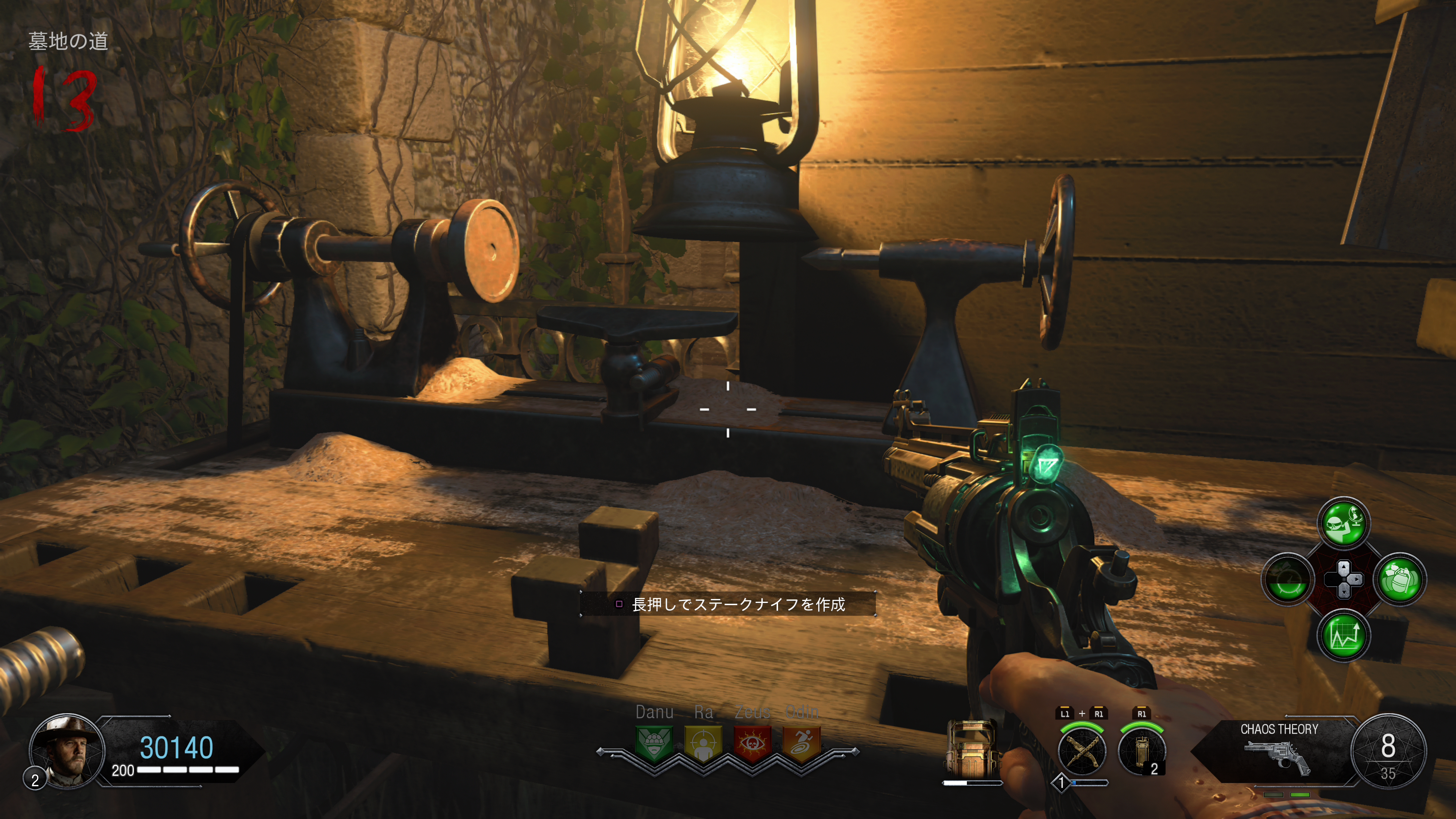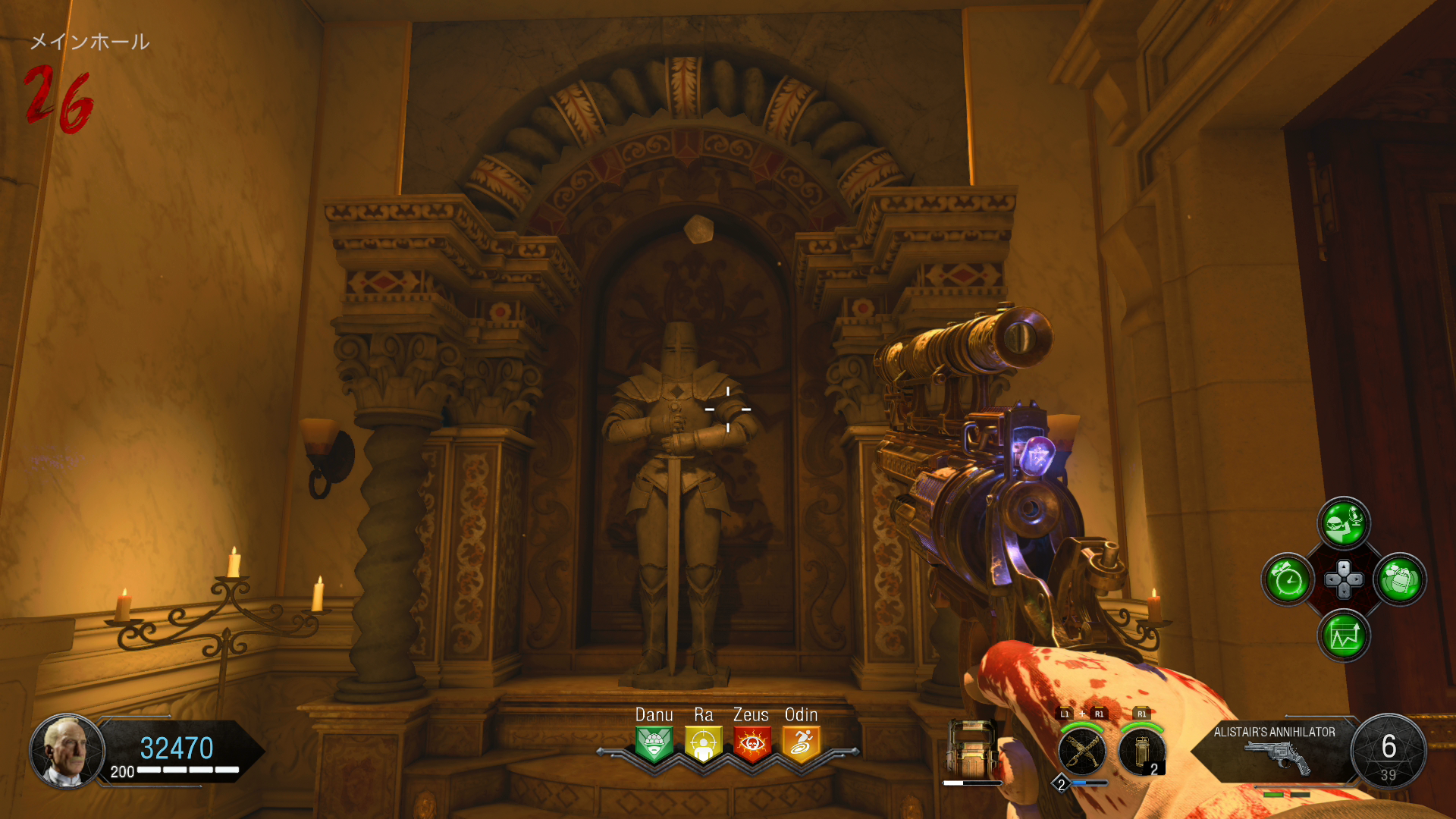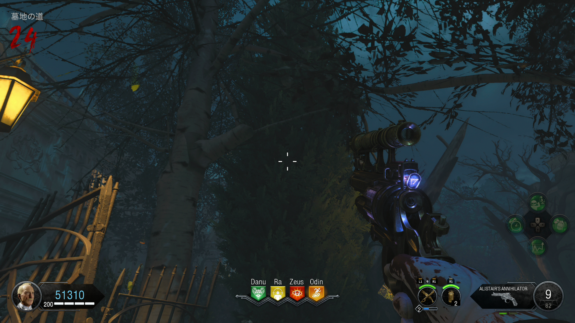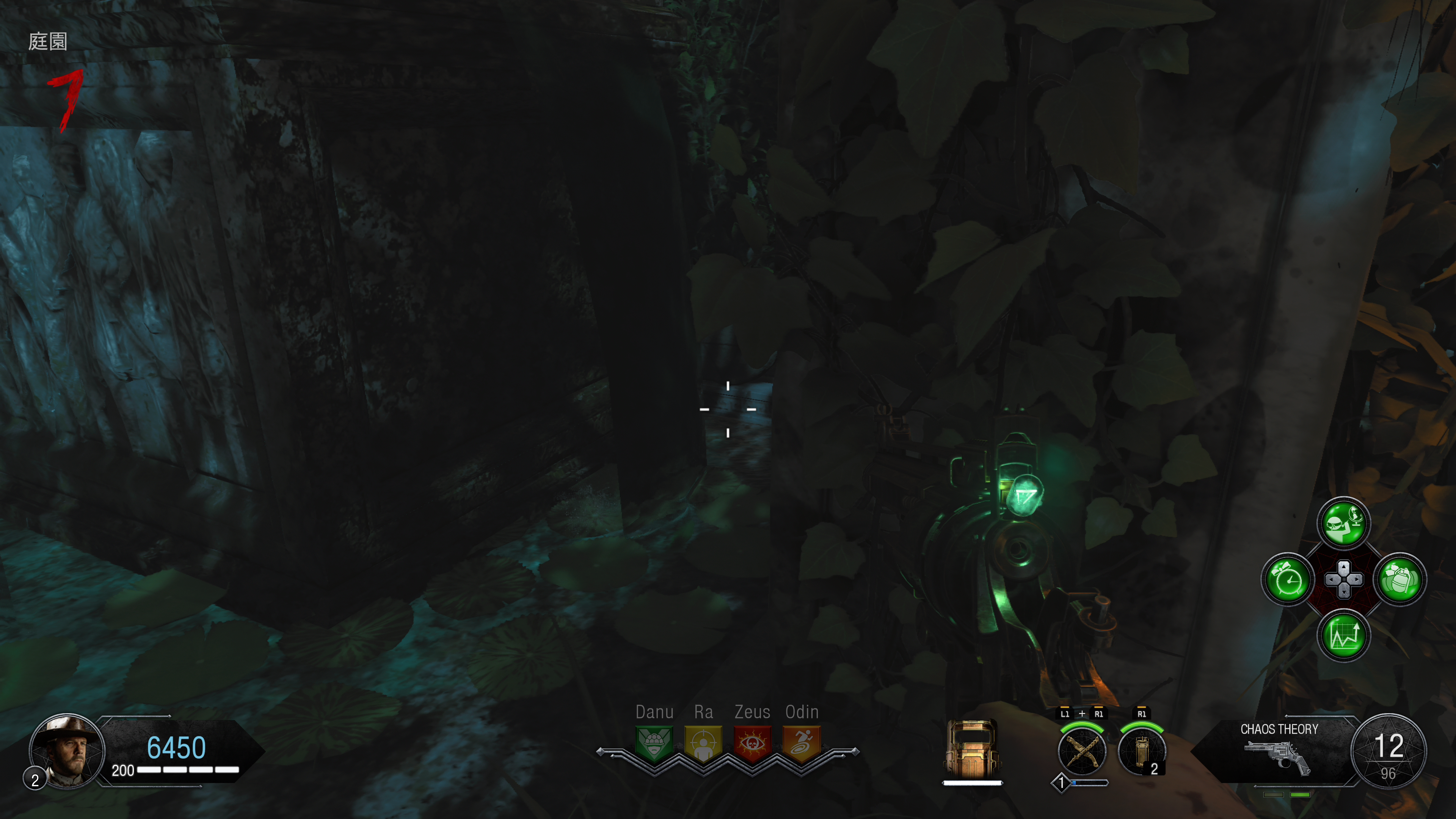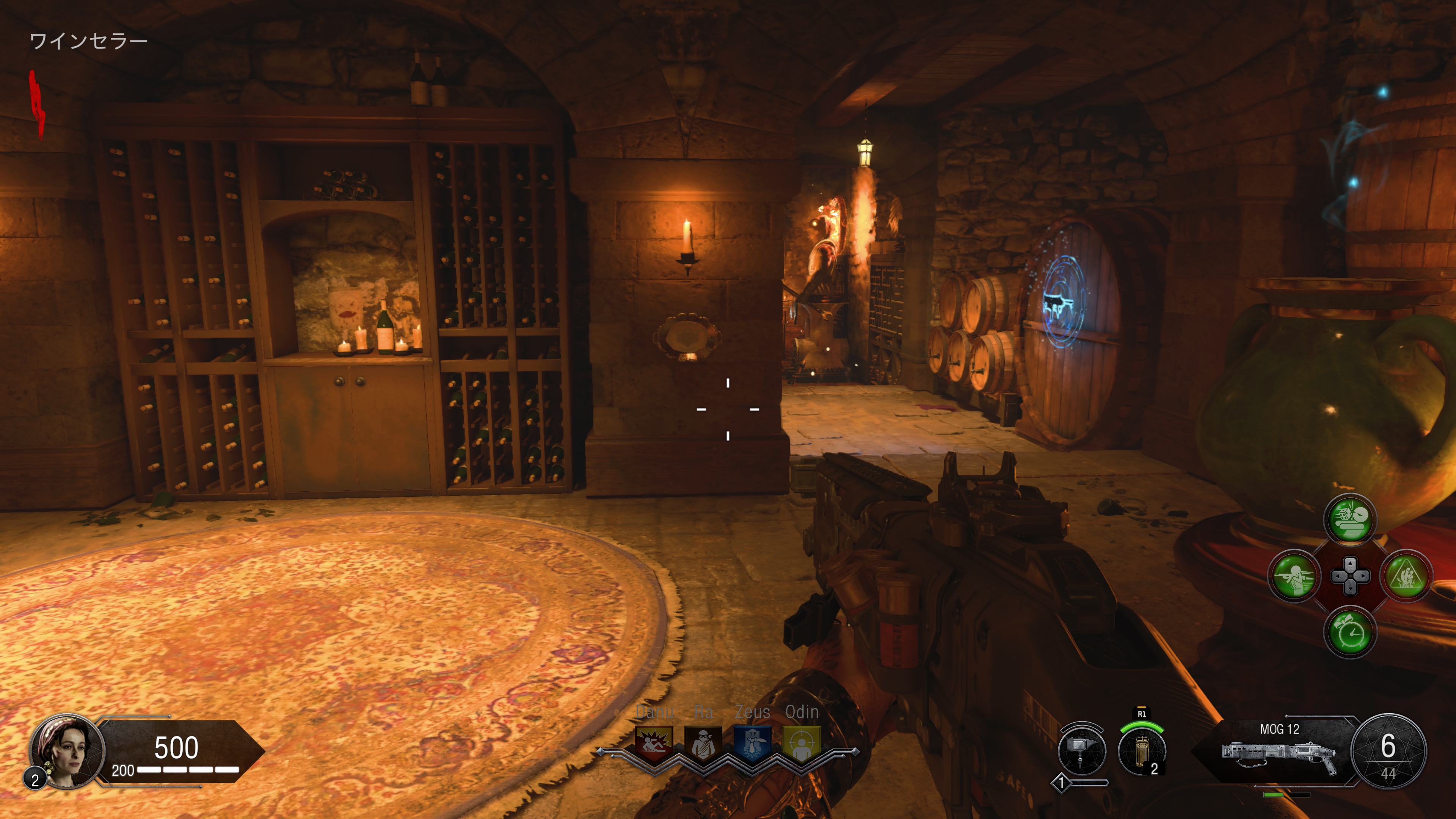 メインクエスト †パックアパンチ解放 †大階段でセンチネルの神器を使う。 その後、各部屋に石の入った壺があるので、打撃で破壊。周囲でゾンビを4キルすると石が輝くので、全て行う。候補地7か所。石は3か所 主寝室 ワインセラー(1) ワインセラー(2) 図書室 書斎 トロフィールーム 寝室廊下 石はチャージが完了すると、中を覗き込むことができる。 時計 ビリヤードルーム、メインホール、ダイニングルームに時計があるのでインタラクト。 インタラクトすると地面に紋章が現れるので、その中で一定時間待機。 完了すると音叉が出てくるので拾う。また、クリアでトロフィー「オンザクロック」入手。 PERK 表示されたPERKの像へ移動。 周辺にヴァンパイアが現れるので全員倒す。 完了すると音叉が出てくるので拾う。 人形 2階玄関ホールに人形があるのでインタラクト。幽霊が現れる。 幽霊の周囲に行くと移動するので、近づいては追いかけるを繰り返す。 最終的に墓地まで移動。 完了すると音叉を落とすので拾う。 女性の絵画 流れは人形と一緒。ゴールは温室テラス。 ロープの輪っか 流れは人形と一緒。 少女と老人 流れは人形と一緒。 悪そうな顔の女 流れは人形と一緒。 聖書 書斎の本棚。 流れは人形と一緒。 音叉を三つ入手したら、森のテラスにある玄関の黒い塊に使用。玄関が開くので奥へ進む。 一番奥にPAPがある。 途中、狼男が出現するので注意。 一番奥まで行くとPAPがある。 シルバー弾入手 †まず、6つのパーツを集める。候補地はそれぞれ三か所 ボトル 図書室からメインホールへ抜ける途中の西廊下のソファー ダイニングルームの時計の裏側にある赤いテーブル 燭台 メインホールの壁の前の壺 ビリヤードルームの床 ワインセラー右側の壁のあたり 皿 ワインセラー、テーブルの上 ワインセラー、棚の上 糞 墓地と霊廟のあたり。霊廟から屋敷側を見て正面の壁の左端 墓地と霊廟の階段の近くの木の後ろ 木炭 ビリヤード室の暖炉 メインホールの暖炉 硫黄 その後、ワインセラーの組立台で銀を作る。 ALISTER'S FOLLY †図書室に暗号を入力できるパネルがある。 マップ各地に正解の記号が点在しているので、それを確認して入力する。 青のシンボルは墓~霊廟あたり。候補地4箇所。 緑のシンボルは庭園。候補地4箇所。 黄色のシンボルは森のテラス。候補地4箇所。 赤のシンボルは、主寝室、西ギャラリー、ワインセラー、ダイニングルーム。 どれもMAP外やバリケードの外にある。 正解のコードを入力すると銃が取れるようになる。 一度入手すると、M.BOXでも出現するようになる。 バリスティックシールド †各地にある盾のパーツを組立台で組み立てる。部品はそれぞれ3箇所にランダムでスポーン シールドプレート メーター 喫煙室で組み立てる。 Chaos Theory †狼男をシルバー弾で倒すと、狼人間カオス素材を落とすので入手。 その後、温室研究所でプリママテリア装置を起動。 暫く待つと装置の側面にプリママテリアが出てくるので入手。 図書室へ行き、バリスティックシールドで左側の本棚を殴ると、隠し空間が現れて、銃のパーツが入手できる。 再度温室研究所へ向かい、ALISTER'S FOLLY を Chaos Theory 組立台でパワーアップすることができる。 R2でチャージショット発射可能。 Alistair's Annihilator †霊廟の正面、消えているランプの前あたりで、Chaos Theoryのチャージショットでヴァンパイアを倒す。黄色い何かに当ててる間にさらに竜巻を当てるといいのかもしれない。 そのうち、ヴァンパイアが胆汁を落とす。 何個か胆汁を拾っていると、霊廟正面の墓が赤く光る。 インタラクトすると、赤いヴァンパイアが現れるので倒す。 すると、吸血鬼カオス素材が手に入るので入手。 これを温室研究所のプリママテリアにかけるとパーツが一つ入手できる。 次に、霊廟の正面、1ラウンドごとに、ランプが一つ追加で点灯する。 これをChaos Theoryで撃つと、他のランプが点灯する。一定時間以内にランプを撃ち続けていると、3箇所目くらいで蝙蝠が空に向かって飛び立つ。それをChaos Theoryで撃ち落とすと蝙蝠カオス素材が入手できる。 これを温室研究所のプリママテリアにかけるとパーツが一つ入手できる。 最後に森で、土に埋まってキノコが生えている骨の周囲にいく。 この骨の上で、チャージショットをゾンビを直接当て、黄色い何かが発動すると、地面を掘ってパーツが出現する。三か所のうち正解は一か所。 これを入手。 三つのパーツを集めた後、温室研究所の Alistair's Annihilator組立台で、Chaos TheoryをAlistair's Annihilatorに加工できるようになる。 結晶からチャレンジを受ける †PAP解放の際にチャージした結晶を再度インタラクトすると、イラストが見える。それに対応したクエストをこなす必要がある。 騎士 †ALISTER'S ANNIHILATOR とシールド必須。 図書室のファイアゲートの罠を作成する。 ファイアゲートを起動するためのアイテムはランダムで各地に散らばってる。 暖炉にランダムに決まる順番に