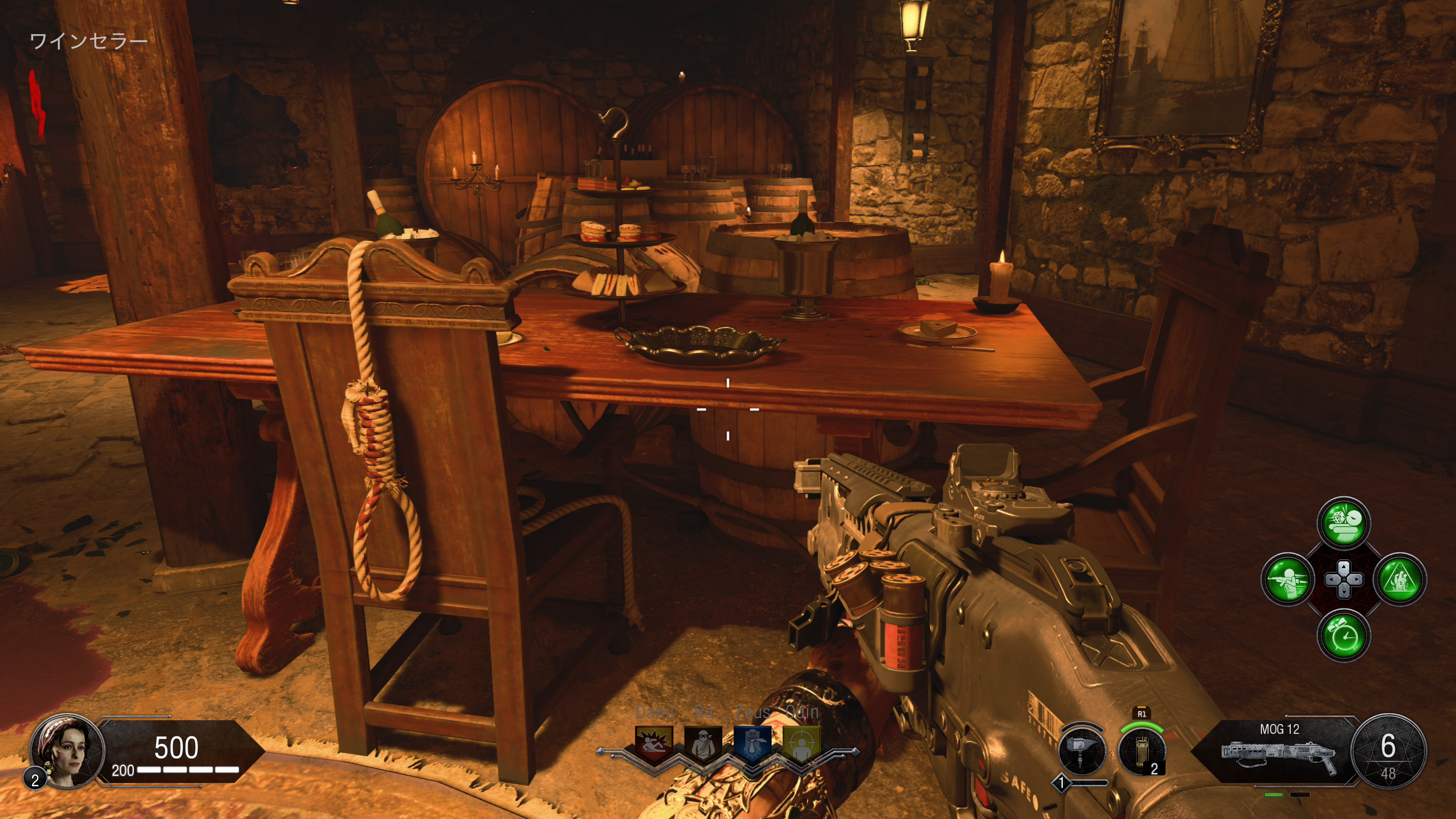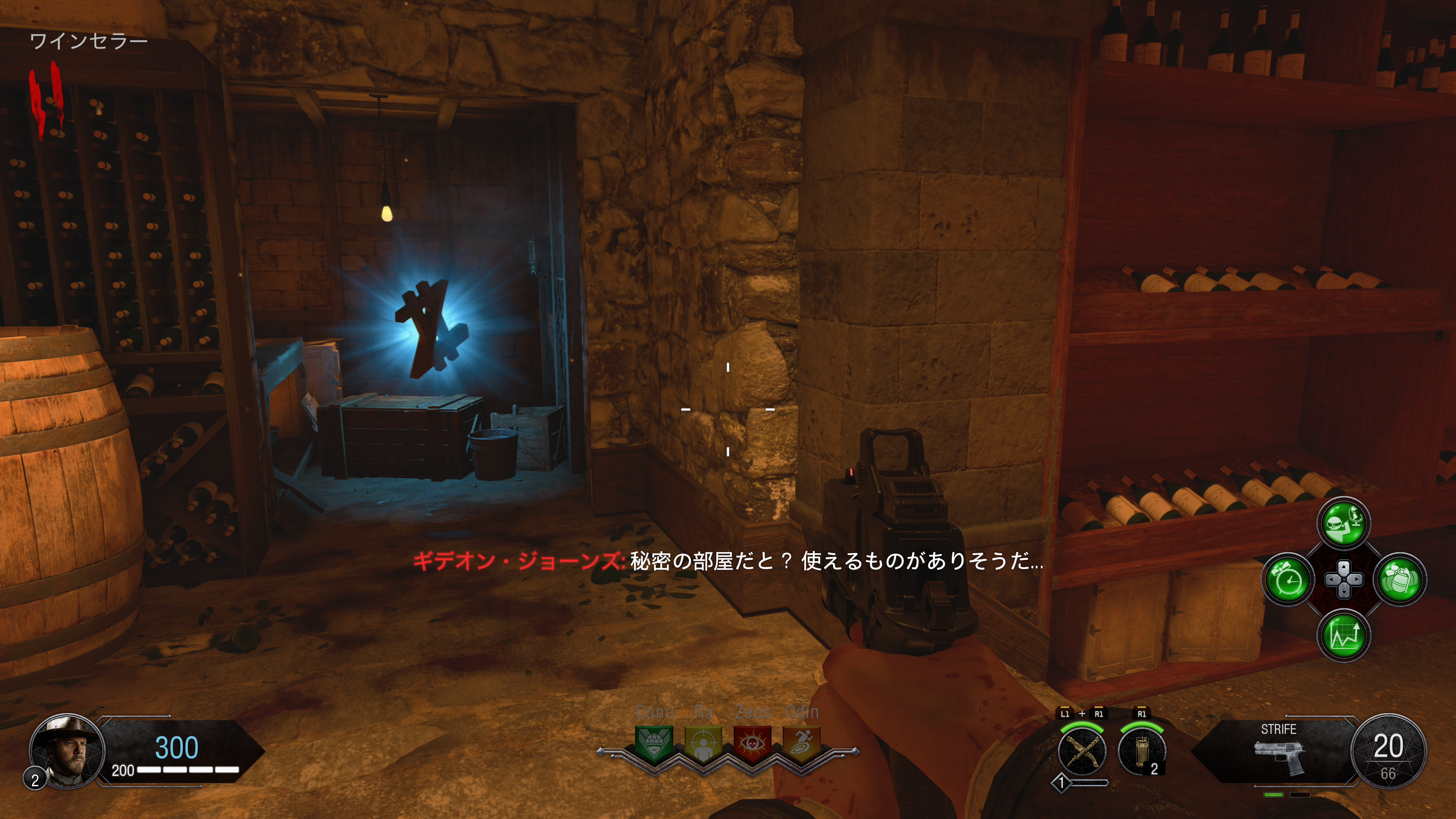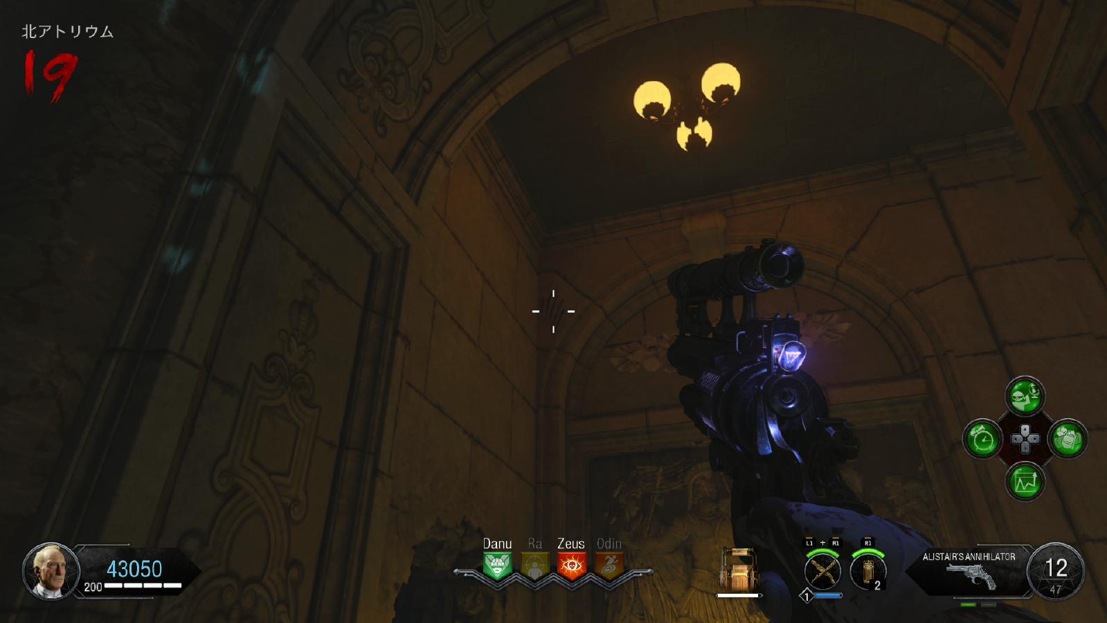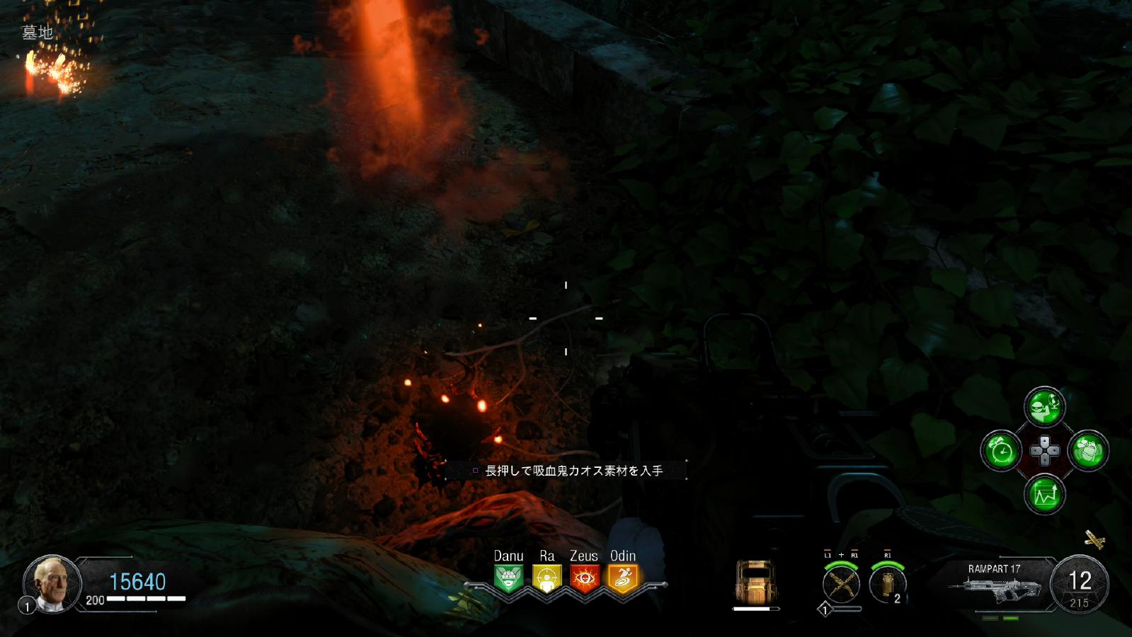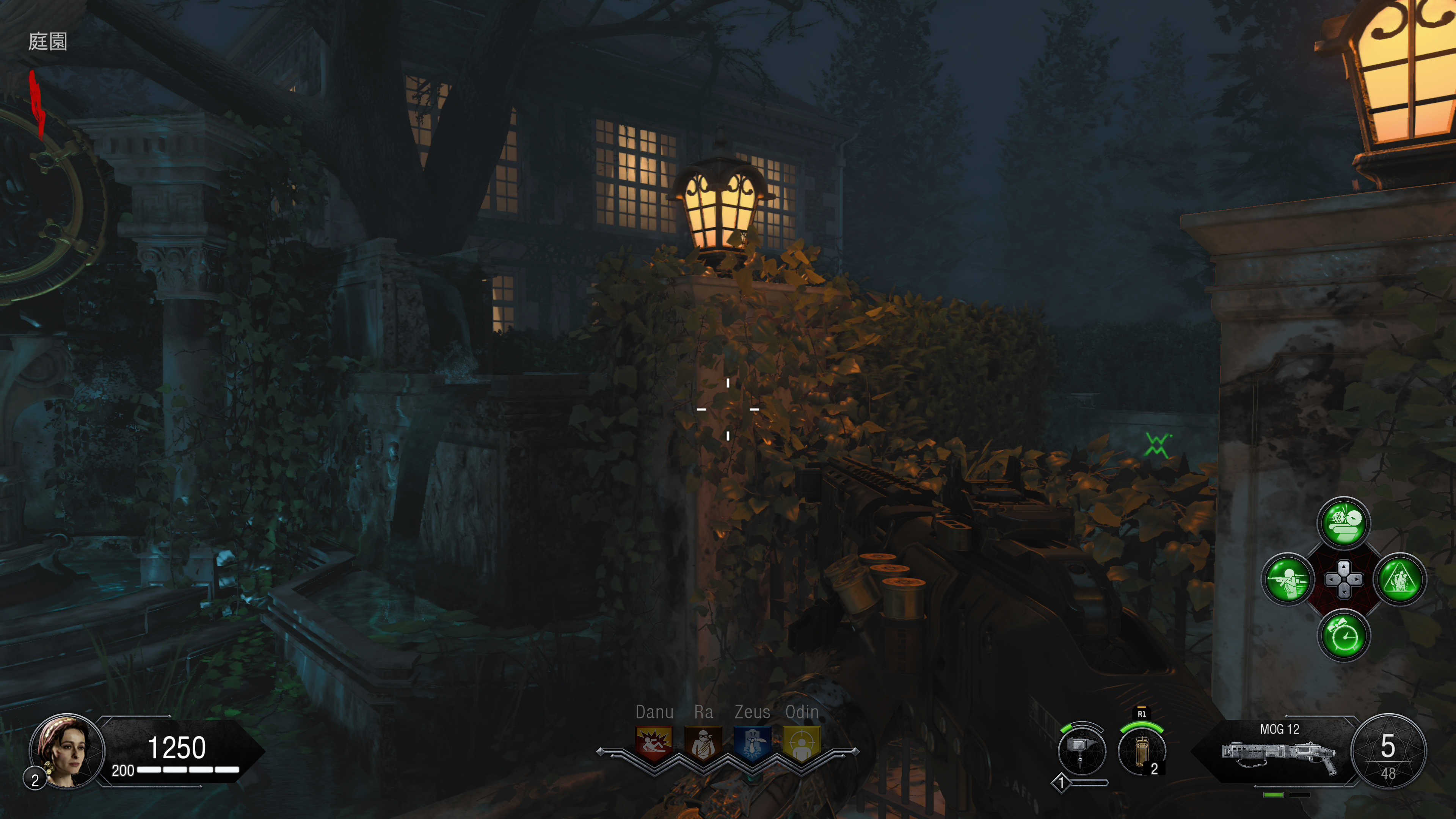 メインクエスト †パックアパンチ解放 †大階段でセンチネルの神器を使う。 その後、各部屋に石の入った壺があるので、打撃で破壊。周囲でゾンビを4キルすると石が輝くので、全て行う。候補地7か所。石は3か所 主寝室 ワインセラー(1) ワインセラー(2) 図書室 書斎 トロフィールーム 寝室廊下 石はチャージが完了すると、中を覗き込むことができる。 時計 ビリヤードルーム、メインホール、ダイニングルームに時計があるのでインタラクト。 インタラクトすると地面に紋章が現れるので、その中で一定時間待機。 完了すると音叉が出てくるので拾う。また、クリアでトロフィー「オンザクロック」入手。 PERK 表示されたPERKの像へ移動。 周辺にヴァンパイアが現れるので全員倒す。 完了すると音叉が出てくるので拾う。 人形 2階玄関ホールに人形があるのでインタラクト。幽霊が現れる。 幽霊の周囲に行くと移動するので、近づいては追いかけるを繰り返す。 最終的に墓地まで移動。 完了すると音叉を落とすので拾う。 女性の絵画 流れは人形と一緒。ゴールは温室テラス。 ロープの輪っか 流れは人形と一緒。 少女と老人 流れは人形と一緒。 悪そうな顔の女 流れは人形と一緒。 聖書 書斎の本棚。 流れは人形と一緒。 音叉を三つ入手したら、森のテラスにある玄関の黒い塊に使用。玄関が開くので奥へ進む。 一番奥にPAPがある。 途中、狼男が出現するので注意。 一番奥まで行くとPAPがある。 シルバー弾入手 †まず、6つのパーツを集める。候補地はそれぞれ三か所 ボトル 図書室からメインホールへ抜ける途中の西廊下のソファー ダイニングルームの時計の裏側にある赤いテーブル 燭台 メインホールの壁の前の壺 ビリヤードルームの床 ワインセラー右側の壁のあたり 皿 ワインセラー、テーブルの上 ワインセラー、棚の上 糞 墓地と霊廟のあたり。霊廟から屋敷側を見て正面の壁の左端 墓地と霊廟の階段の近くの木の後ろ 木炭 ビリヤード室の暖炉 メインホールの暖炉 硫黄 その後、ワインセラーの組立台で銀を作る。 ALISTER'S FOLLY †図書室に暗号を入力できるパネルがある。 マップ各地に正解の記号が点在しているので、それを確認して入力する。 青のシンボルは墓~霊廟あたり。候補地4箇所。 緑のシンボルは庭園。候補地4箇所。 黄色のシンボルは森のテラス。候補地4箇所。 赤のシンボルは、主寝室、西ギャラリー、ワインセラー、ダイニングルーム。 どれもMAP外やバリケードの外にある。 正解のコードを入力すると銃が取れるようになる。 一度入手すると、M.BOXでも出現するようになる。 バリスティックシールド †各地にある盾のパーツを組立台で組み立てる。部品はそれぞれ3箇所にランダムでスポーン シールドプレート メーター 喫煙室で組み立てる。 Chaos Theory †狼男をシルバー弾で倒すと、狼人間カオス素材を落とすので入手。 その後、温室研究所でプリママテリア装置を起動。 暫く待つと装置の側面にプリママテリアが出てくるので入手。 図書室へ行き、バリスティックシールドで左側の本棚を殴ると、隠し空間が現れて、銃のパーツが入手できる。 再度温室研究所へ向かい、ALISTER'S FOLLY を Chaos Theory 組立台でパワーアップすることができる。 R2でチャージショット発射可能。 Alistair's Annihilator †霊廟の正面、消えているランプの前あたりで、Chaos Theoryのチャージショットでヴァンパイアを倒す。黄色い何かに当ててる間にさらに竜巻を当てるといいのかもしれない。 そのうち、ヴァンパイアが胆汁を落とす。 何個か胆汁を拾っていると、霊廟正面の墓が赤く光る。 インタラクトすると、赤いヴァンパイアが現れるので倒す。 すると、吸血鬼カオス素材が手に入るので入手。 これを温室研究所のプリママテリアにかけるとパーツが一つ入手できる。 次に、霊廟の正面、1ラウンドごとに、ランプが一つ追加で点灯する。 これをChaos Theoryで撃つと、他のランプが点灯する。一定時間以内にランプを撃ち続けていると、3箇所目くらいで蝙蝠が空に向かって飛び立つ。それをChaos Theoryで撃ち落とすと蝙蝠カオス素材が入手できる。 これを温室研究所のプリママテリアにかけるとパーツが一つ入手できる。 最後に森で、土に埋まってキノコが生えている骨の周囲にいく。 この骨の上で、チャージショットをゾンビを直接当て、黄色い何かが発動すると、地面を掘ってパーツが出現する。三か所のうち正解は一か所。 これを入手。 三つのパーツを集めた後、温室研究所の Alistair's Annihilator組立台で、Chaos TheoryをAlistair's Annihilatorに加工できるようになる。 結晶からチャレンジを受ける †PAP解放の際にチャージした結晶を再度インタラクトすると、イラストが見える。それに対応したクエストをこなす必要がある。 騎士 †ALISTER'S ANNIHILATOR とシールド必須。 図書室のファイアゲートの罠を作成する。 ファイアゲートを起動するためのアイテムはランダムで各地に散らばってる。 暖炉にランダムに決まる順番に