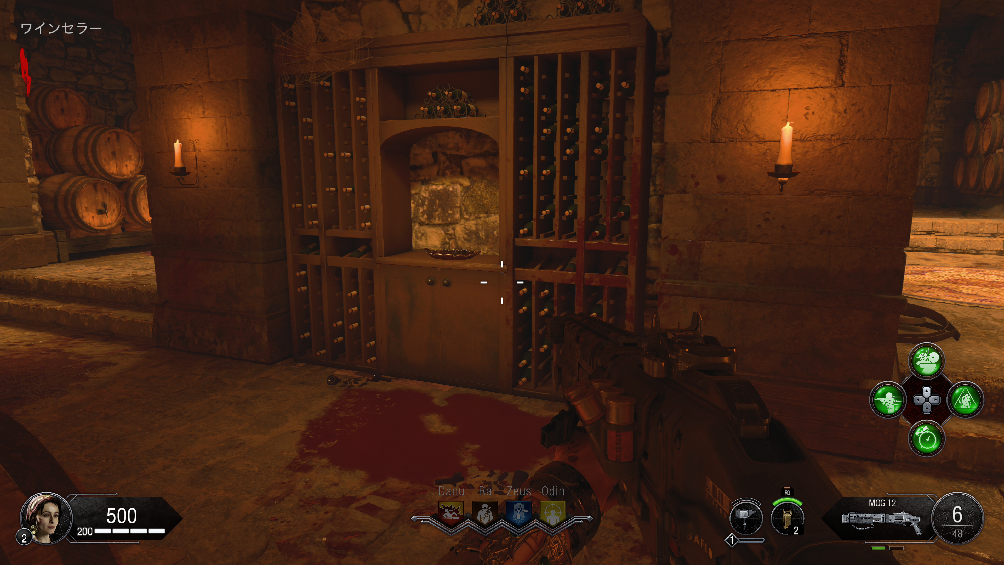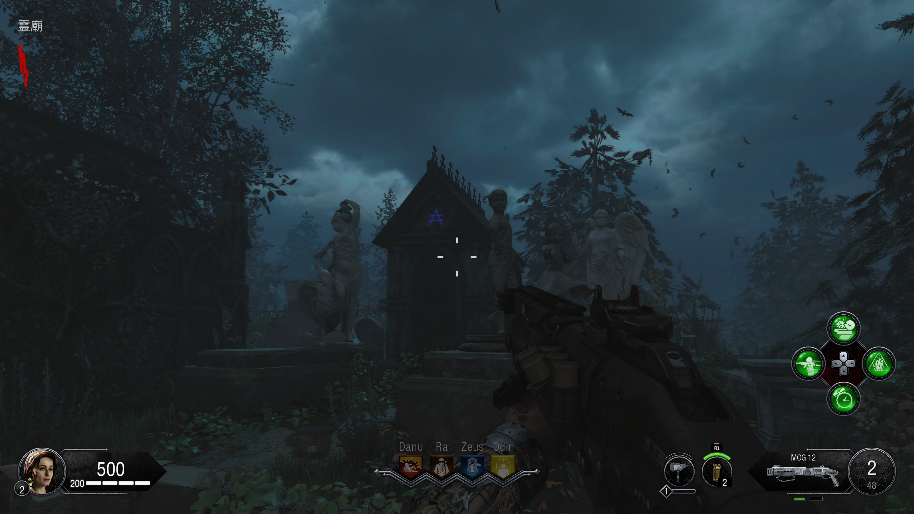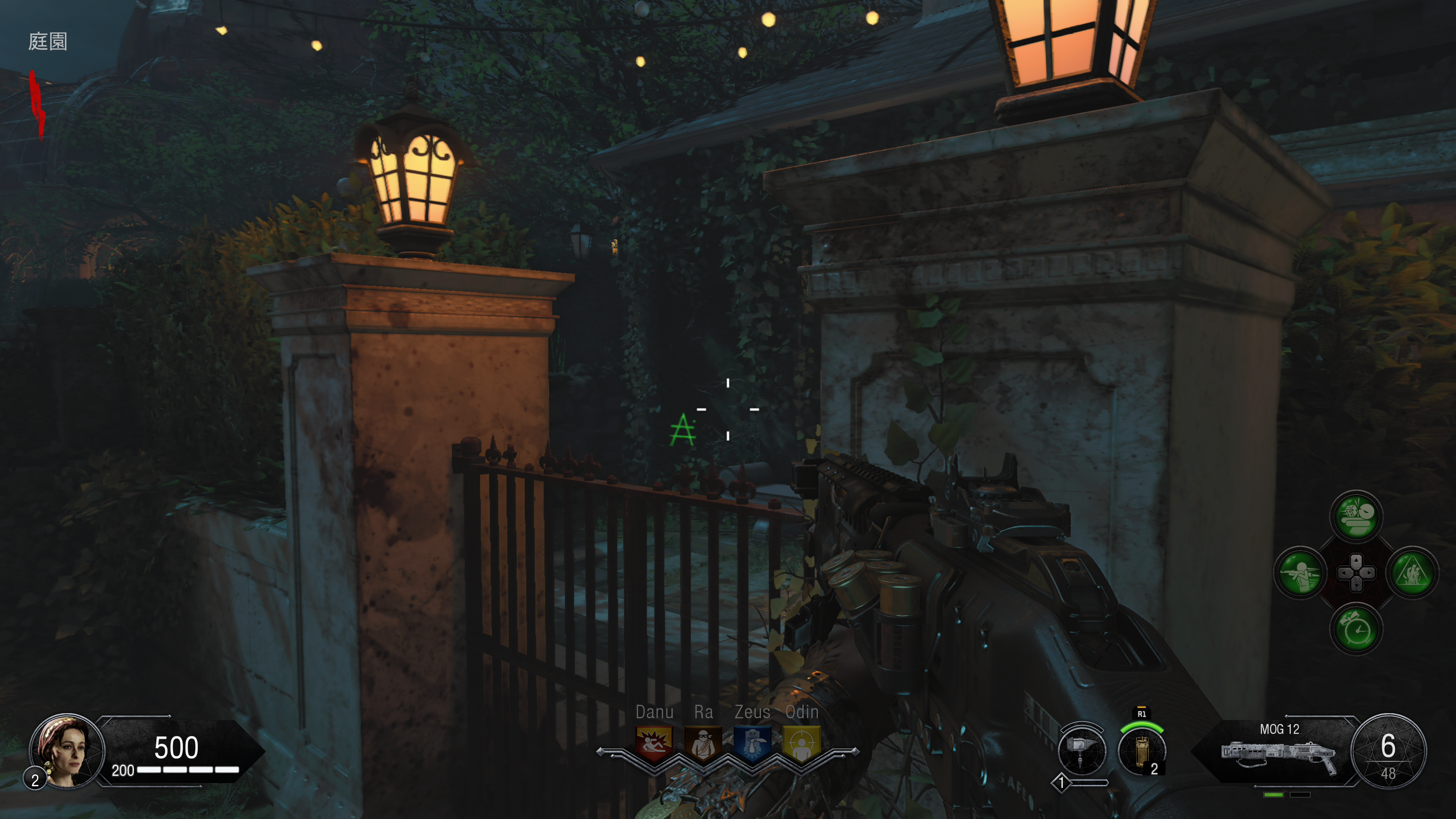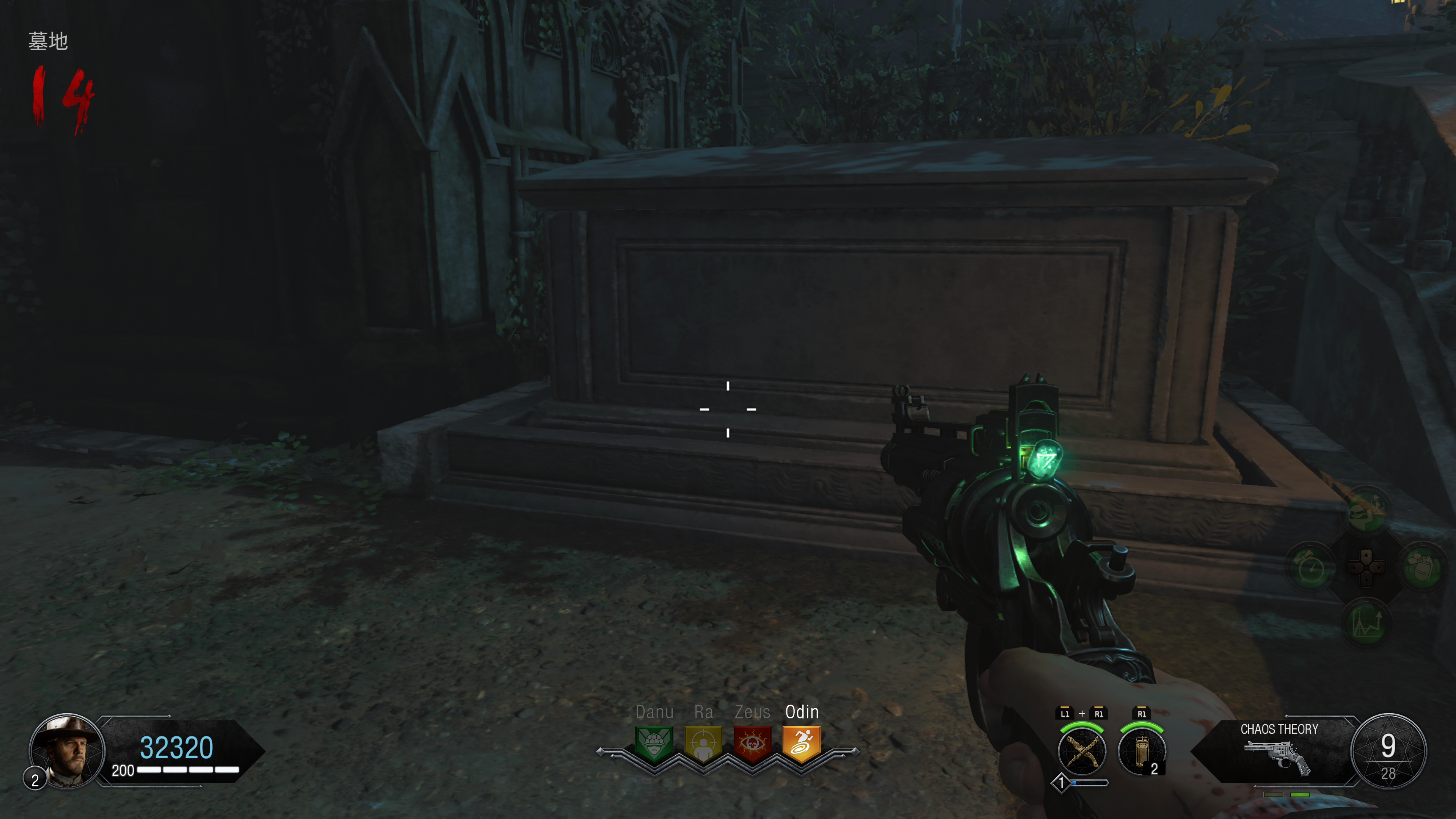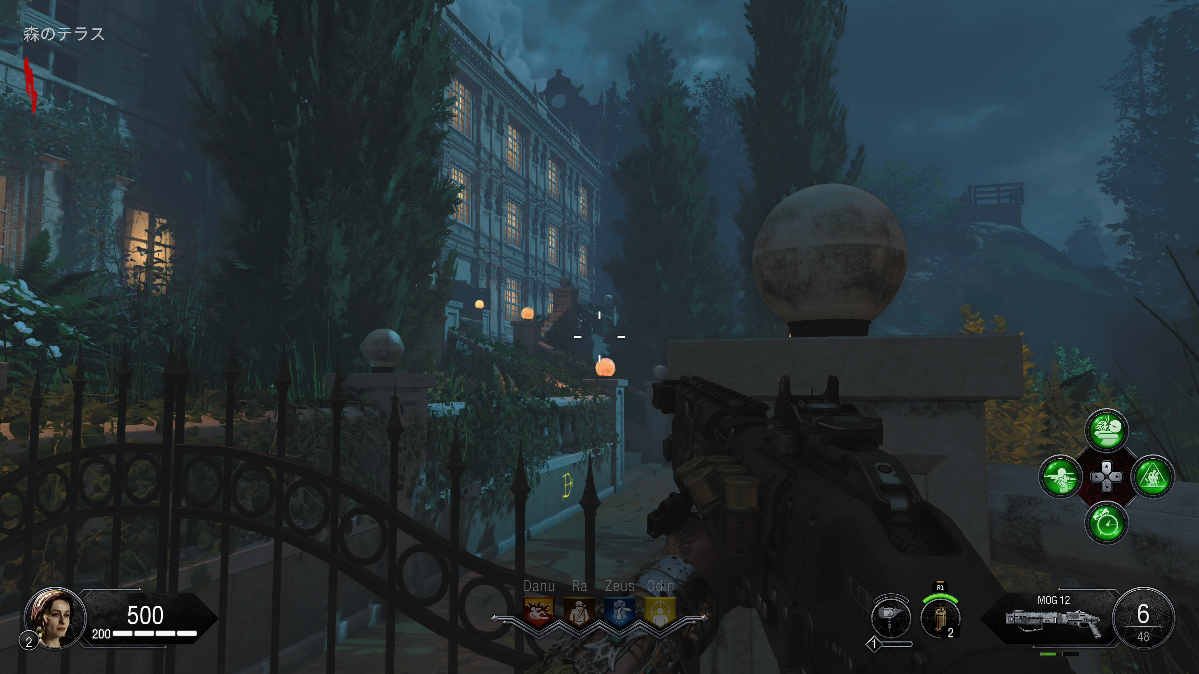 メインクエスト †パックアパンチ解放 †大階段でセンチネルの神器を使う。 その後、各部屋に石の入った壺があるので、打撃で破壊。周囲でゾンビを4キルすると石が輝くので、全て行う。候補地7か所。石は3か所 主寝室 ワインセラー(1) ワインセラー(2) 図書室 書斎 トロフィールーム 寝室廊下 石はチャージが完了すると、中を覗き込むことができる。 時計 ビリヤードルーム、メインホール、ダイニングルームに時計があるのでインタラクト。 インタラクトすると地面に紋章が現れるので、その中で一定時間待機。 完了すると音叉が出てくるので拾う。また、クリアでトロフィー「オンザクロック」入手。 PERK 表示されたPERKの像へ移動。 周辺にヴァンパイアが現れるので全員倒す。 完了すると音叉が出てくるので拾う。 人形 2階玄関ホールに人形があるのでインタラクト。幽霊が現れる。 幽霊の周囲に行くと移動するので、近づいては追いかけるを繰り返す。 最終的に墓地まで移動。 完了すると音叉を落とすので拾う。 女性の絵画 流れは人形と一緒。ゴールは温室テラス。 ロープの輪っか 流れは人形と一緒。 少女と老人 流れは人形と一緒。 悪そうな顔の女 流れは人形と一緒。 聖書 書斎の本棚。 流れは人形と一緒。 音叉を三つ入手したら、森のテラスにある玄関の黒い塊に使用。玄関が開くので奥へ進む。 一番奥にPAPがある。 途中、狼男が出現するので注意。 一番奥まで行くとPAPがある。 シルバー弾入手 †まず、6つのパーツを集める。候補地はそれぞれ三か所 ボトル 図書室からメインホールへ抜ける途中の西廊下のソファー ダイニングルームの時計の裏側にある赤いテーブル 燭台 メインホールの壁の前の壺 ビリヤードルームの床 ワインセラー右側の壁のあたり 皿 ワインセラー、テーブルの上 ワインセラー、棚の上 糞 墓地と霊廟のあたり。霊廟から屋敷側を見て正面の壁の左端 墓地と霊廟の階段の近くの木の後ろ 木炭 ビリヤード室の暖炉 メインホールの暖炉 硫黄 その後、ワインセラーの組立台で銀を作る。 ALISTER'S FOLLY †図書室に暗号を入力できるパネルがある。 マップ各地に正解の記号が点在しているので、それを確認して入力する。 青のシンボルは墓~霊廟あたり。候補地4箇所。 緑のシンボルは庭園。候補地4箇所。 黄色のシンボルは森のテラス。候補地4箇所。 赤のシンボルは、主寝室、西ギャラリー、ワインセラー、ダイニングルーム。 どれもMAP外やバリケードの外にある。 正解のコードを入力すると銃が取れるようになる。 一度入手すると、M.BOXでも出現するようになる。 バリスティックシールド †各地にある盾のパーツを組立台で組み立てる。部品はそれぞれ3箇所にランダムでスポーン シールドプレート メーター 喫煙室で組み立てる。 Chaos Theory †狼男をシルバー弾で倒すと、狼人間カオス素材を落とすので入手。 その後、温室研究所でプリママテリア装置を起動。 暫く待つと装置の側面にプリママテリアが出てくるので入手。 図書室へ行き、バリスティックシールドで左側の本棚を殴ると、隠し空間が現れて、銃のパーツが入手できる。 再度温室研究所へ向かい、ALISTER'S FOLLY を Chaos Theory 組立台でパワーアップすることができる。 R2でチャージショット発射可能。 Alistair's Annihilator †霊廟の正面、消えているランプの前あたりで、Chaos Theoryのチャージショットでヴァンパイアを倒す。黄色い何かに当ててる間にさらに竜巻を当てるといいのかもしれない。 そのうち、ヴァンパイアが胆汁を落とす。 何個か胆汁を拾っていると、霊廟正面の墓が赤く光る。 インタラクトすると、赤いヴァンパイアが現れるので倒す。 すると、吸血鬼カオス素材が手に入るので入手。 これを温室研究所のプリママテリアにかけるとパーツが一つ入手できる。 次に、霊廟の正面、1ラウンドごとに、ランプが一つ追加で点灯する。 これをChaos Theoryで撃つと、他のランプが点灯する。一定時間以内にランプを撃ち続けていると、3箇所目くらいで蝙蝠が空に向かって飛び立つ。それをChaos Theoryで撃ち落とすと蝙蝠カオス素材が入手できる。 これを温室研究所のプリママテリアにかけるとパーツが一つ入手できる。 最後に森で、土に埋まってキノコが生えている骨の周囲にいく。 この骨の上で、チャージショットをゾンビを直接当て、黄色い何かが発動すると、地面を掘ってパーツが出現する。三か所のうち正解は一か所。 これを入手。 三つのパーツを集めた後、温室研究所の Alistair's Annihilator組立台で、Chaos TheoryをAlistair's Annihilatorに加工できるようになる。 結晶からチャレンジを受ける †PAP解放の際にチャージした結晶を再度インタラクトすると、イラストが見える。それに対応したクエストをこなす必要がある。 騎士 †ALISTER'S ANNIHILATOR とシールド必須。 図書室のファイアゲートの罠を作成する。 ファイアゲートを起動するためのアイテムはランダムで各地に散らばってる。 暖炉にランダムに決まる順番に