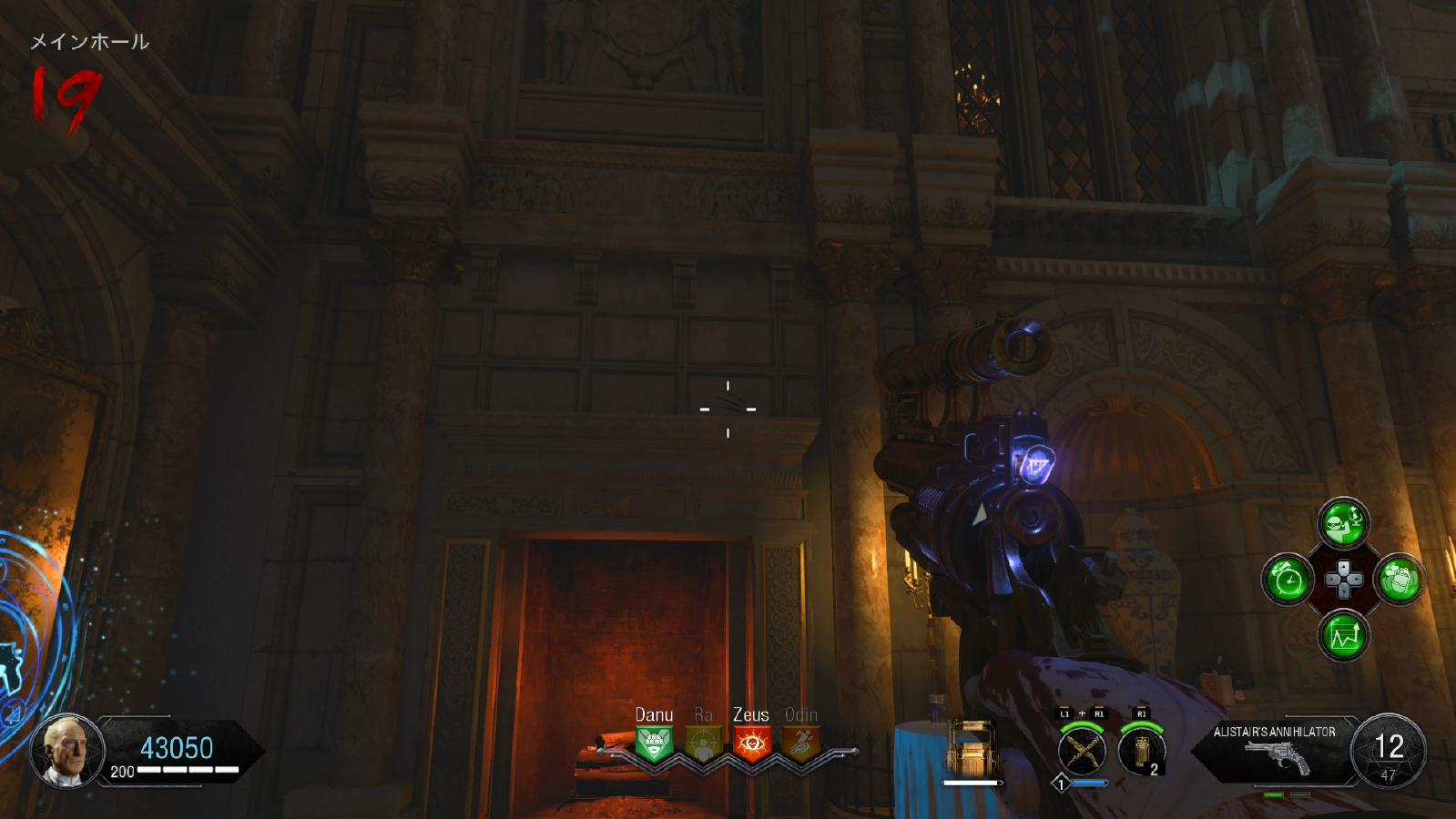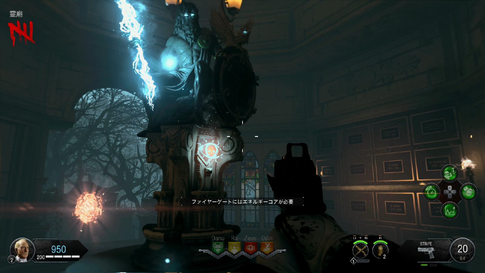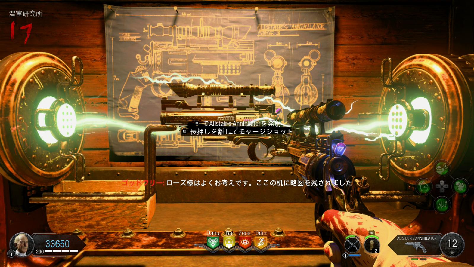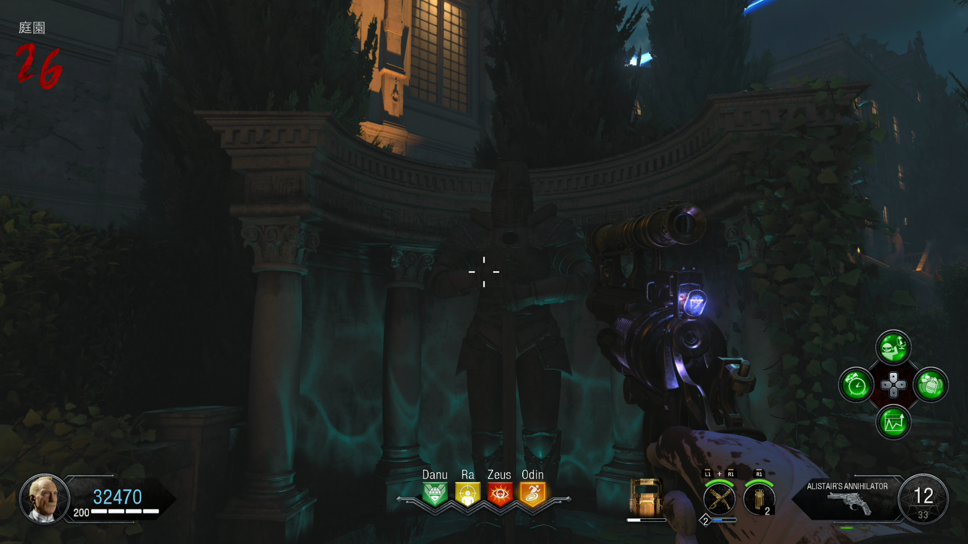 メインクエスト †パックアパンチ解放 †大階段でセンチネルの神器を使う。 その後、各部屋に石の入った壺があるので、打撃で破壊。周囲でゾンビを4キルすると石が輝くので、全て行う。候補地7か所。石は3か所 主寝室 ワインセラー(1) ワインセラー(2) 図書室 書斎 トロフィールーム 寝室廊下 石はチャージが完了すると、中を覗き込むことができる。 時計 ビリヤードルーム、メインホール、ダイニングルームに時計があるのでインタラクト。 インタラクトすると地面に紋章が現れるので、その中で一定時間待機。 完了すると音叉が出てくるので拾う。また、クリアでトロフィー「オンザクロック」入手。 PERK 表示されたPERKの像へ移動。 周辺にヴァンパイアが現れるので全員倒す。 完了すると音叉が出てくるので拾う。 人形 2階玄関ホールに人形があるのでインタラクト。幽霊が現れる。 幽霊の周囲に行くと移動するので、近づいては追いかけるを繰り返す。 最終的に墓地まで移動。 完了すると音叉を落とすので拾う。 女性の絵画 流れは人形と一緒。ゴールは温室テラス。 ロープの輪っか 流れは人形と一緒。 少女と老人 流れは人形と一緒。 悪そうな顔の女 流れは人形と一緒。 聖書 書斎の本棚。 流れは人形と一緒。 音叉を三つ入手したら、森のテラスにある玄関の黒い塊に使用。玄関が開くので奥へ進む。 一番奥にPAPがある。 途中、狼男が出現するので注意。 一番奥まで行くとPAPがある。 シルバー弾入手 †まず、6つのパーツを集める。候補地はそれぞれ三か所 ボトル 図書室からメインホールへ抜ける途中の西廊下のソファー ダイニングルームの時計の裏側にある赤いテーブル 燭台 メインホールの壁の前の壺 ビリヤードルームの床 ワインセラー右側の壁のあたり 皿 ワインセラー、テーブルの上 ワインセラー、棚の上 糞 墓地と霊廟のあたり。霊廟から屋敷側を見て正面の壁の左端 墓地と霊廟の階段の近くの木の後ろ 木炭 ビリヤード室の暖炉 メインホールの暖炉 硫黄 その後、ワインセラーの組立台で銀を作る。 ALISTER'S FOLLY †図書室に暗号を入力できるパネルがある。 マップ各地に正解の記号が点在しているので、それを確認して入力する。 青のシンボルは墓~霊廟あたり。候補地4箇所。 緑のシンボルは庭園。候補地4箇所。 黄色のシンボルは森のテラス。候補地4箇所。 赤のシンボルは、主寝室、西ギャラリー、ワインセラー、ダイニングルーム。 どれもMAP外やバリケードの外にある。 正解のコードを入力すると銃が取れるようになる。 一度入手すると、M.BOXでも出現するようになる。 バリスティックシールド †各地にある盾のパーツを組立台で組み立てる。部品はそれぞれ3箇所にランダムでスポーン シールドプレート メーター 喫煙室で組み立てる。 Chaos Theory †狼男をシルバー弾で倒すと、狼人間カオス素材を落とすので入手。 その後、温室研究所でプリママテリア装置を起動。 暫く待つと装置の側面にプリママテリアが出てくるので入手。 図書室へ行き、バリスティックシールドで左側の本棚を殴ると、隠し空間が現れて、銃のパーツが入手できる。 再度温室研究所へ向かい、ALISTER'S FOLLY を Chaos Theory 組立台でパワーアップすることができる。 R2でチャージショット発射可能。 Alistair's Annihilator †霊廟の正面、消えているランプの前あたりで、Chaos Theoryのチャージショットでヴァンパイアを倒す。黄色い何かに当ててる間にさらに竜巻を当てるといいのかもしれない。 そのうち、ヴァンパイアが胆汁を落とす。 何個か胆汁を拾っていると、霊廟正面の墓が赤く光る。 インタラクトすると、赤いヴァンパイアが現れるので倒す。 すると、吸血鬼カオス素材が手に入るので入手。 これを温室研究所のプリママテリアにかけるとパーツが一つ入手できる。 次に、霊廟の正面、1ラウンドごとに、ランプが一つ追加で点灯する。 これをChaos Theoryで撃つと、他のランプが点灯する。一定時間以内にランプを撃ち続けていると、3箇所目くらいで蝙蝠が空に向かって飛び立つ。それをChaos Theoryで撃ち落とすと蝙蝠カオス素材が入手できる。 これを温室研究所のプリママテリアにかけるとパーツが一つ入手できる。 最後に森で、土に埋まってキノコが生えている骨の周囲にいく。 この骨の上で、チャージショットをゾンビを直接当て、黄色い何かが発動すると、地面を掘ってパーツが出現する。三か所のうち正解は一か所。 これを入手。 三つのパーツを集めた後、温室研究所の Alistair's Annihilator組立台で、Chaos TheoryをAlistair's Annihilatorに加工できるようになる。 結晶からチャレンジを受ける †PAP解放の際にチャージした結晶を再度インタラクトすると、イラストが見える。それに対応したクエストをこなす必要がある。 騎士 †ALISTER'S ANNIHILATOR とシールド必須。 図書室のファイアゲートの罠を作成する。 ファイアゲートを起動するためのアイテムはランダムで各地に散らばってる。 暖炉にランダムに決まる順番に