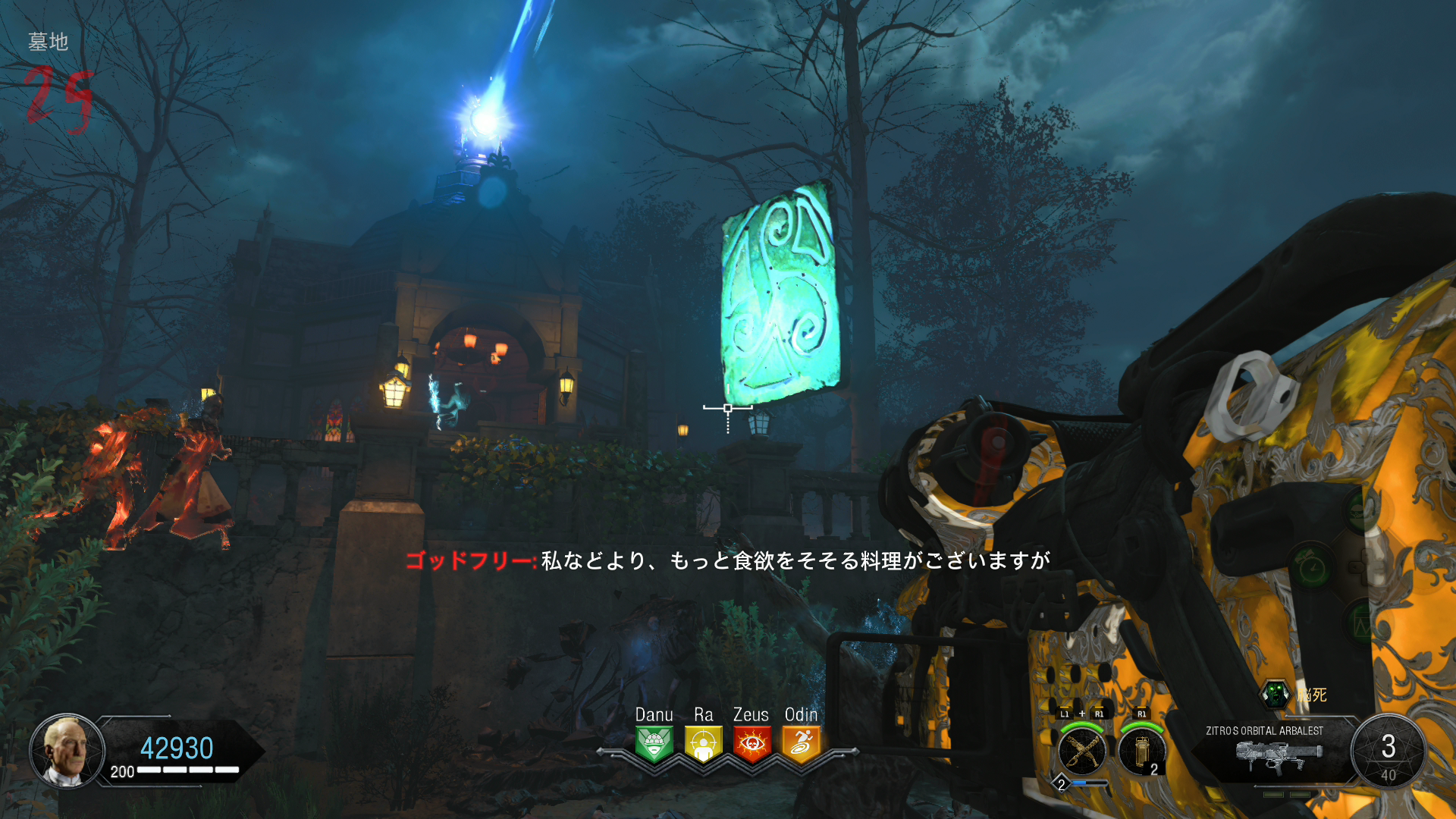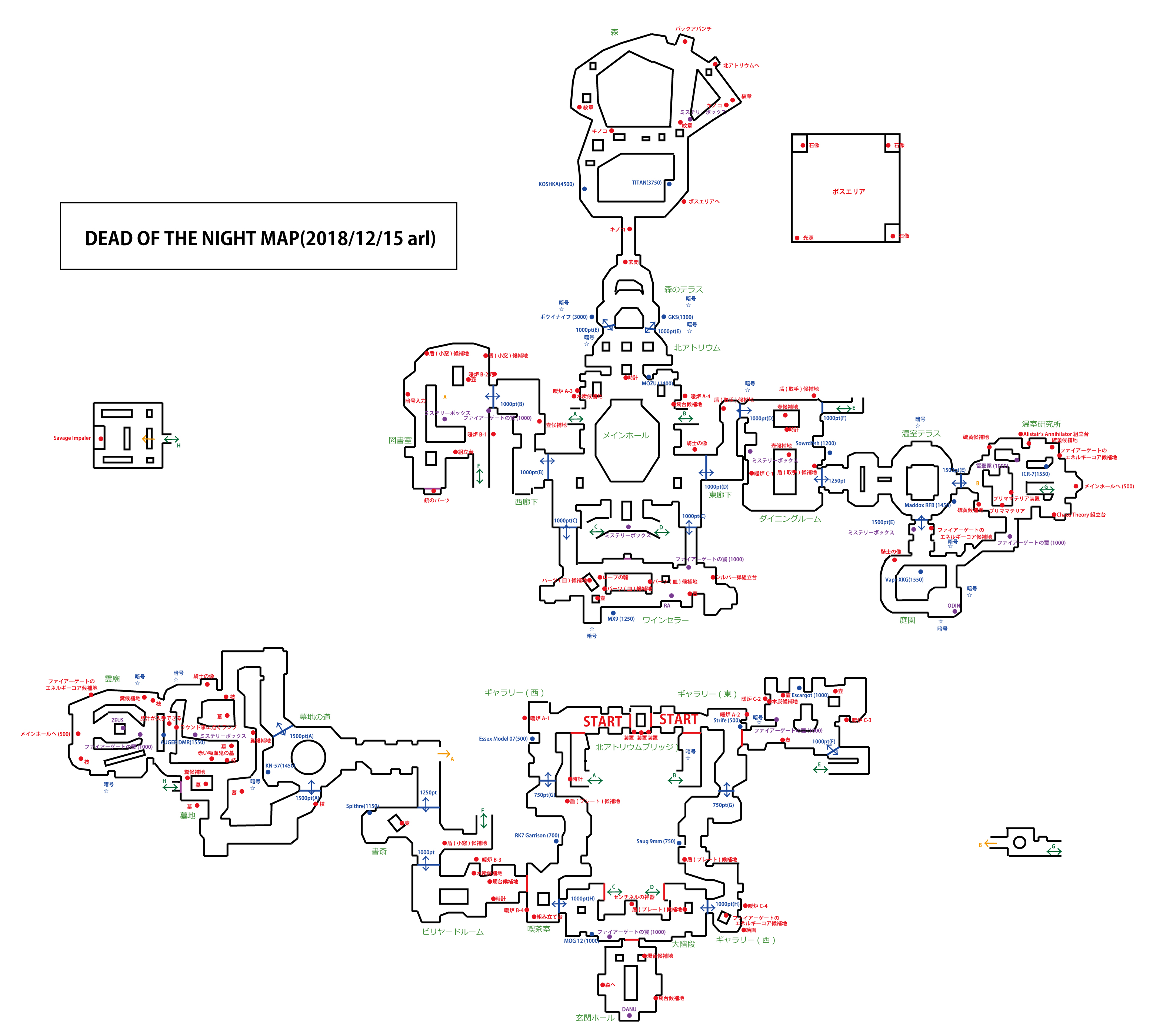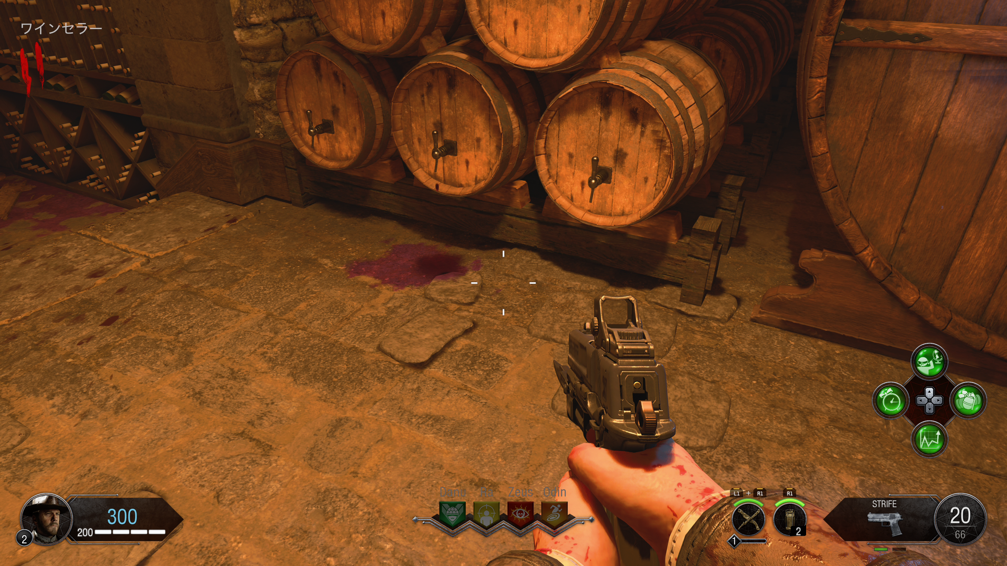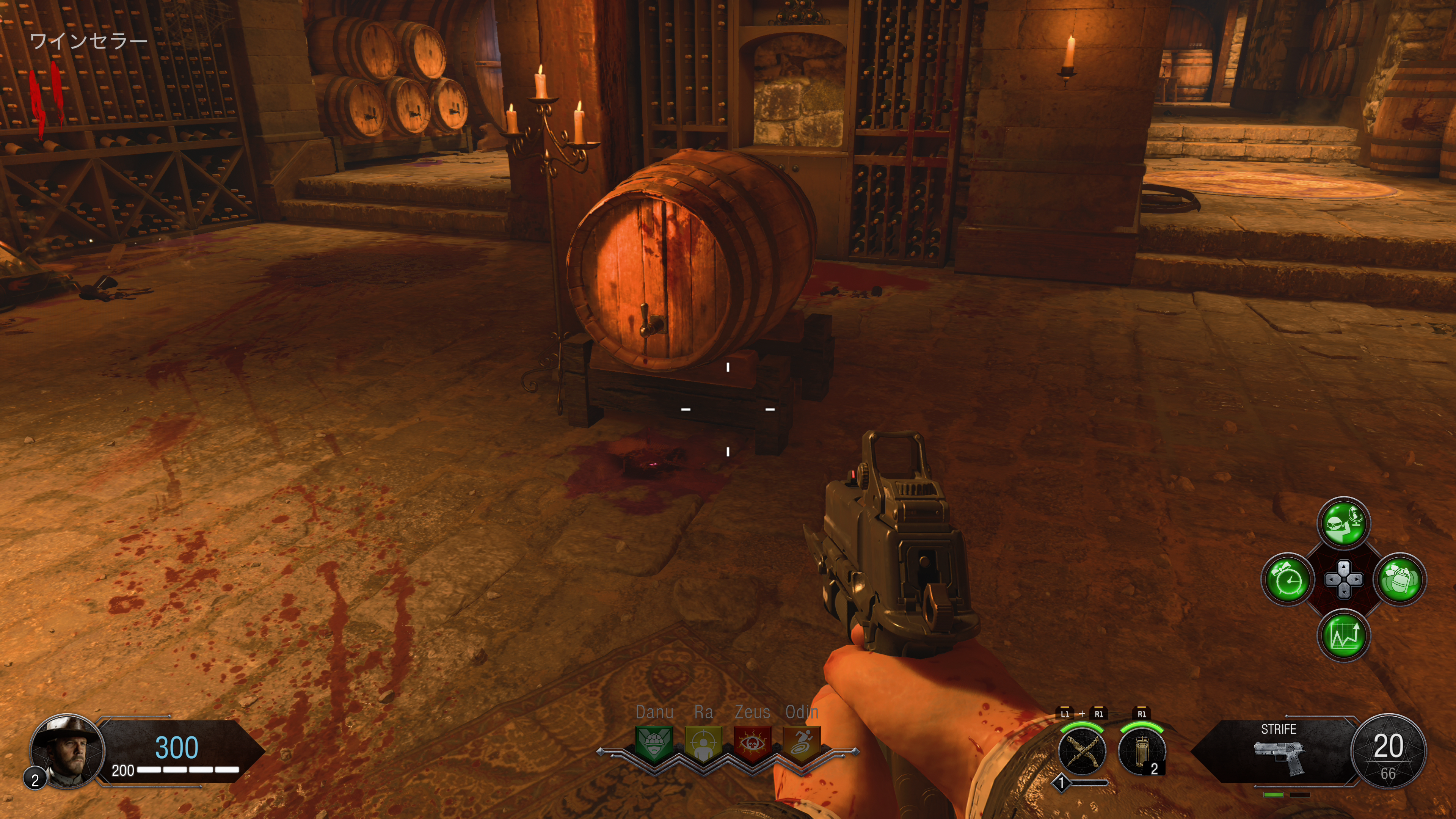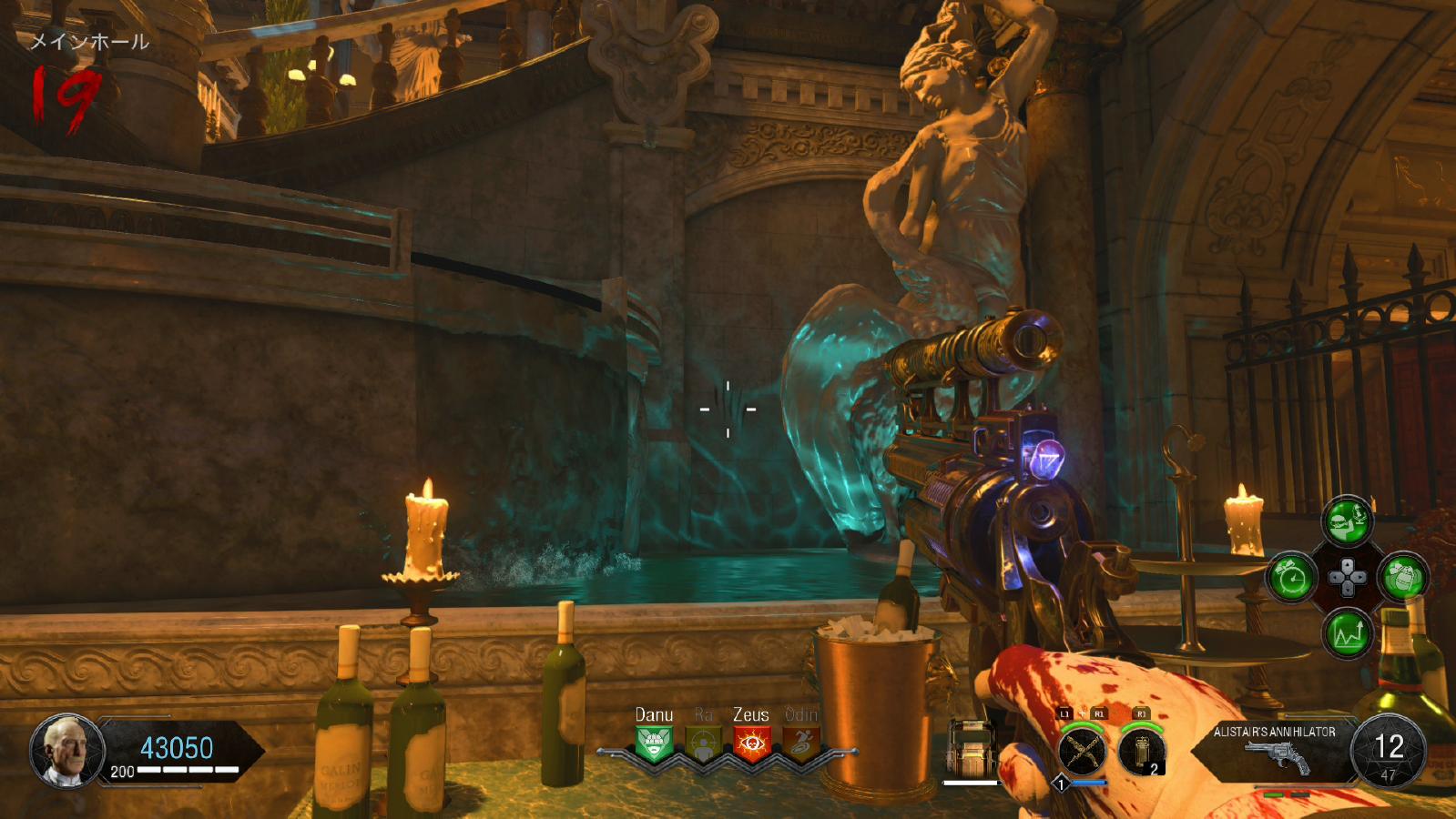 メインクエスト †パックアパンチ解放 †大階段でセンチネルの神器を使う。 その後、各部屋に石の入った壺があるので、打撃で破壊。周囲でゾンビを4キルすると石が輝くので、全て行う。候補地7か所。石は3か所 主寝室 ワインセラー(1) ワインセラー(2) 図書室 書斎 トロフィールーム 寝室廊下 石はチャージが完了すると、中を覗き込むことができる。 時計 ビリヤードルーム、メインホール、ダイニングルームに時計があるのでインタラクト。 インタラクトすると地面に紋章が現れるので、その中で一定時間待機。 完了すると音叉が出てくるので拾う。また、クリアでトロフィー「オンザクロック」入手。 PERK 表示されたPERKの像へ移動。 周辺にヴァンパイアが現れるので全員倒す。 完了すると音叉が出てくるので拾う。 人形 2階玄関ホールに人形があるのでインタラクト。幽霊が現れる。 幽霊の周囲に行くと移動するので、近づいては追いかけるを繰り返す。 最終的に墓地まで移動。 完了すると音叉を落とすので拾う。 女性の絵画 流れは人形と一緒。ゴールは温室テラス。 ロープの輪っか 流れは人形と一緒。 少女と老人 流れは人形と一緒。 悪そうな顔の女 流れは人形と一緒。 聖書 書斎の本棚。 流れは人形と一緒。 音叉を三つ入手したら、森のテラスにある玄関の黒い塊に使用。玄関が開くので奥へ進む。 一番奥にPAPがある。 途中、狼男が出現するので注意。 一番奥まで行くとPAPがある。 シルバー弾入手 †まず、6つのパーツを集める。候補地はそれぞれ三か所 ボトル 図書室からメインホールへ抜ける途中の西廊下のソファー ダイニングルームの時計の裏側にある赤いテーブル 燭台 メインホールの壁の前の壺 ビリヤードルームの床 ワインセラー右側の壁のあたり 皿 ワインセラー、テーブルの上 ワインセラー、棚の上 糞 墓地と霊廟のあたり。霊廟から屋敷側を見て正面の壁の左端 墓地と霊廟の階段の近くの木の後ろ 木炭 ビリヤード室の暖炉 メインホールの暖炉 硫黄 その後、ワインセラーの組立台で銀を作る。 ALISTER'S FOLLY †図書室に暗号を入力できるパネルがある。 マップ各地に正解の記号が点在しているので、それを確認して入力する。 青のシンボルは墓~霊廟あたり。候補地4箇所。 緑のシンボルは庭園。候補地4箇所。 黄色のシンボルは森のテラス。候補地4箇所。 赤のシンボルは、主寝室、西ギャラリー、ワインセラー、ダイニングルーム。 どれもMAP外やバリケードの外にある。 正解のコードを入力すると銃が取れるようになる。 一度入手すると、M.BOXでも出現するようになる。 バリスティックシールド †各地にある盾のパーツを組立台で組み立てる。部品はそれぞれ3箇所にランダムでスポーン シールドプレート メーター 喫煙室で組み立てる。 Chaos Theory †狼男をシルバー弾で倒すと、狼人間カオス素材を落とすので入手。 その後、温室研究所でプリママテリア装置を起動。 暫く待つと装置の側面にプリママテリアが出てくるので入手。 図書室へ行き、バリスティックシールドで左側の本棚を殴ると、隠し空間が現れて、銃のパーツが入手できる。 再度温室研究所へ向かい、ALISTER'S FOLLY を Chaos Theory 組立台でパワーアップすることができる。 R2でチャージショット発射可能。 Alistair's Annihilator †霊廟の正面、消えているランプの前あたりで、Chaos Theoryのチャージショットでヴァンパイアを倒す。黄色い何かに当ててる間にさらに竜巻を当てるといいのかもしれない。 そのうち、ヴァンパイアが胆汁を落とす。 何個か胆汁を拾っていると、霊廟正面の墓が赤く光る。 インタラクトすると、赤いヴァンパイアが現れるので倒す。 すると、吸血鬼カオス素材が手に入るので入手。 これを温室研究所のプリママテリアにかけるとパーツが一つ入手できる。 次に、霊廟の正面、1ラウンドごとに、ランプが一つ追加で点灯する。 これをChaos Theoryで撃つと、他のランプが点灯する。一定時間以内にランプを撃ち続けていると、3箇所目くらいで蝙蝠が空に向かって飛び立つ。それをChaos Theoryで撃ち落とすと蝙蝠カオス素材が入手できる。 これを温室研究所のプリママテリアにかけるとパーツが一つ入手できる。 最後に森で、土に埋まってキノコが生えている骨の周囲にいく。 この骨の上で、チャージショットをゾンビを直接当て、黄色い何かが発動すると、地面を掘ってパーツが出現する。三か所のうち正解は一か所。 これを入手。 三つのパーツを集めた後、温室研究所の Alistair's Annihilator組立台で、Chaos TheoryをAlistair's Annihilatorに加工できるようになる。 結晶からチャレンジを受ける †PAP解放の際にチャージした結晶を再度インタラクトすると、イラストが見える。それに対応したクエストをこなす必要がある。 騎士 †ALISTER'S ANNIHILATOR とシールド必須。 図書室のファイアゲートの罠を作成する。 ファイアゲートを起動するためのアイテムはランダムで各地に散らばってる。 暖炉にランダムに決まる順番に