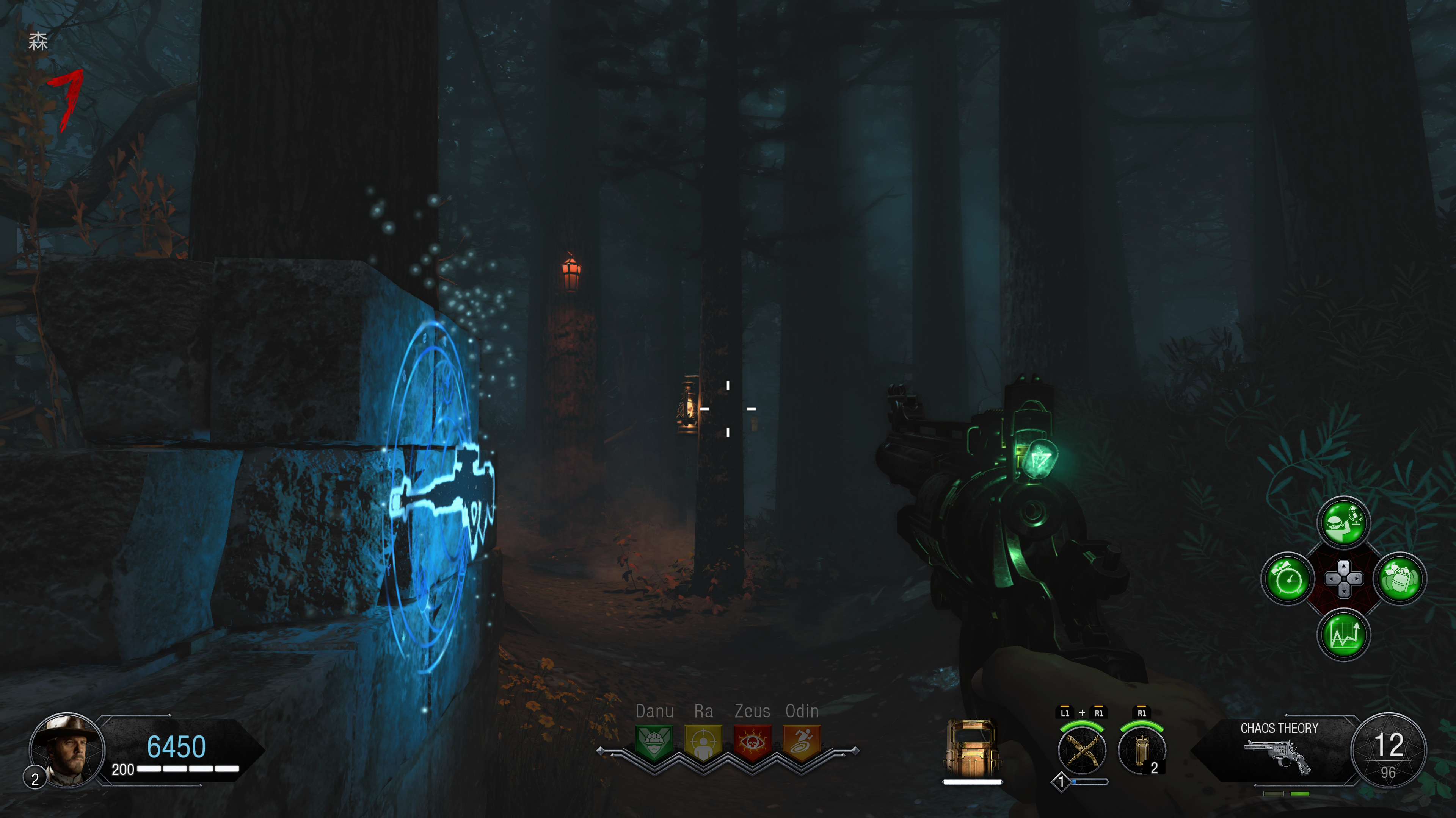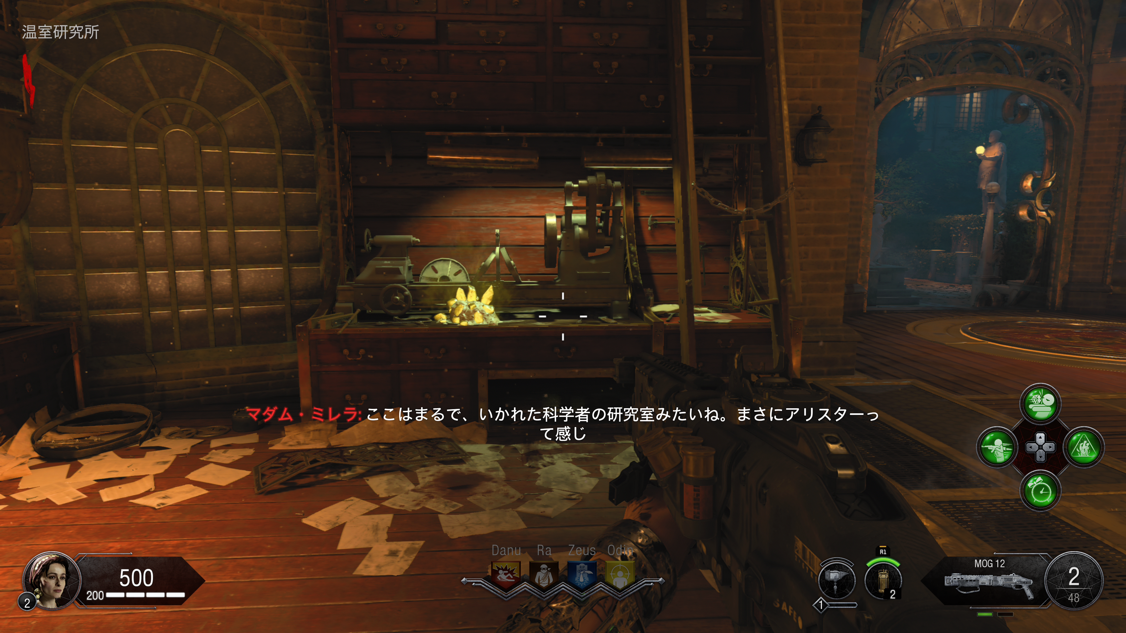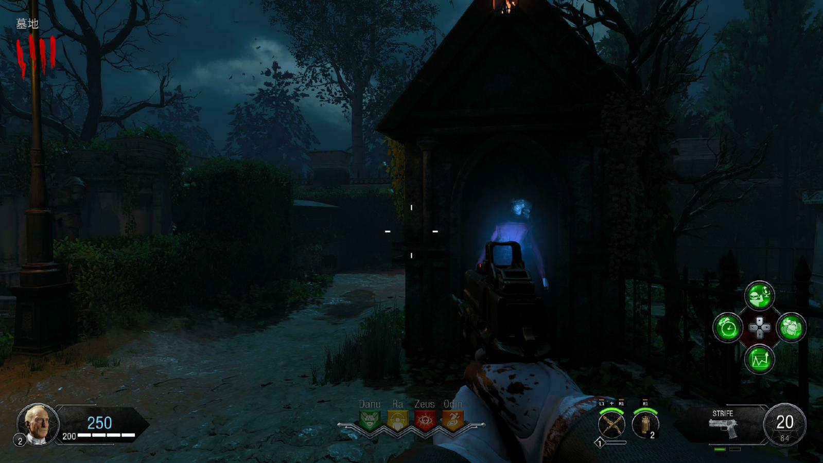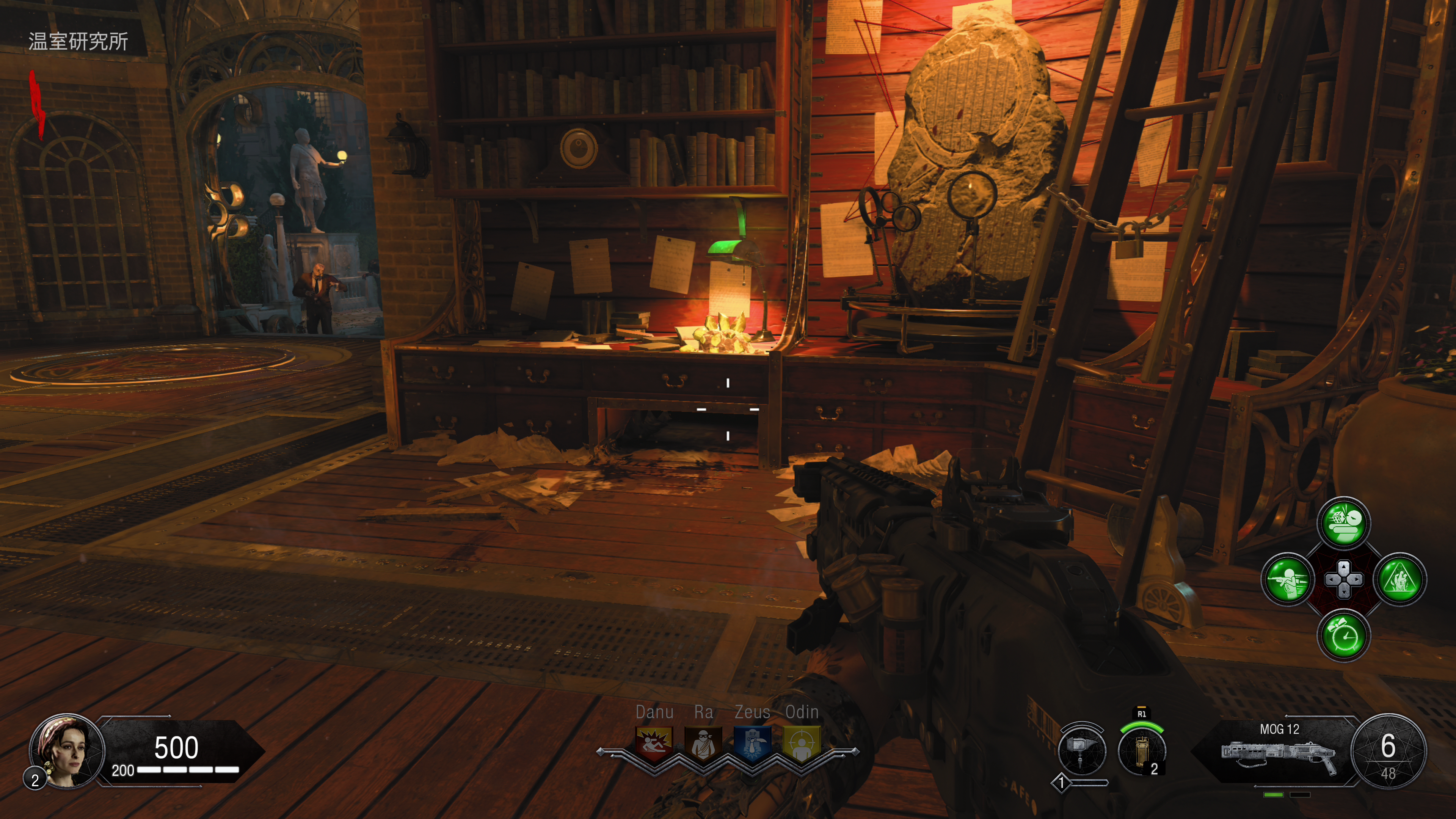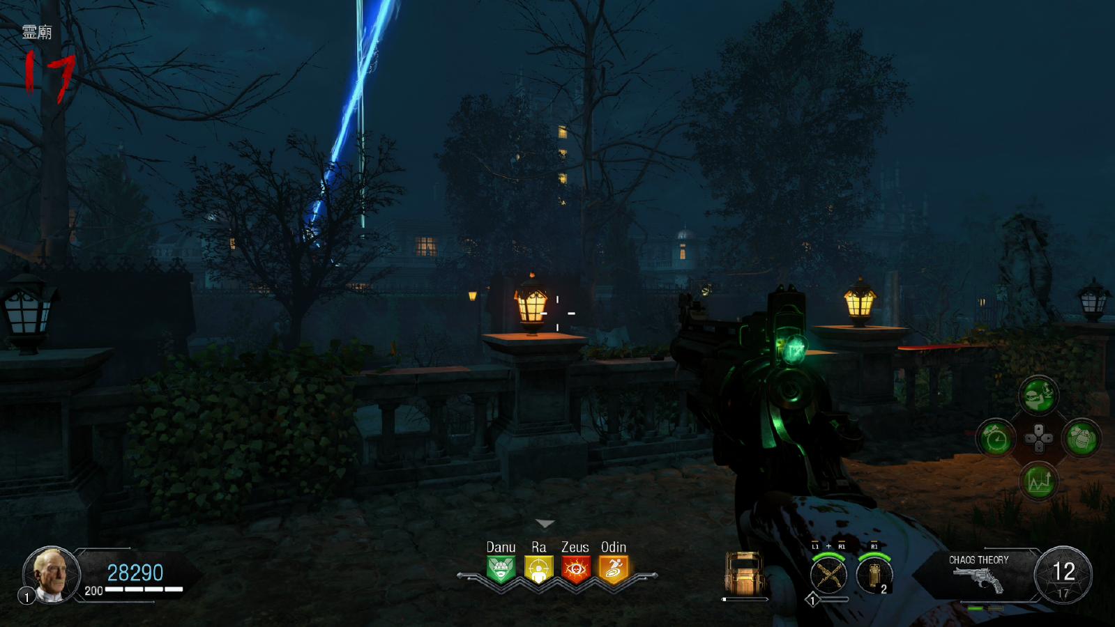 メインクエスト †パックアパンチ解放 †大階段でセンチネルの神器を使う。 その後、各部屋に石の入った壺があるので、打撃で破壊。周囲でゾンビを4キルすると石が輝くので、全て行う。候補地7か所。石は3か所 主寝室 ワインセラー(1) ワインセラー(2) 図書室 書斎 トロフィールーム 寝室廊下 石はチャージが完了すると、中を覗き込むことができる。 時計 ビリヤードルーム、メインホール、ダイニングルームに時計があるのでインタラクト。 インタラクトすると地面に紋章が現れるので、その中で一定時間待機。 完了すると音叉が出てくるので拾う。また、クリアでトロフィー「オンザクロック」入手。 PERK 表示されたPERKの像へ移動。 周辺にヴァンパイアが現れるので全員倒す。 完了すると音叉が出てくるので拾う。 人形 2階玄関ホールに人形があるのでインタラクト。幽霊が現れる。 幽霊の周囲に行くと移動するので、近づいては追いかけるを繰り返す。 最終的に墓地まで移動。 完了すると音叉を落とすので拾う。 女性の絵画 流れは人形と一緒。ゴールは温室テラス。 ロープの輪っか 流れは人形と一緒。 少女と老人 流れは人形と一緒。 悪そうな顔の女 流れは人形と一緒。 聖書 書斎の本棚。 流れは人形と一緒。 音叉を三つ入手したら、森のテラスにある玄関の黒い塊に使用。玄関が開くので奥へ進む。 一番奥にPAPがある。 途中、狼男が出現するので注意。 一番奥まで行くとPAPがある。 シルバー弾入手 †まず、6つのパーツを集める。候補地はそれぞれ三か所 ボトル 図書室からメインホールへ抜ける途中の西廊下のソファー ダイニングルームの時計の裏側にある赤いテーブル 燭台 メインホールの壁の前の壺 ビリヤードルームの床 ワインセラー右側の壁のあたり 皿 ワインセラー、テーブルの上 ワインセラー、棚の上 糞 墓地と霊廟のあたり。霊廟から屋敷側を見て正面の壁の左端 墓地と霊廟の階段の近くの木の後ろ 木炭 ビリヤード室の暖炉 メインホールの暖炉 硫黄 その後、ワインセラーの組立台で銀を作る。 ALISTER'S FOLLY †図書室に暗号を入力できるパネルがある。 マップ各地に正解の記号が点在しているので、それを確認して入力する。 青のシンボルは墓~霊廟あたり。候補地4箇所。 緑のシンボルは庭園。候補地4箇所。 黄色のシンボルは森のテラス。候補地4箇所。 赤のシンボルは、主寝室、西ギャラリー、ワインセラー、ダイニングルーム。 どれもMAP外やバリケードの外にある。 正解のコードを入力すると銃が取れるようになる。 一度入手すると、M.BOXでも出現するようになる。 バリスティックシールド †各地にある盾のパーツを組立台で組み立てる。部品はそれぞれ3箇所にランダムでスポーン シールドプレート メーター 喫煙室で組み立てる。 Chaos Theory †狼男をシルバー弾で倒すと、狼人間カオス素材を落とすので入手。 その後、温室研究所でプリママテリア装置を起動。 暫く待つと装置の側面にプリママテリアが出てくるので入手。 図書室へ行き、バリスティックシールドで左側の本棚を殴ると、隠し空間が現れて、銃のパーツが入手できる。 再度温室研究所へ向かい、ALISTER'S FOLLY を Chaos Theory 組立台でパワーアップすることができる。 R2でチャージショット発射可能。 Alistair's Annihilator †霊廟の正面、消えているランプの前あたりで、Chaos Theoryのチャージショットでヴァンパイアを倒す。黄色い何かに当ててる間にさらに竜巻を当てるといいのかもしれない。 そのうち、ヴァンパイアが胆汁を落とす。 何個か胆汁を拾っていると、霊廟正面の墓が赤く光る。 インタラクトすると、赤いヴァンパイアが現れるので倒す。 すると、吸血鬼カオス素材が手に入るので入手。 これを温室研究所のプリママテリアにかけるとパーツが一つ入手できる。 次に、霊廟の正面、1ラウンドごとに、ランプが一つ追加で点灯する。 これをChaos Theoryで撃つと、他のランプが点灯する。一定時間以内にランプを撃ち続けていると、3箇所目くらいで蝙蝠が空に向かって飛び立つ。それをChaos Theoryで撃ち落とすと蝙蝠カオス素材が入手できる。 これを温室研究所のプリママテリアにかけるとパーツが一つ入手できる。 最後に森で、土に埋まってキノコが生えている骨の周囲にいく。 この骨の上で、チャージショットをゾンビを直接当て、黄色い何かが発動すると、地面を掘ってパーツが出現する。三か所のうち正解は一か所。 これを入手。 三つのパーツを集めた後、温室研究所の Alistair's Annihilator組立台で、Chaos TheoryをAlistair's Annihilatorに加工できるようになる。 結晶からチャレンジを受ける †PAP解放の際にチャージした結晶を再度インタラクトすると、イラストが見える。それに対応したクエストをこなす必要がある。 騎士 †ALISTER'S ANNIHILATOR とシールド必須。 図書室のファイアゲートの罠を作成する。 ファイアゲートを起動するためのアイテムはランダムで各地に散らばってる。 暖炉にランダムに決まる順番に