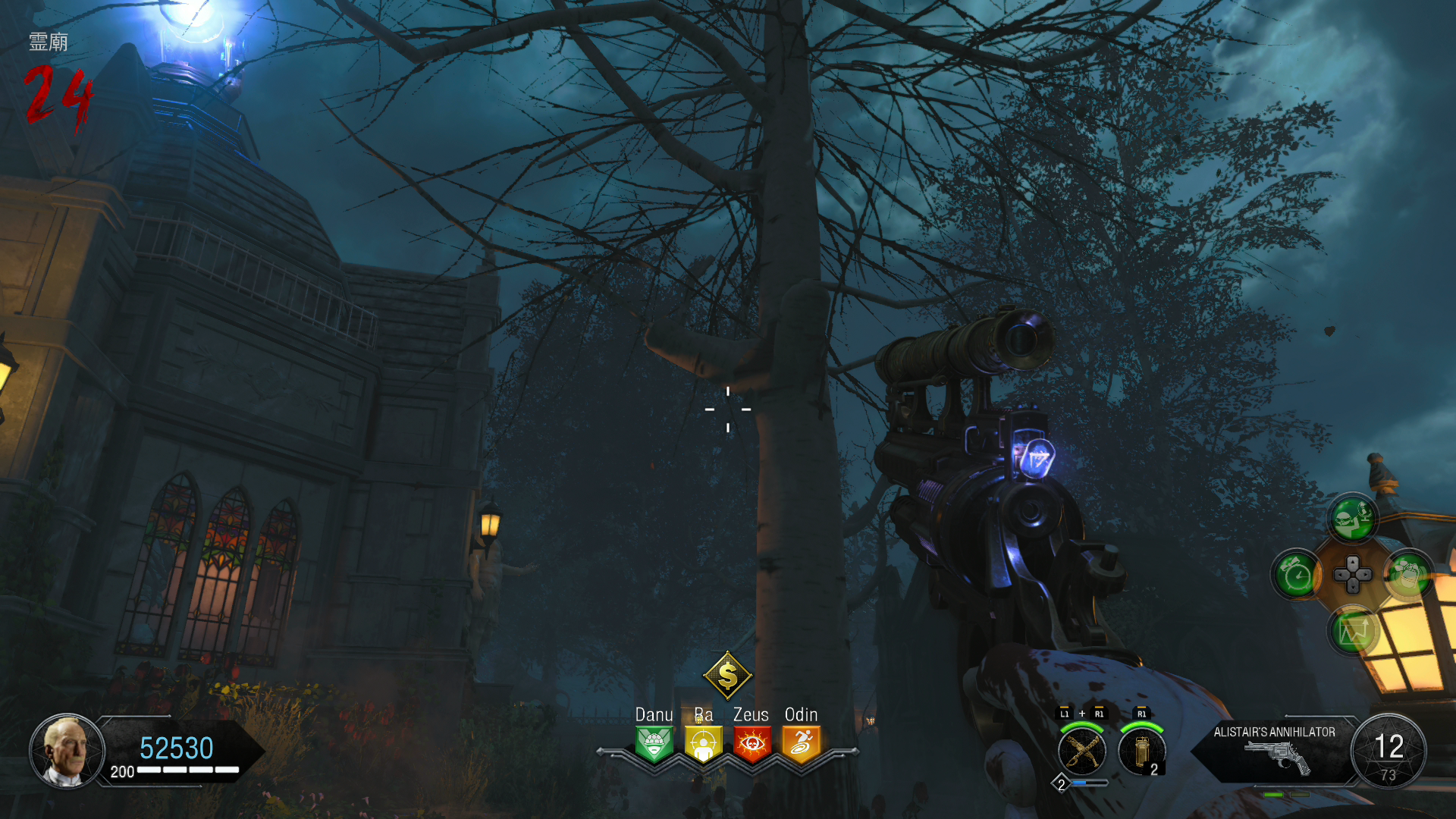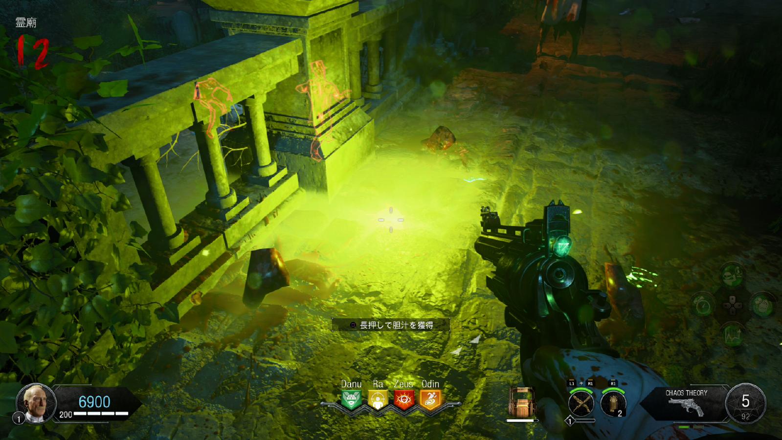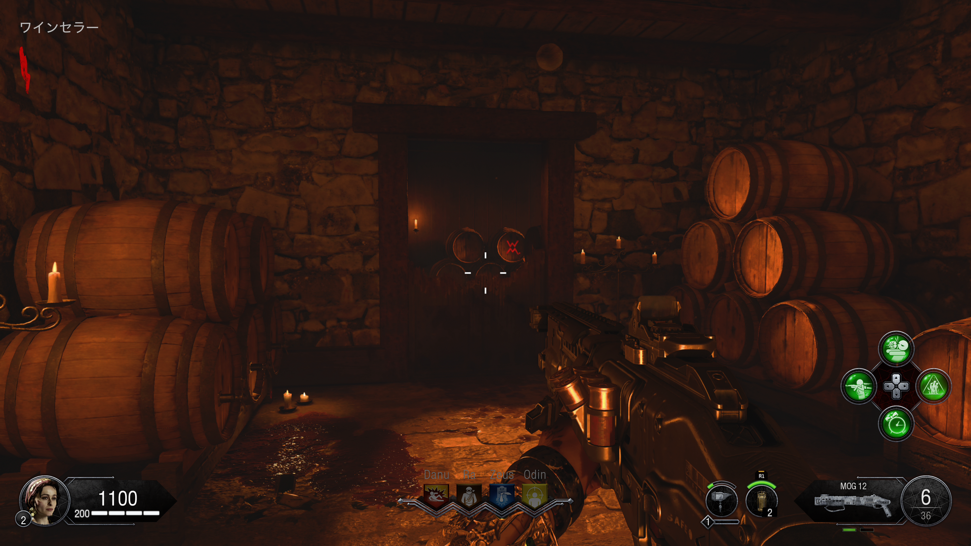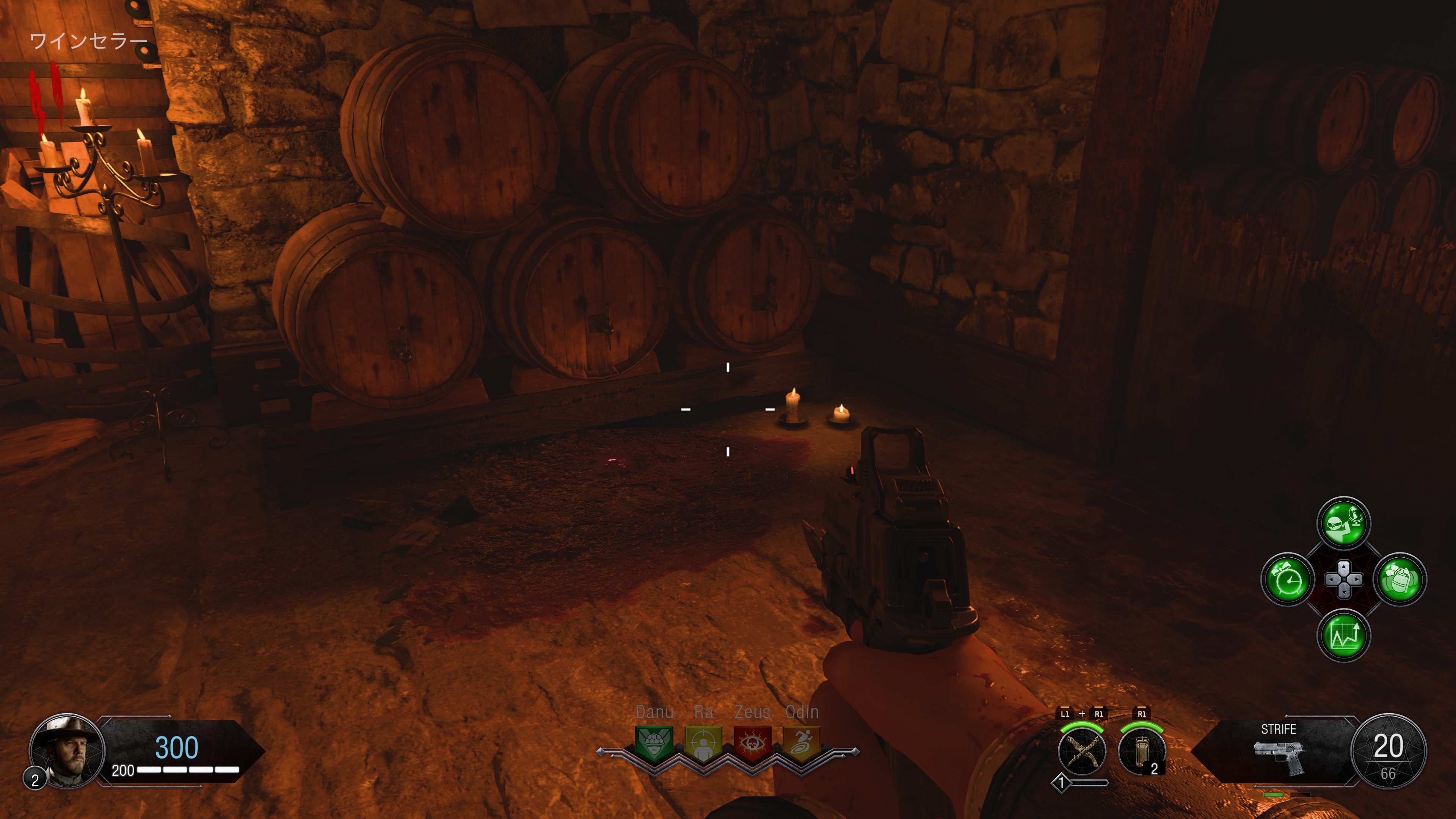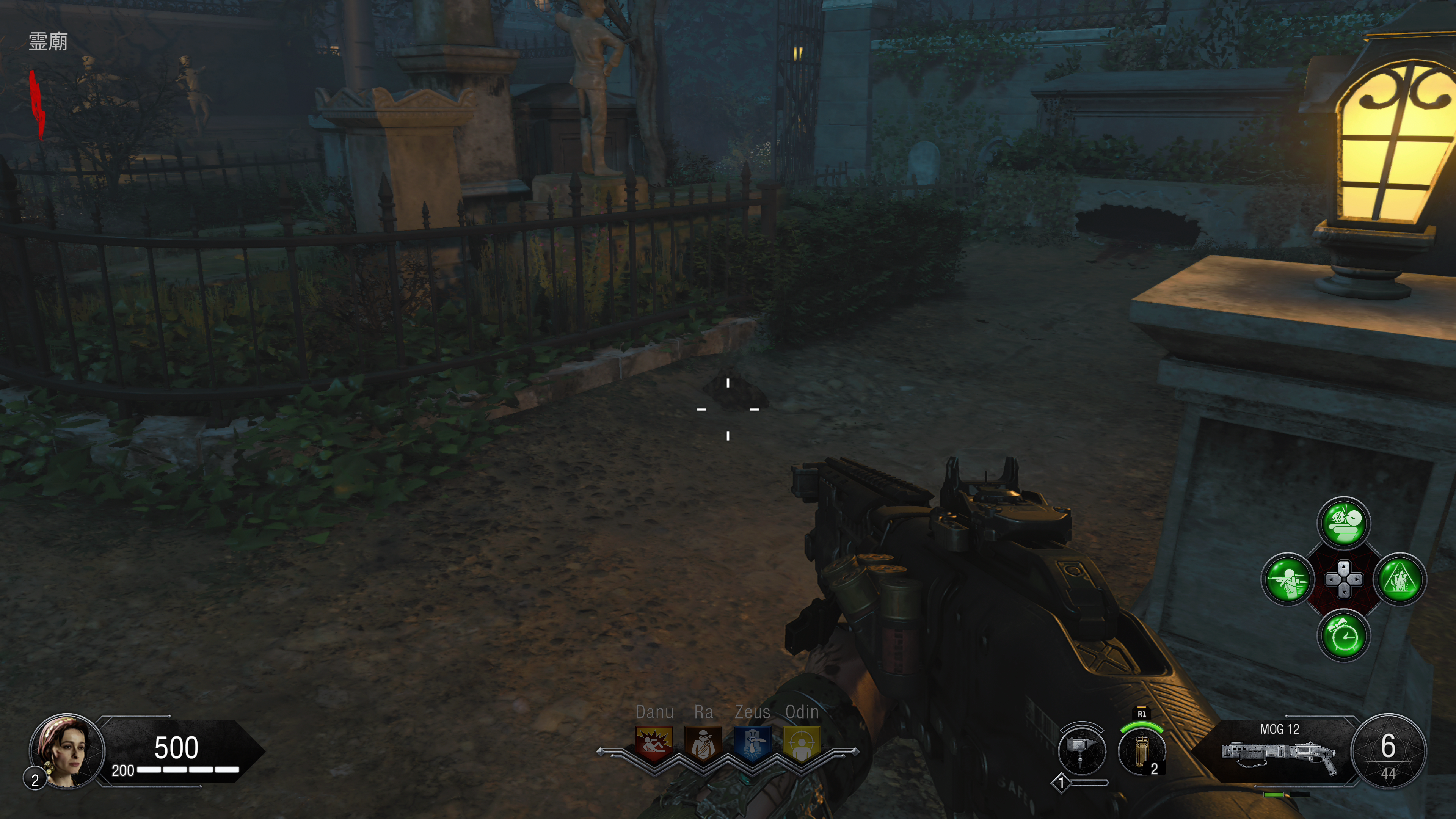 メインクエスト †パックアパンチ解放 †大階段でセンチネルの神器を使う。 その後、各部屋に石の入った壺があるので、打撃で破壊。周囲でゾンビを4キルすると石が輝くので、全て行う。候補地7か所。石は3か所 主寝室 ワインセラー(1) ワインセラー(2) 図書室 書斎 トロフィールーム 寝室廊下 石はチャージが完了すると、中を覗き込むことができる。 時計 ビリヤードルーム、メインホール、ダイニングルームに時計があるのでインタラクト。 インタラクトすると地面に紋章が現れるので、その中で一定時間待機。 完了すると音叉が出てくるので拾う。また、クリアでトロフィー「オンザクロック」入手。 PERK 表示されたPERKの像へ移動。 周辺にヴァンパイアが現れるので全員倒す。 完了すると音叉が出てくるので拾う。 人形 2階玄関ホールに人形があるのでインタラクト。幽霊が現れる。 幽霊の周囲に行くと移動するので、近づいては追いかけるを繰り返す。 最終的に墓地まで移動。 完了すると音叉を落とすので拾う。 女性の絵画 流れは人形と一緒。ゴールは温室テラス。 ロープの輪っか 流れは人形と一緒。 少女と老人 流れは人形と一緒。 悪そうな顔の女 流れは人形と一緒。 聖書 書斎の本棚。 流れは人形と一緒。 音叉を三つ入手したら、森のテラスにある玄関の黒い塊に使用。玄関が開くので奥へ進む。 一番奥にPAPがある。 途中、狼男が出現するので注意。 一番奥まで行くとPAPがある。 シルバー弾入手 †まず、6つのパーツを集める。候補地はそれぞれ三か所 ボトル 図書室からメインホールへ抜ける途中の西廊下のソファー ダイニングルームの時計の裏側にある赤いテーブル 燭台 メインホールの壁の前の壺 ビリヤードルームの床 ワインセラー右側の壁のあたり 皿 ワインセラー、テーブルの上 ワインセラー、棚の上 糞 墓地と霊廟のあたり。霊廟から屋敷側を見て正面の壁の左端 墓地と霊廟の階段の近くの木の後ろ 木炭 ビリヤード室の暖炉 メインホールの暖炉 硫黄 その後、ワインセラーの組立台で銀を作る。 ALISTER'S FOLLY †図書室に暗号を入力できるパネルがある。 マップ各地に正解の記号が点在しているので、それを確認して入力する。 青のシンボルは墓~霊廟あたり。候補地4箇所。 緑のシンボルは庭園。候補地4箇所。 黄色のシンボルは森のテラス。候補地4箇所。 赤のシンボルは、主寝室、西ギャラリー、ワインセラー、ダイニングルーム。 どれもMAP外やバリケードの外にある。 正解のコードを入力すると銃が取れるようになる。 一度入手すると、M.BOXでも出現するようになる。 バリスティックシールド †各地にある盾のパーツを組立台で組み立てる。部品はそれぞれ3箇所にランダムでスポーン シールドプレート メーター 喫煙室で組み立てる。 Chaos Theory †狼男をシルバー弾で倒すと、狼人間カオス素材を落とすので入手。 その後、温室研究所でプリママテリア装置を起動。 暫く待つと装置の側面にプリママテリアが出てくるので入手。 図書室へ行き、バリスティックシールドで左側の本棚を殴ると、隠し空間が現れて、銃のパーツが入手できる。 再度温室研究所へ向かい、ALISTER'S FOLLY を Chaos Theory 組立台でパワーアップすることができる。 R2でチャージショット発射可能。 Alistair's Annihilator †霊廟の正面、消えているランプの前あたりで、Chaos Theoryのチャージショットでヴァンパイアを倒す。黄色い何かに当ててる間にさらに竜巻を当てるといいのかもしれない。 そのうち、ヴァンパイアが胆汁を落とす。 何個か胆汁を拾っていると、霊廟正面の墓が赤く光る。 インタラクトすると、赤いヴァンパイアが現れるので倒す。 すると、吸血鬼カオス素材が手に入るので入手。 これを温室研究所のプリママテリアにかけるとパーツが一つ入手できる。 次に、霊廟の正面、1ラウンドごとに、ランプが一つ追加で点灯する。 これをChaos Theoryで撃つと、他のランプが点灯する。一定時間以内にランプを撃ち続けていると、3箇所目くらいで蝙蝠が空に向かって飛び立つ。それをChaos Theoryで撃ち落とすと蝙蝠カオス素材が入手できる。 これを温室研究所のプリママテリアにかけるとパーツが一つ入手できる。 最後に森で、土に埋まってキノコが生えている骨の周囲にいく。 この骨の上で、チャージショットをゾンビを直接当て、黄色い何かが発動すると、地面を掘ってパーツが出現する。三か所のうち正解は一か所。 これを入手。 三つのパーツを集めた後、温室研究所の Alistair's Annihilator組立台で、Chaos TheoryをAlistair's Annihilatorに加工できるようになる。 結晶からチャレンジを受ける †PAP解放の際にチャージした結晶を再度インタラクトすると、イラストが見える。それに対応したクエストをこなす必要がある。 騎士 †ALISTER'S ANNIHILATOR とシールド必須。 図書室のファイアゲートの罠を作成する。 ファイアゲートを起動するためのアイテムはランダムで各地に散らばってる。 暖炉にランダムに決まる順番に