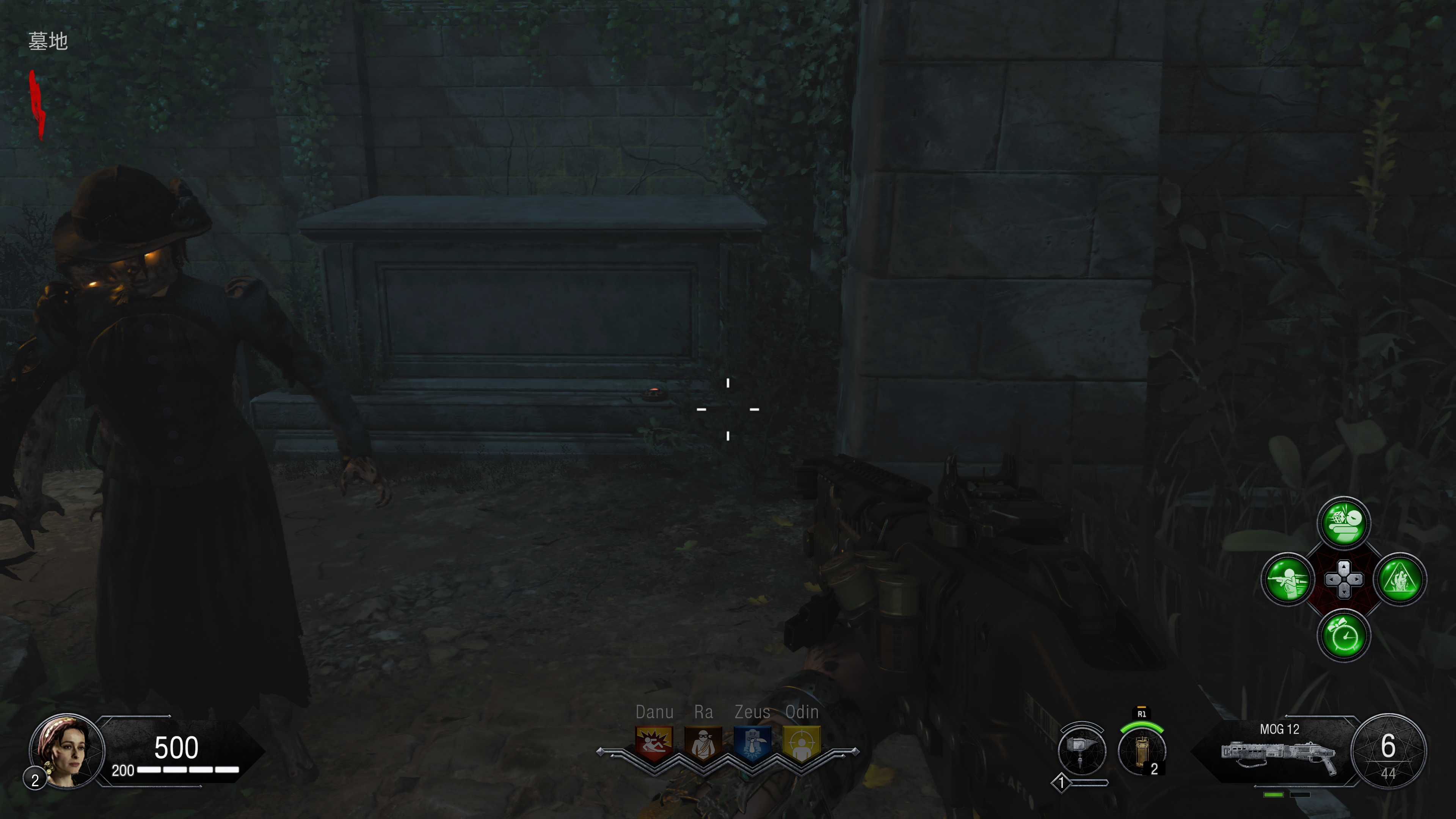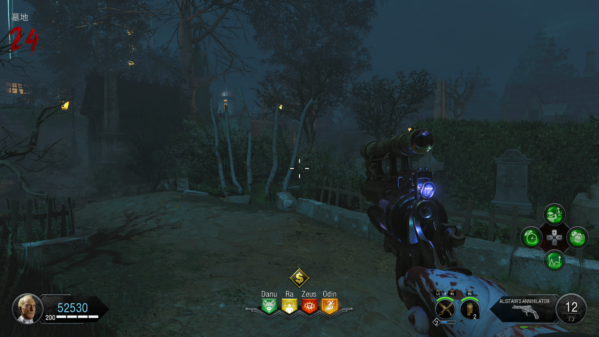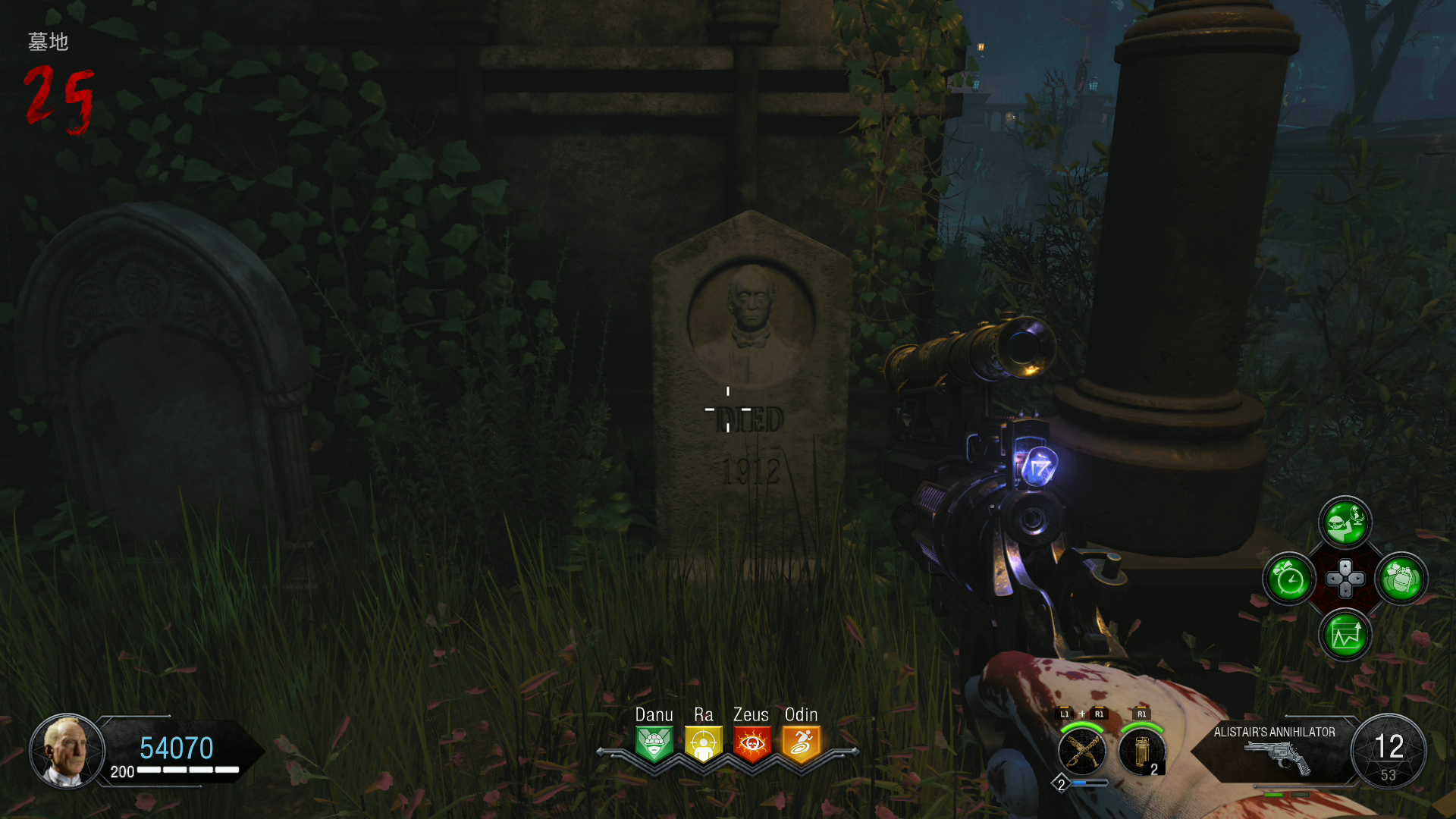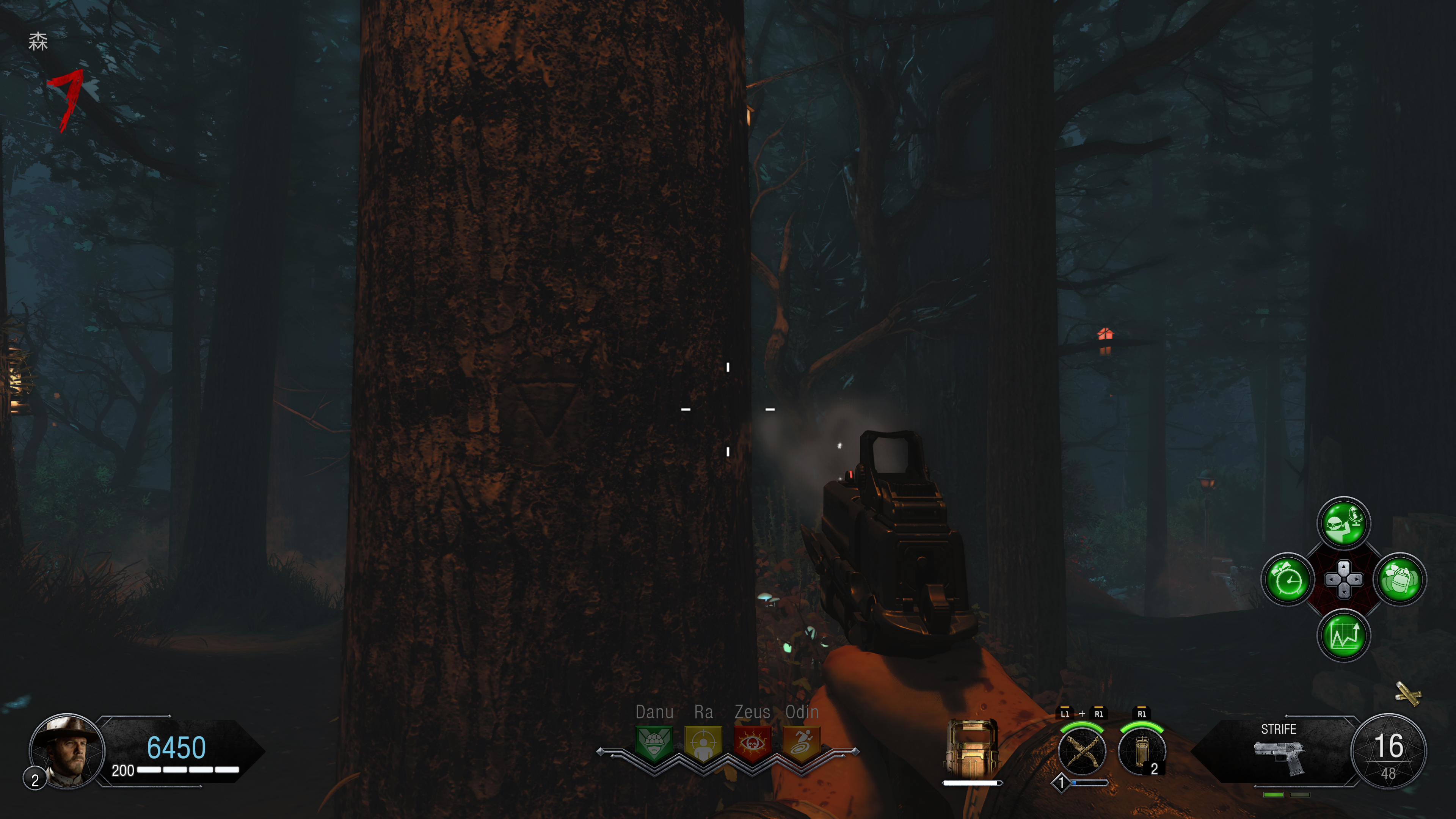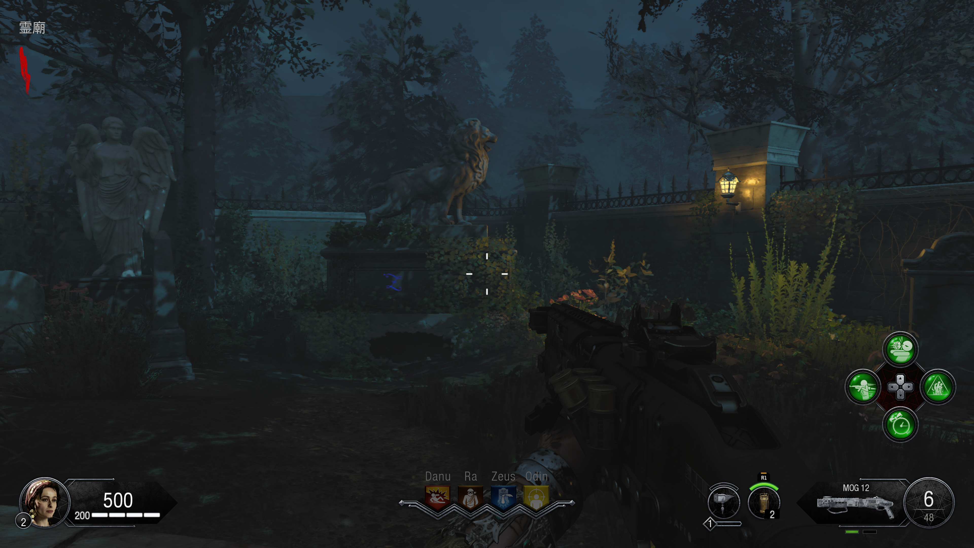 メインクエスト †パックアパンチ解放 †大階段でセンチネルの神器を使う。 その後、各部屋に石の入った壺があるので、打撃で破壊。周囲でゾンビを4キルすると石が輝くので、全て行う。候補地7か所。石は3か所 主寝室 ワインセラー(1) ワインセラー(2) 図書室 書斎 トロフィールーム 寝室廊下 石はチャージが完了すると、中を覗き込むことができる。 時計 ビリヤードルーム、メインホール、ダイニングルームに時計があるのでインタラクト。 インタラクトすると地面に紋章が現れるので、その中で一定時間待機。 完了すると音叉が出てくるので拾う。また、クリアでトロフィー「オンザクロック」入手。 PERK 表示されたPERKの像へ移動。 周辺にヴァンパイアが現れるので全員倒す。 完了すると音叉が出てくるので拾う。 人形 2階玄関ホールに人形があるのでインタラクト。幽霊が現れる。 幽霊の周囲に行くと移動するので、近づいては追いかけるを繰り返す。 最終的に墓地まで移動。 完了すると音叉を落とすので拾う。 女性の絵画 流れは人形と一緒。ゴールは温室テラス。 ロープの輪っか 流れは人形と一緒。 少女と老人 流れは人形と一緒。 悪そうな顔の女 流れは人形と一緒。 聖書 書斎の本棚。 流れは人形と一緒。 音叉を三つ入手したら、森のテラスにある玄関の黒い塊に使用。玄関が開くので奥へ進む。 一番奥にPAPがある。 途中、狼男が出現するので注意。 一番奥まで行くとPAPがある。 シルバー弾入手 †まず、6つのパーツを集める。候補地はそれぞれ三か所 ボトル 図書室からメインホールへ抜ける途中の西廊下のソファー ダイニングルームの時計の裏側にある赤いテーブル 燭台 メインホールの壁の前の壺 ビリヤードルームの床 ワインセラー右側の壁のあたり 皿 ワインセラー、テーブルの上 ワインセラー、棚の上 糞 墓地と霊廟のあたり。霊廟から屋敷側を見て正面の壁の左端 墓地と霊廟の階段の近くの木の後ろ 木炭 ビリヤード室の暖炉 メインホールの暖炉 硫黄 その後、ワインセラーの組立台で銀を作る。 ALISTER'S FOLLY †図書室に暗号を入力できるパネルがある。 マップ各地に正解の記号が点在しているので、それを確認して入力する。 青のシンボルは墓~霊廟あたり。候補地4箇所。 緑のシンボルは庭園。候補地4箇所。 黄色のシンボルは森のテラス。候補地4箇所。 赤のシンボルは、主寝室、西ギャラリー、ワインセラー、ダイニングルーム。 どれもMAP外やバリケードの外にある。 正解のコードを入力すると銃が取れるようになる。 一度入手すると、M.BOXでも出現するようになる。 バリスティックシールド †各地にある盾のパーツを組立台で組み立てる。部品はそれぞれ3箇所にランダムでスポーン シールドプレート メーター 喫煙室で組み立てる。 Chaos Theory †狼男をシルバー弾で倒すと、狼人間カオス素材を落とすので入手。 その後、温室研究所でプリママテリア装置を起動。 暫く待つと装置の側面にプリママテリアが出てくるので入手。 図書室へ行き、バリスティックシールドで左側の本棚を殴ると、隠し空間が現れて、銃のパーツが入手できる。 再度温室研究所へ向かい、ALISTER'S FOLLY を Chaos Theory 組立台でパワーアップすることができる。 R2でチャージショット発射可能。 Alistair's Annihilator †霊廟の正面、消えているランプの前あたりで、Chaos Theoryのチャージショットでヴァンパイアを倒す。黄色い何かに当ててる間にさらに竜巻を当てるといいのかもしれない。 そのうち、ヴァンパイアが胆汁を落とす。 何個か胆汁を拾っていると、霊廟正面の墓が赤く光る。 インタラクトすると、赤いヴァンパイアが現れるので倒す。 すると、吸血鬼カオス素材が手に入るので入手。 これを温室研究所のプリママテリアにかけるとパーツが一つ入手できる。 次に、霊廟の正面、1ラウンドごとに、ランプが一つ追加で点灯する。 これをChaos Theoryで撃つと、他のランプが点灯する。一定時間以内にランプを撃ち続けていると、3箇所目くらいで蝙蝠が空に向かって飛び立つ。それをChaos Theoryで撃ち落とすと蝙蝠カオス素材が入手できる。 これを温室研究所のプリママテリアにかけるとパーツが一つ入手できる。 最後に森で、土に埋まってキノコが生えている骨の周囲にいく。 この骨の上で、チャージショットをゾンビを直接当て、黄色い何かが発動すると、地面を掘ってパーツが出現する。三か所のうち正解は一か所。 これを入手。 三つのパーツを集めた後、温室研究所の Alistair's Annihilator組立台で、Chaos TheoryをAlistair's Annihilatorに加工できるようになる。 結晶からチャレンジを受ける †PAP解放の際にチャージした結晶を再度インタラクトすると、イラストが見える。それに対応したクエストをこなす必要がある。 騎士 †ALISTER'S ANNIHILATOR とシールド必須。 図書室のファイアゲートの罠を作成する。 ファイアゲートを起動するためのアイテムはランダムで各地に散らばってる。 暖炉にランダムに決まる順番に