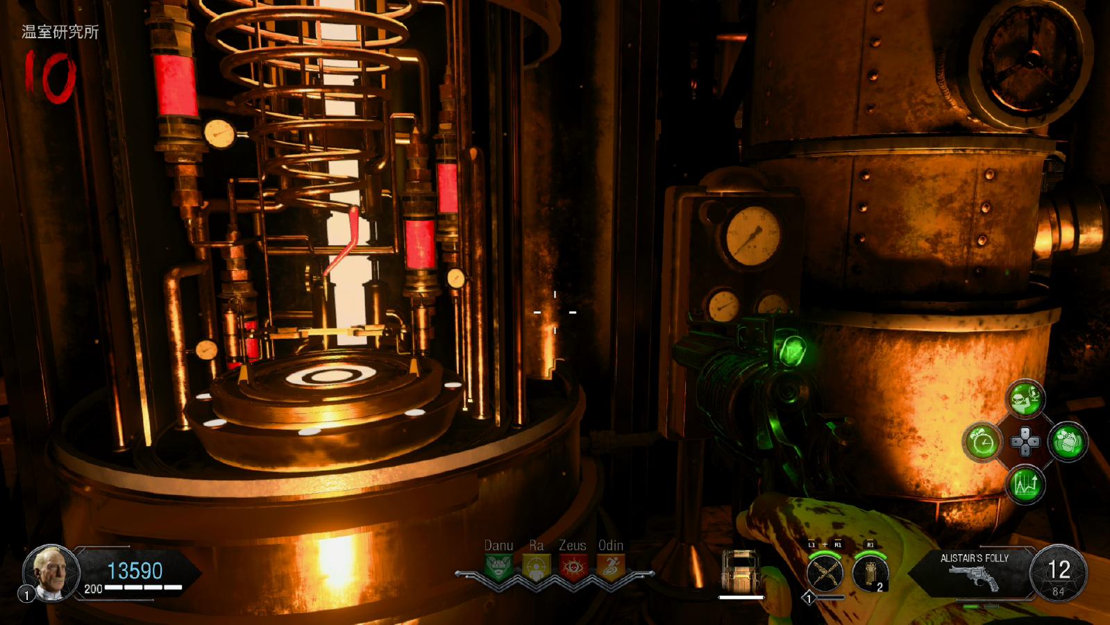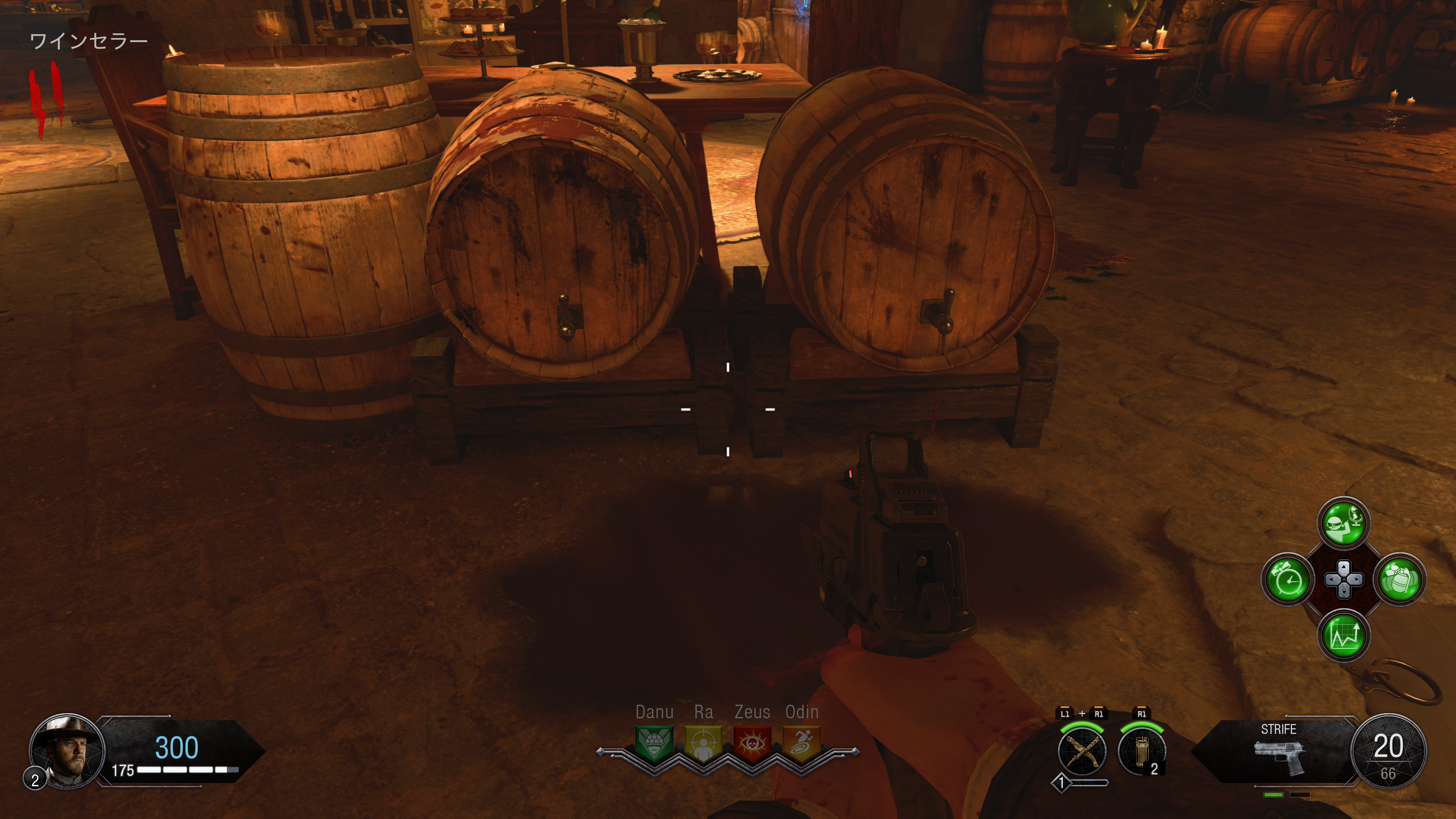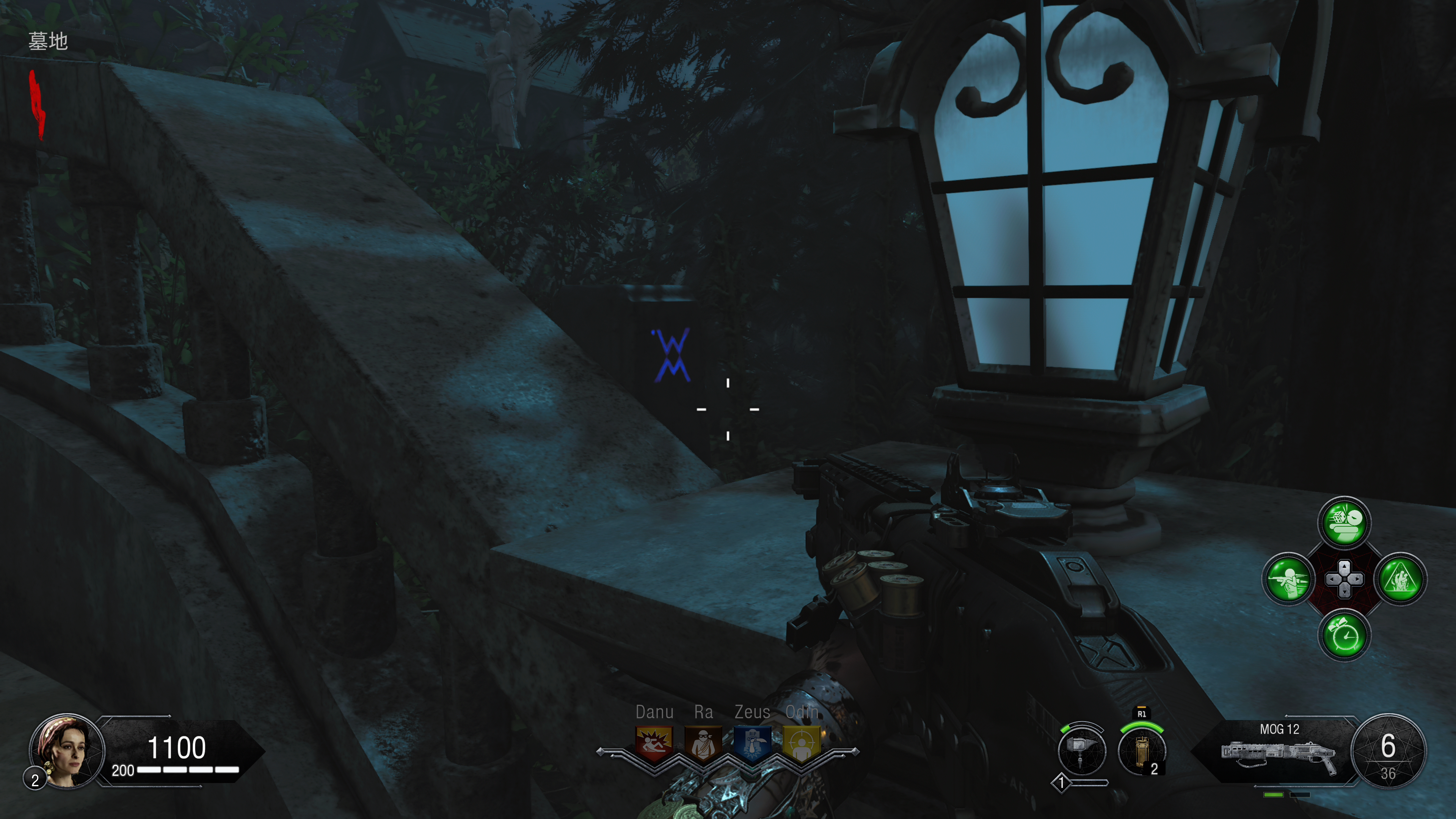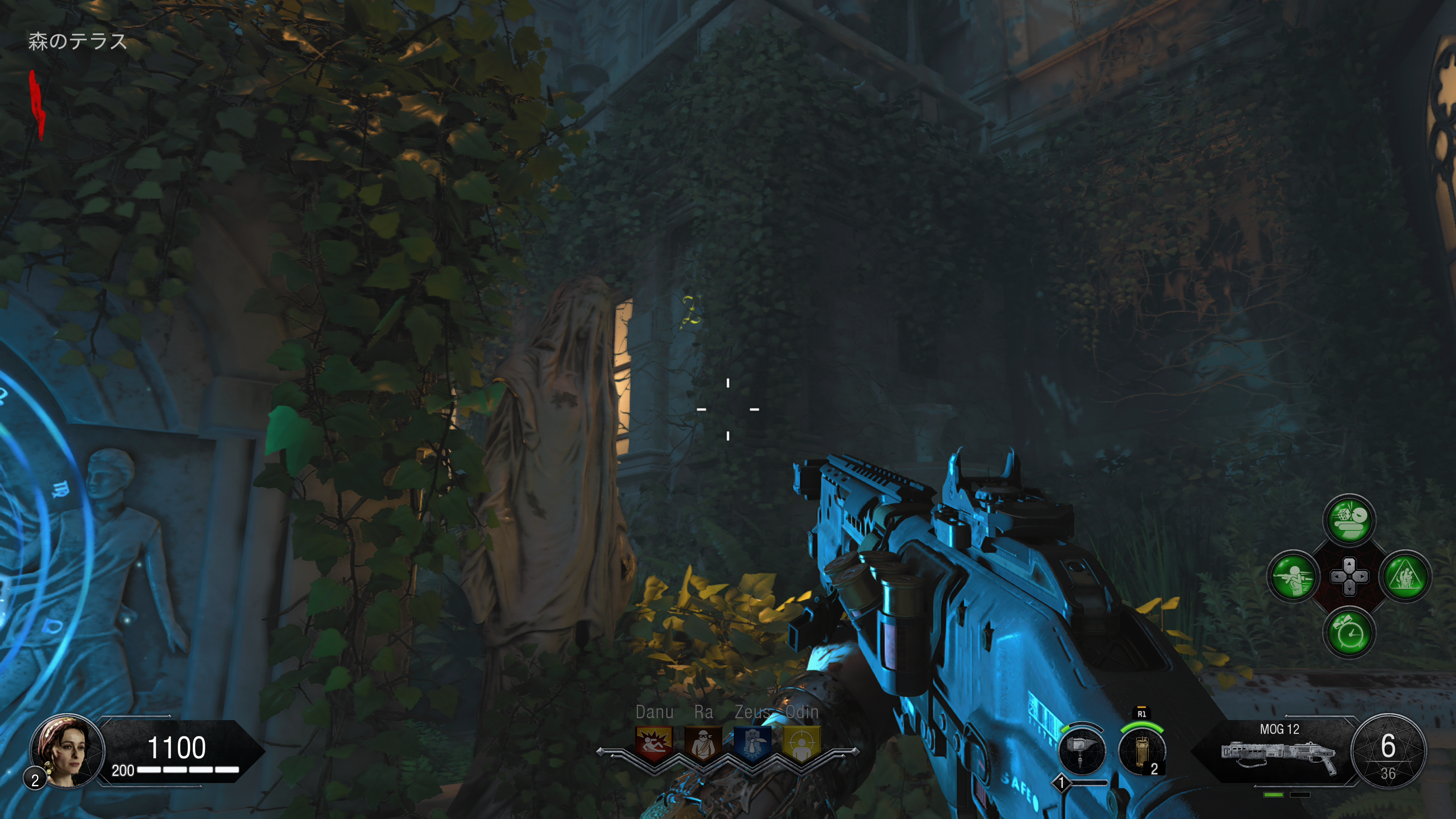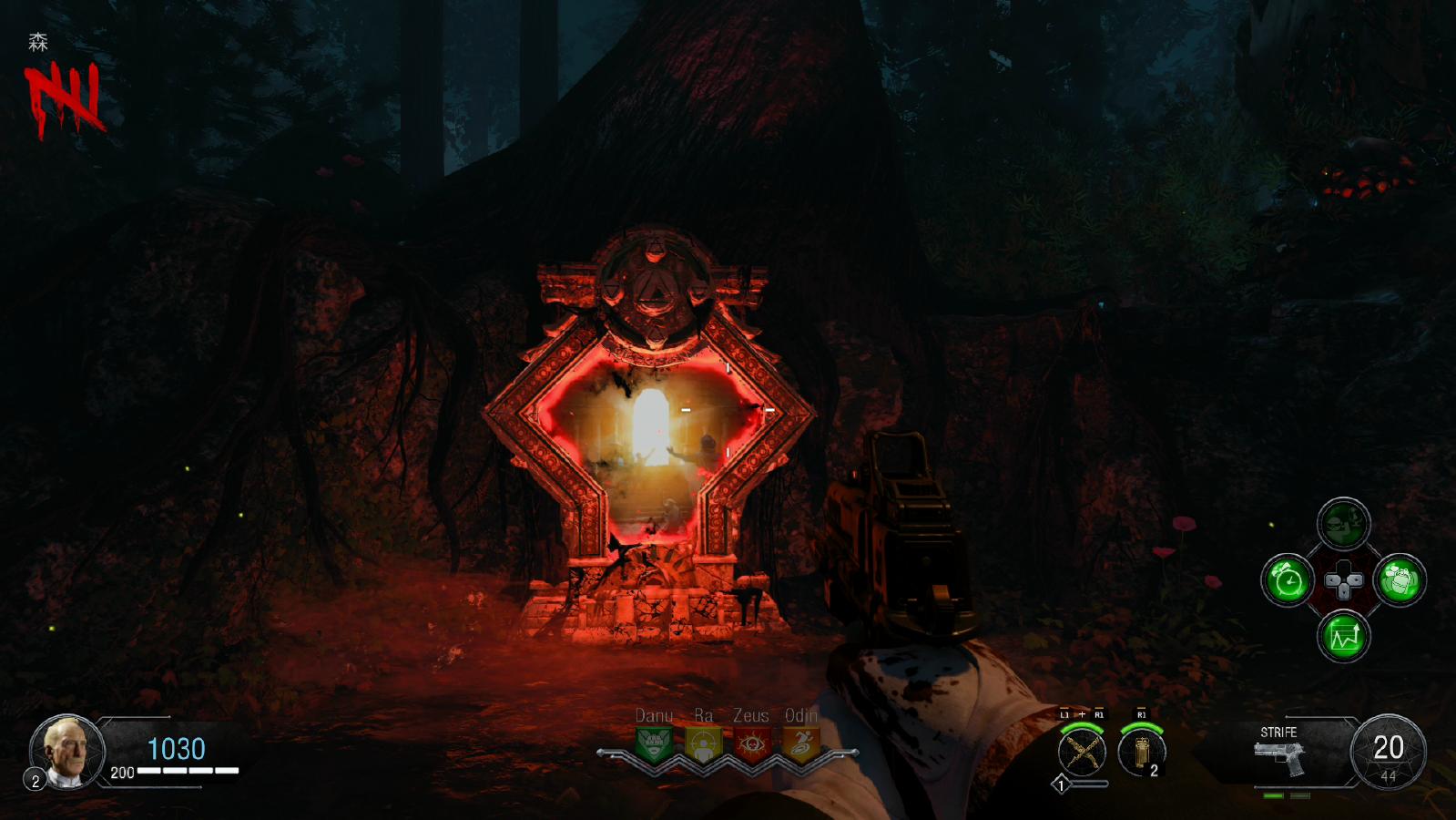 メインクエスト †パックアパンチ解放 †大階段でセンチネルの神器を使う。 その後、各部屋に石の入った壺があるので、打撃で破壊。周囲でゾンビを4キルすると石が輝くので、全て行う。候補地7か所。石は3か所 主寝室 ワインセラー(1) ワインセラー(2) 図書室 書斎 トロフィールーム 寝室廊下 石はチャージが完了すると、中を覗き込むことができる。 時計 ビリヤードルーム、メインホール、ダイニングルームに時計があるのでインタラクト。 インタラクトすると地面に紋章が現れるので、その中で一定時間待機。 完了すると音叉が出てくるので拾う。また、クリアでトロフィー「オンザクロック」入手。 PERK 表示されたPERKの像へ移動。 周辺にヴァンパイアが現れるので全員倒す。 完了すると音叉が出てくるので拾う。 人形 2階玄関ホールに人形があるのでインタラクト。幽霊が現れる。 幽霊の周囲に行くと移動するので、近づいては追いかけるを繰り返す。 最終的に墓地まで移動。 完了すると音叉を落とすので拾う。 女性の絵画 流れは人形と一緒。ゴールは温室テラス。 ロープの輪っか 流れは人形と一緒。 少女と老人 流れは人形と一緒。 悪そうな顔の女 流れは人形と一緒。 聖書 書斎の本棚。 流れは人形と一緒。 音叉を三つ入手したら、森のテラスにある玄関の黒い塊に使用。玄関が開くので奥へ進む。 一番奥にPAPがある。 途中、狼男が出現するので注意。 一番奥まで行くとPAPがある。 シルバー弾入手 †まず、6つのパーツを集める。候補地はそれぞれ三か所 ボトル 図書室からメインホールへ抜ける途中の西廊下のソファー ダイニングルームの時計の裏側にある赤いテーブル 燭台 メインホールの壁の前の壺 ビリヤードルームの床 ワインセラー右側の壁のあたり 皿 ワインセラー、テーブルの上 ワインセラー、棚の上 糞 墓地と霊廟のあたり。霊廟から屋敷側を見て正面の壁の左端 墓地と霊廟の階段の近くの木の後ろ 木炭 ビリヤード室の暖炉 メインホールの暖炉 硫黄 その後、ワインセラーの組立台で銀を作る。 ALISTER'S FOLLY †図書室に暗号を入力できるパネルがある。 マップ各地に正解の記号が点在しているので、それを確認して入力する。 青のシンボルは墓~霊廟あたり。候補地4箇所。 緑のシンボルは庭園。候補地4箇所。 黄色のシンボルは森のテラス。候補地4箇所。 赤のシンボルは、主寝室、西ギャラリー、ワインセラー、ダイニングルーム。 どれもMAP外やバリケードの外にある。 正解のコードを入力すると銃が取れるようになる。 一度入手すると、M.BOXでも出現するようになる。 バリスティックシールド †各地にある盾のパーツを組立台で組み立てる。部品はそれぞれ3箇所にランダムでスポーン シールドプレート メーター 喫煙室で組み立てる。 Chaos Theory †狼男をシルバー弾で倒すと、狼人間カオス素材を落とすので入手。 その後、温室研究所でプリママテリア装置を起動。 暫く待つと装置の側面にプリママテリアが出てくるので入手。 図書室へ行き、バリスティックシールドで左側の本棚を殴ると、隠し空間が現れて、銃のパーツが入手できる。 再度温室研究所へ向かい、ALISTER'S FOLLY を Chaos Theory 組立台でパワーアップすることができる。 R2でチャージショット発射可能。 Alistair's Annihilator †霊廟の正面、消えているランプの前あたりで、Chaos Theoryのチャージショットでヴァンパイアを倒す。黄色い何かに当ててる間にさらに竜巻を当てるといいのかもしれない。 そのうち、ヴァンパイアが胆汁を落とす。 何個か胆汁を拾っていると、霊廟正面の墓が赤く光る。 インタラクトすると、赤いヴァンパイアが現れるので倒す。 すると、吸血鬼カオス素材が手に入るので入手。 これを温室研究所のプリママテリアにかけるとパーツが一つ入手できる。 次に、霊廟の正面、1ラウンドごとに、ランプが一つ追加で点灯する。 これをChaos Theoryで撃つと、他のランプが点灯する。一定時間以内にランプを撃ち続けていると、3箇所目くらいで蝙蝠が空に向かって飛び立つ。それをChaos Theoryで撃ち落とすと蝙蝠カオス素材が入手できる。 これを温室研究所のプリママテリアにかけるとパーツが一つ入手できる。 最後に森で、土に埋まってキノコが生えている骨の周囲にいく。 この骨の上で、チャージショットをゾンビを直接当て、黄色い何かが発動すると、地面を掘ってパーツが出現する。三か所のうち正解は一か所。 これを入手。 三つのパーツを集めた後、温室研究所の Alistair's Annihilator組立台で、Chaos TheoryをAlistair's Annihilatorに加工できるようになる。 結晶からチャレンジを受ける †PAP解放の際にチャージした結晶を再度インタラクトすると、イラストが見える。それに対応したクエストをこなす必要がある。 騎士 †ALISTER'S ANNIHILATOR とシールド必須。 図書室のファイアゲートの罠を作成する。 ファイアゲートを起動するためのアイテムはランダムで各地に散らばってる。 暖炉にランダムに決まる順番に