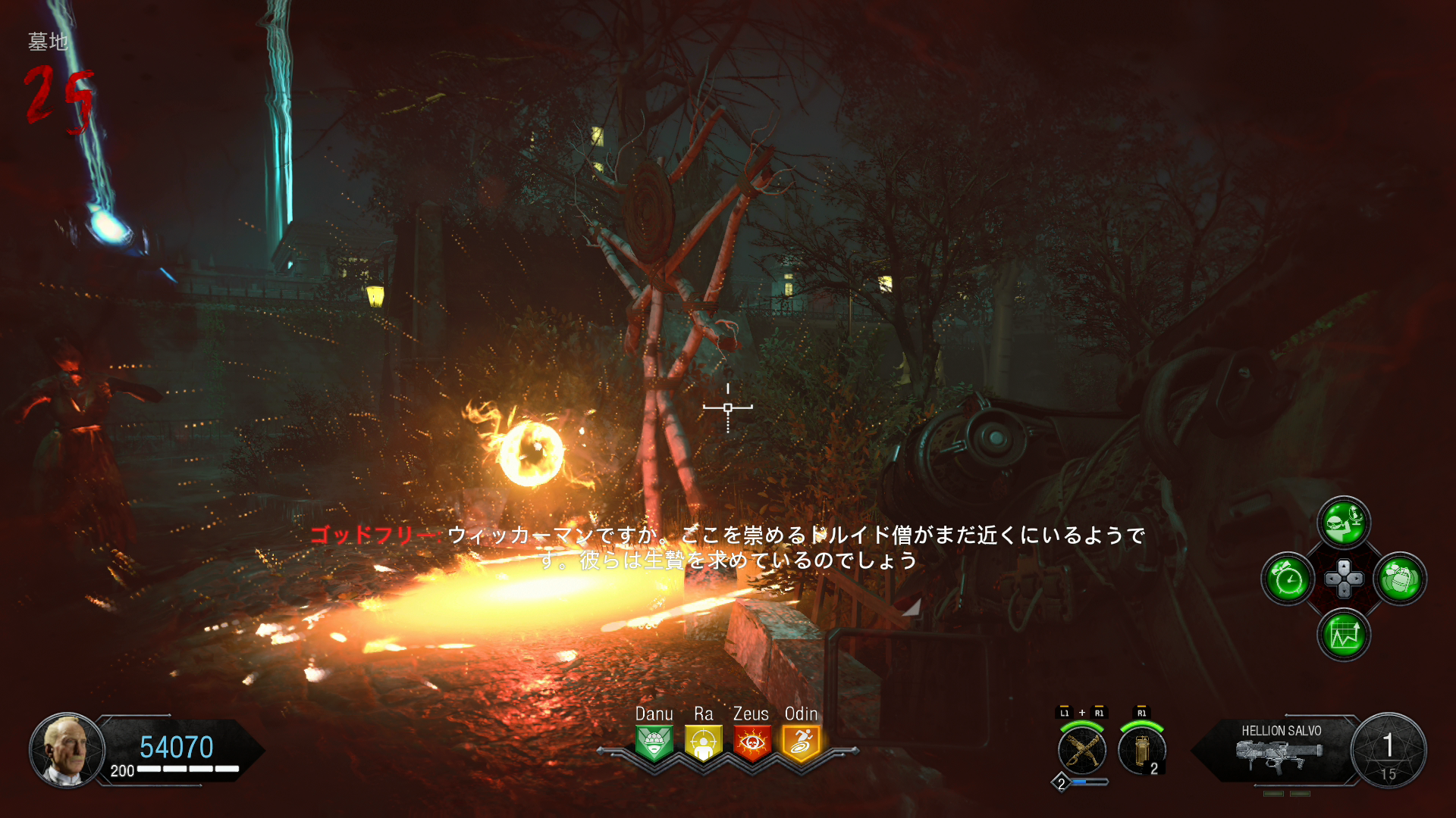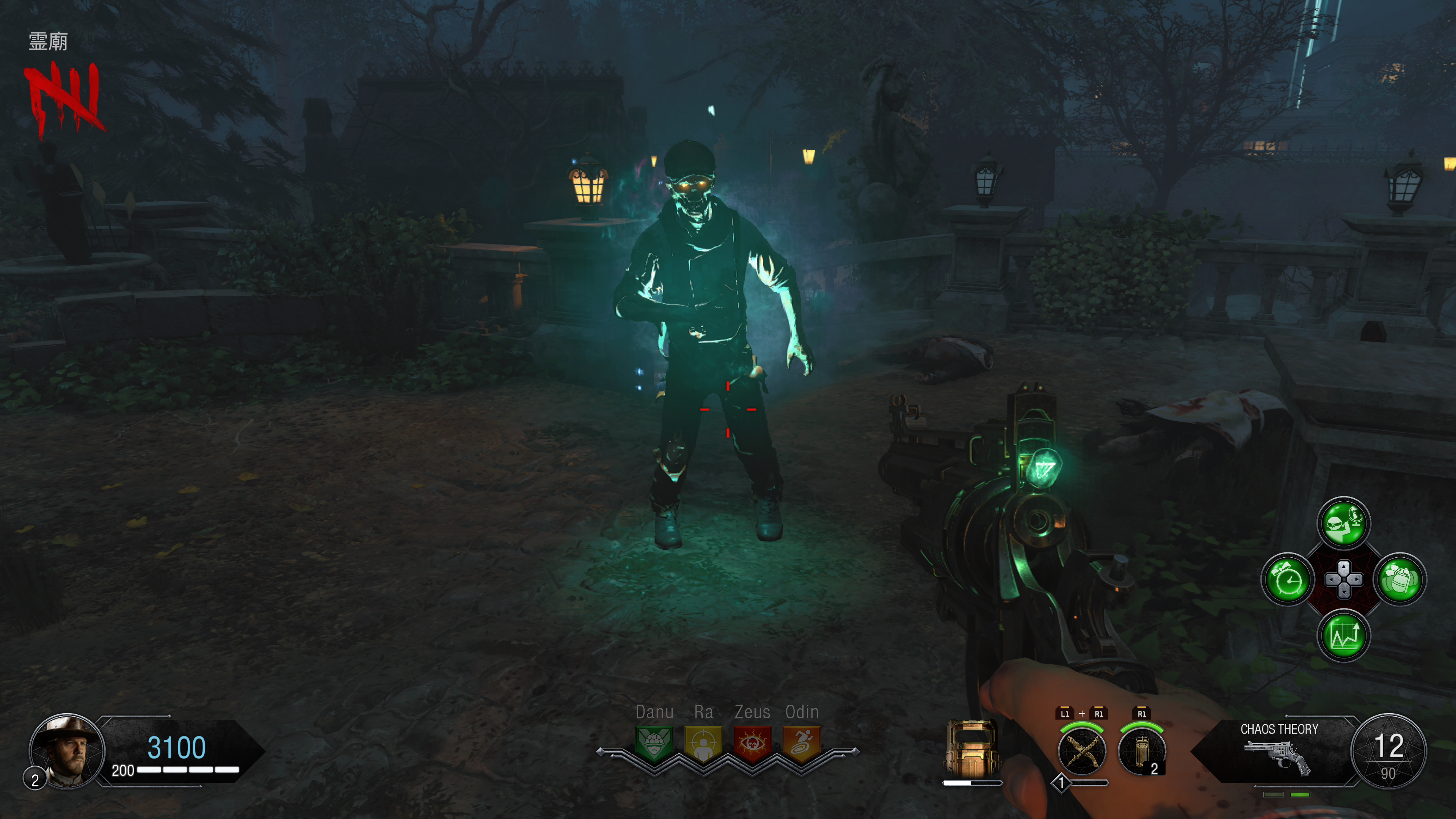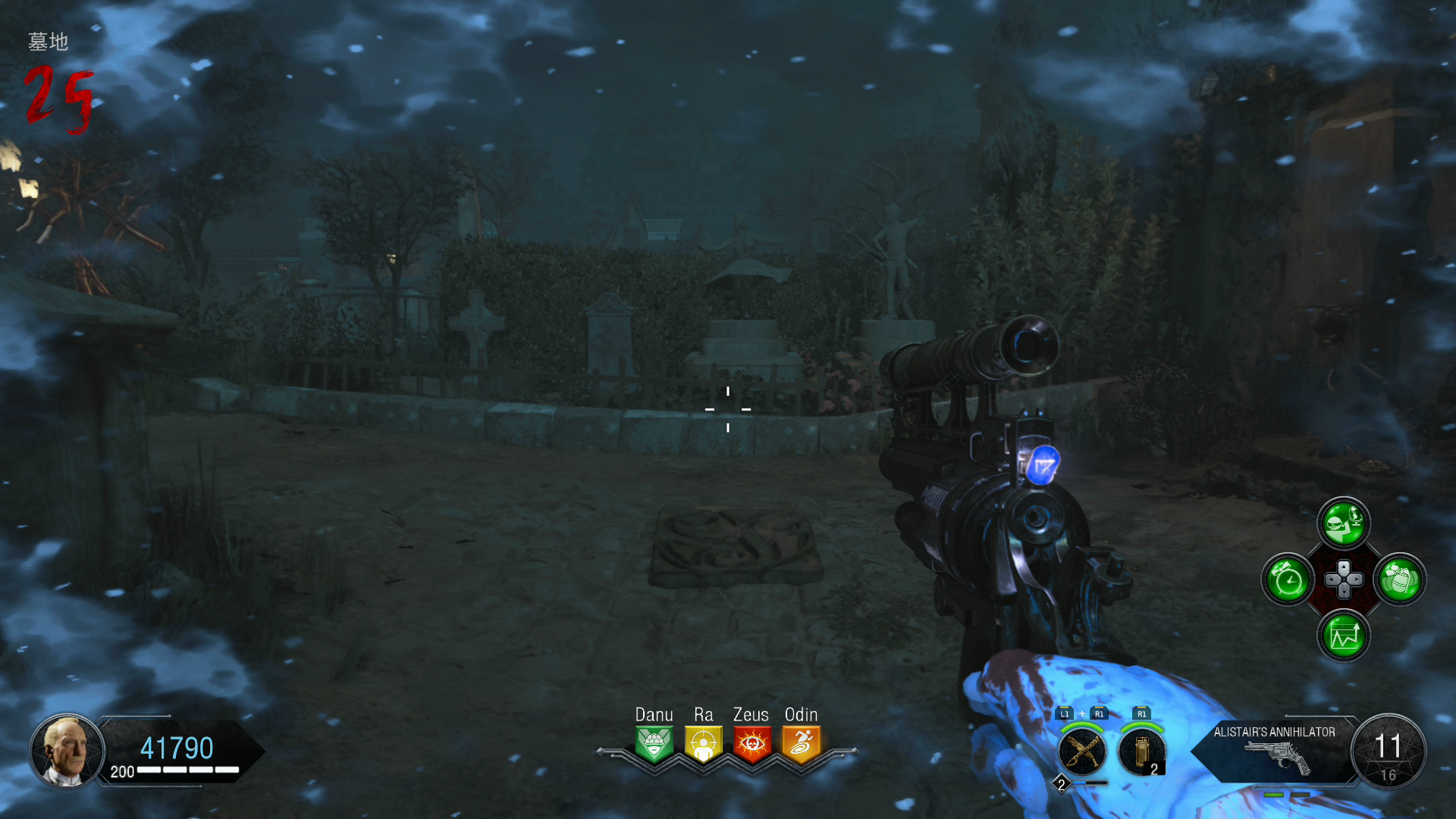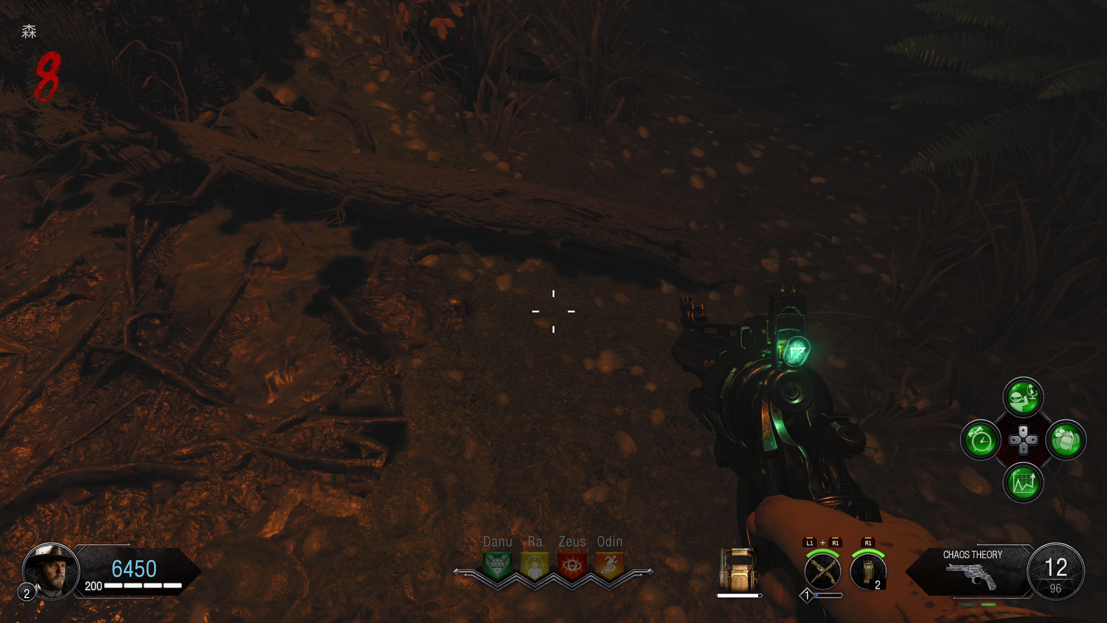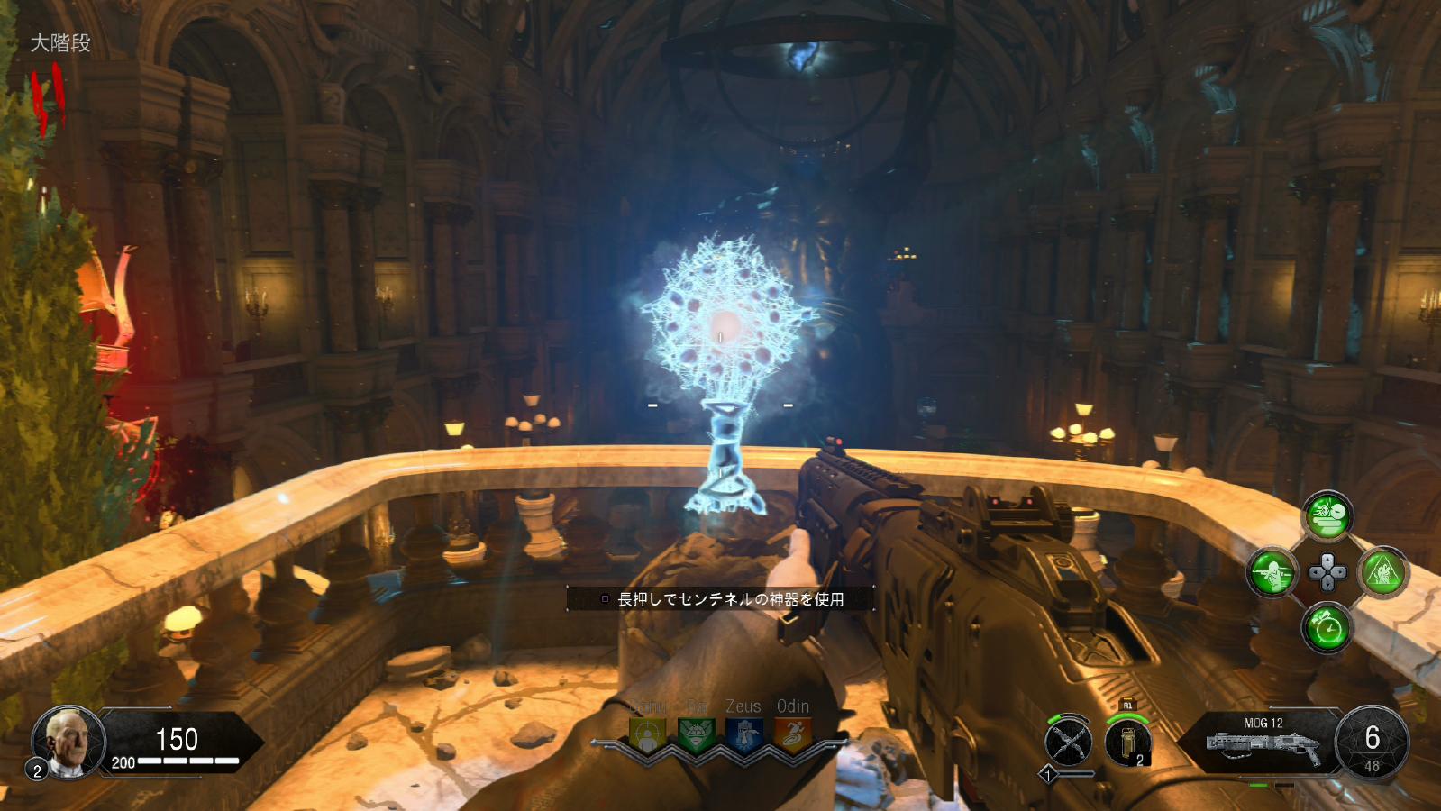 メインクエスト †パックアパンチ解放 †大階段でセンチネルの神器を使う。 その後、各部屋に石の入った壺があるので、打撃で破壊。周囲でゾンビを4キルすると石が輝くので、全て行う。候補地7か所。石は3か所 主寝室 ワインセラー(1) ワインセラー(2) 図書室 書斎 トロフィールーム 寝室廊下 石はチャージが完了すると、中を覗き込むことができる。 時計 ビリヤードルーム、メインホール、ダイニングルームに時計があるのでインタラクト。 インタラクトすると地面に紋章が現れるので、その中で一定時間待機。 完了すると音叉が出てくるので拾う。また、クリアでトロフィー「オンザクロック」入手。 PERK 表示されたPERKの像へ移動。 周辺にヴァンパイアが現れるので全員倒す。 完了すると音叉が出てくるので拾う。 人形 2階玄関ホールに人形があるのでインタラクト。幽霊が現れる。 幽霊の周囲に行くと移動するので、近づいては追いかけるを繰り返す。 最終的に墓地まで移動。 完了すると音叉を落とすので拾う。 女性の絵画 流れは人形と一緒。ゴールは温室テラス。 ロープの輪っか 流れは人形と一緒。 少女と老人 流れは人形と一緒。 悪そうな顔の女 流れは人形と一緒。 聖書 書斎の本棚。 流れは人形と一緒。 音叉を三つ入手したら、森のテラスにある玄関の黒い塊に使用。玄関が開くので奥へ進む。 一番奥にPAPがある。 途中、狼男が出現するので注意。 一番奥まで行くとPAPがある。 シルバー弾入手 †まず、6つのパーツを集める。候補地はそれぞれ三か所 ボトル 図書室からメインホールへ抜ける途中の西廊下のソファー ダイニングルームの時計の裏側にある赤いテーブル 燭台 メインホールの壁の前の壺 ビリヤードルームの床 ワインセラー右側の壁のあたり 皿 ワインセラー、テーブルの上 ワインセラー、棚の上 糞 墓地と霊廟のあたり。霊廟から屋敷側を見て正面の壁の左端 墓地と霊廟の階段の近くの木の後ろ 木炭 ビリヤード室の暖炉 メインホールの暖炉 硫黄 その後、ワインセラーの組立台で銀を作る。 ALISTER'S FOLLY †図書室に暗号を入力できるパネルがある。 マップ各地に正解の記号が点在しているので、それを確認して入力する。 青のシンボルは墓~霊廟あたり。候補地4箇所。 緑のシンボルは庭園。候補地4箇所。 黄色のシンボルは森のテラス。候補地4箇所。 赤のシンボルは、主寝室、西ギャラリー、ワインセラー、ダイニングルーム。 どれもMAP外やバリケードの外にある。 正解のコードを入力すると銃が取れるようになる。 一度入手すると、M.BOXでも出現するようになる。 バリスティックシールド †各地にある盾のパーツを組立台で組み立てる。部品はそれぞれ3箇所にランダムでスポーン シールドプレート メーター 喫煙室で組み立てる。 Chaos Theory †狼男をシルバー弾で倒すと、狼人間カオス素材を落とすので入手。 その後、温室研究所でプリママテリア装置を起動。 暫く待つと装置の側面にプリママテリアが出てくるので入手。 図書室へ行き、バリスティックシールドで左側の本棚を殴ると、隠し空間が現れて、銃のパーツが入手できる。 再度温室研究所へ向かい、ALISTER'S FOLLY を Chaos Theory 組立台でパワーアップすることができる。 R2でチャージショット発射可能。 Alistair's Annihilator †霊廟の正面、消えているランプの前あたりで、Chaos Theoryのチャージショットでヴァンパイアを倒す。黄色い何かに当ててる間にさらに竜巻を当てるといいのかもしれない。 そのうち、ヴァンパイアが胆汁を落とす。 何個か胆汁を拾っていると、霊廟正面の墓が赤く光る。 インタラクトすると、赤いヴァンパイアが現れるので倒す。 すると、吸血鬼カオス素材が手に入るので入手。 これを温室研究所のプリママテリアにかけるとパーツが一つ入手できる。 次に、霊廟の正面、1ラウンドごとに、ランプが一つ追加で点灯する。 これをChaos Theoryで撃つと、他のランプが点灯する。一定時間以内にランプを撃ち続けていると、3箇所目くらいで蝙蝠が空に向かって飛び立つ。それをChaos Theoryで撃ち落とすと蝙蝠カオス素材が入手できる。 これを温室研究所のプリママテリアにかけるとパーツが一つ入手できる。 最後に森で、土に埋まってキノコが生えている骨の周囲にいく。 この骨の上で、チャージショットをゾンビを直接当て、黄色い何かが発動すると、地面を掘ってパーツが出現する。三か所のうち正解は一か所。 これを入手。 三つのパーツを集めた後、温室研究所の Alistair's Annihilator組立台で、Chaos TheoryをAlistair's Annihilatorに加工できるようになる。 結晶からチャレンジを受ける †PAP解放の際にチャージした結晶を再度インタラクトすると、イラストが見える。それに対応したクエストをこなす必要がある。 騎士 †ALISTER'S ANNIHILATOR とシールド必須。 図書室のファイアゲートの罠を作成する。 ファイアゲートを起動するためのアイテムはランダムで各地に散らばってる。 暖炉にランダムに決まる順番に