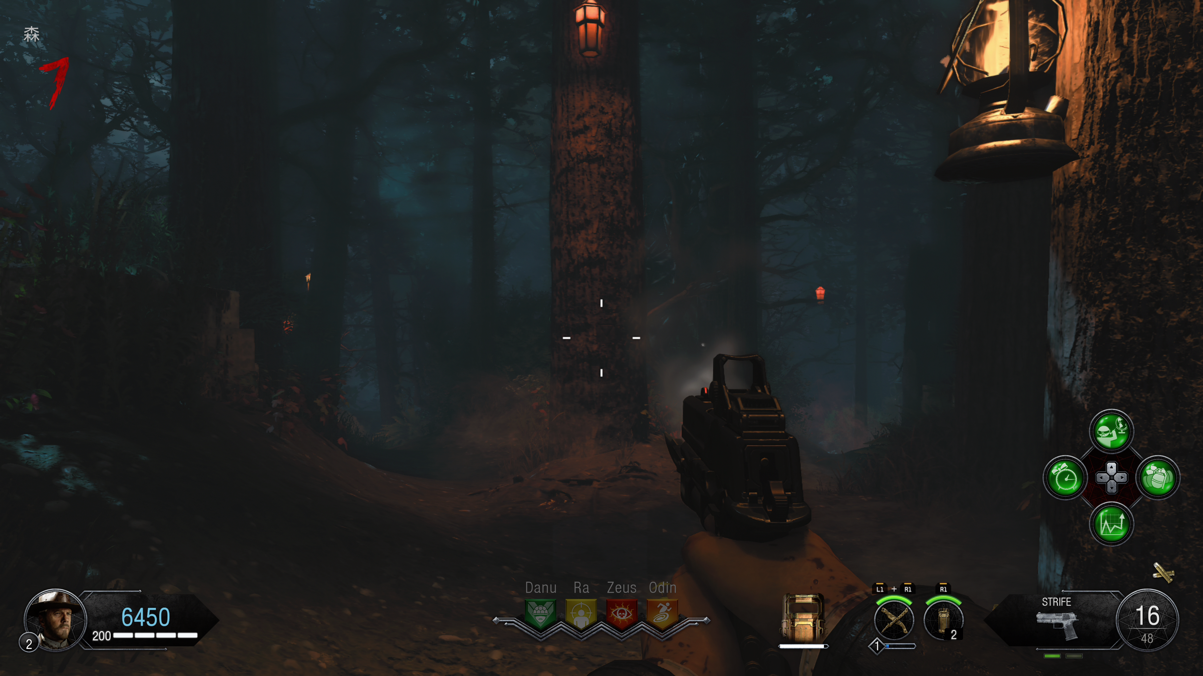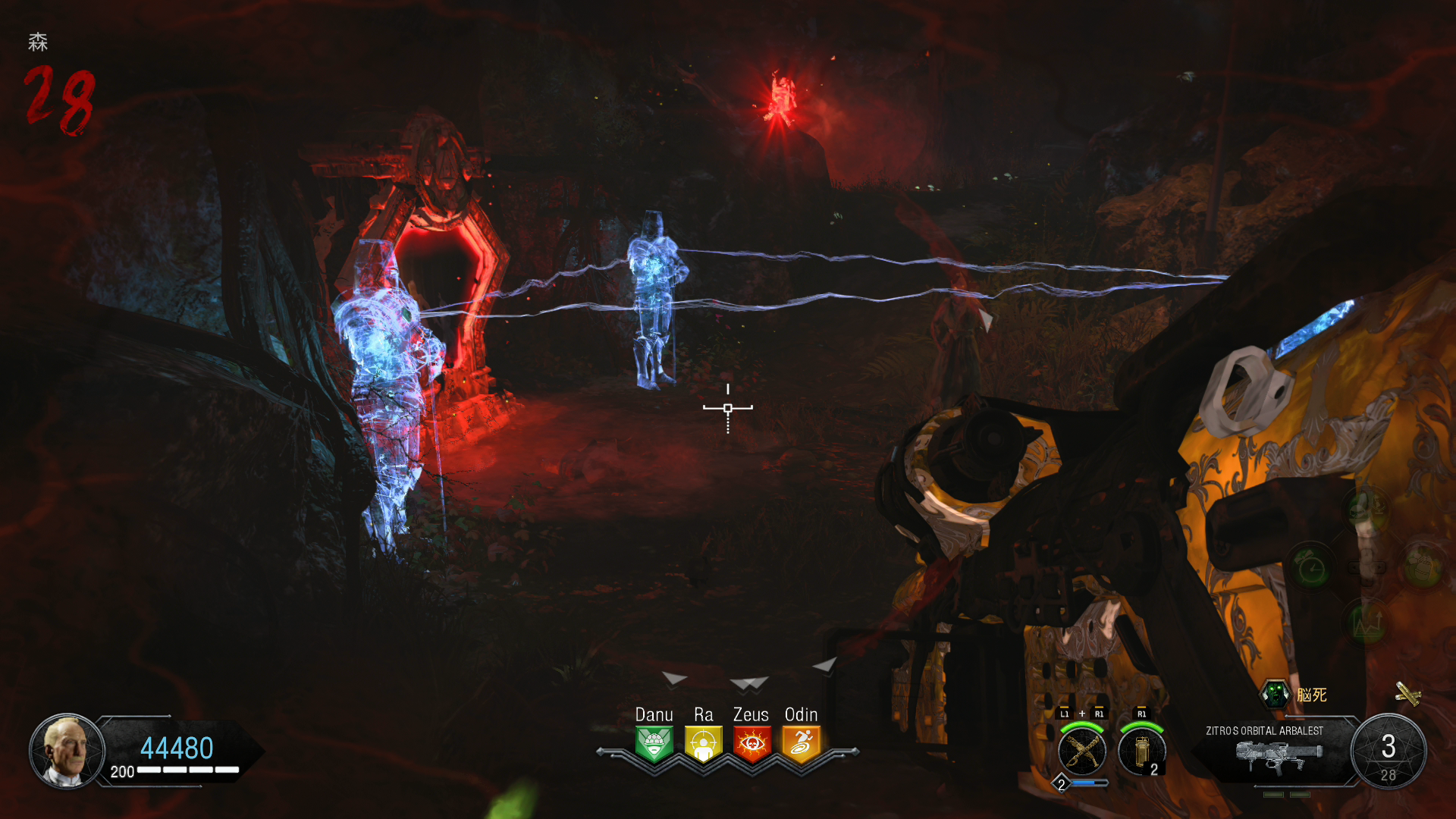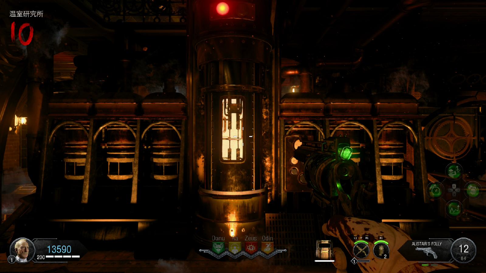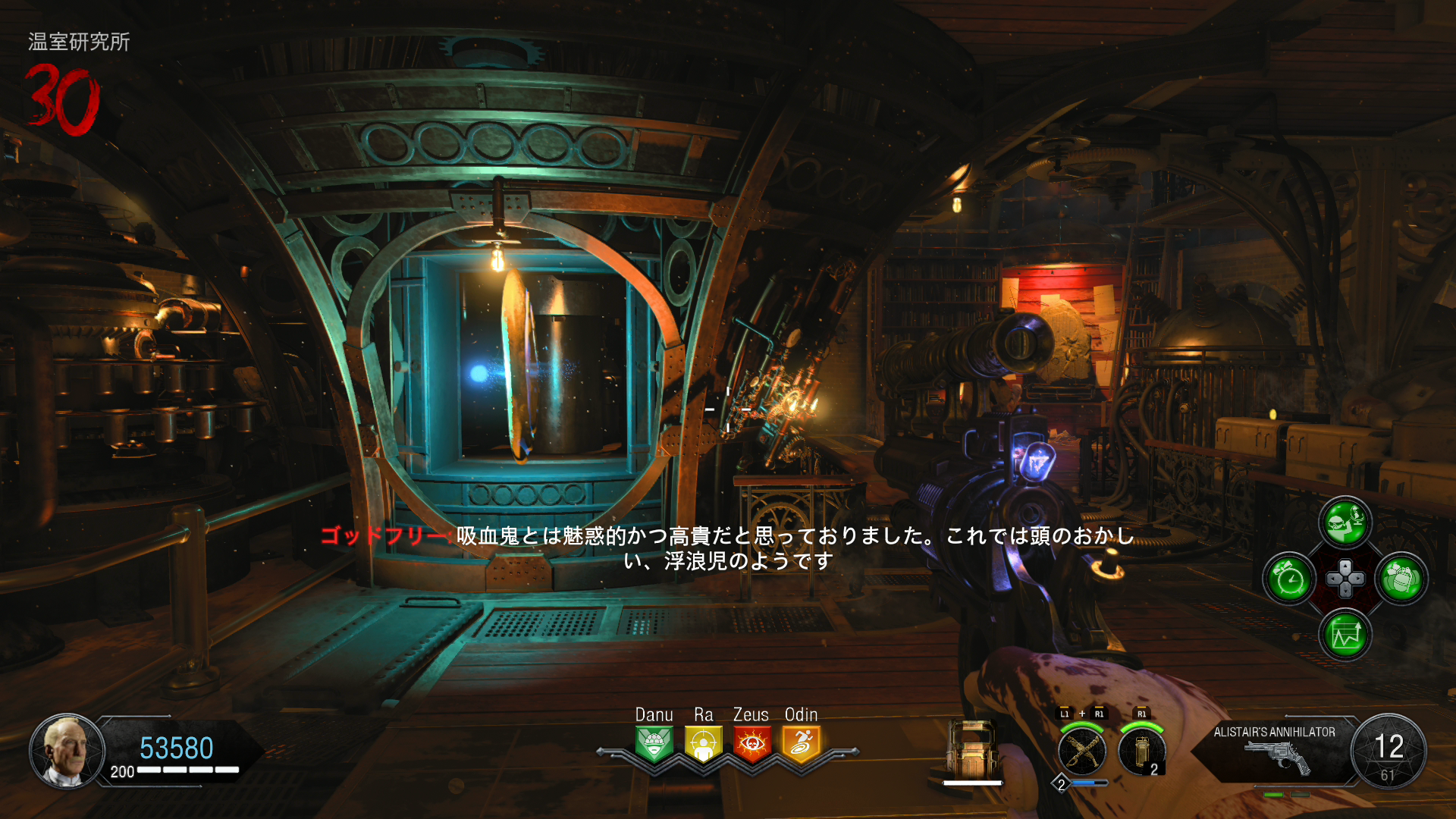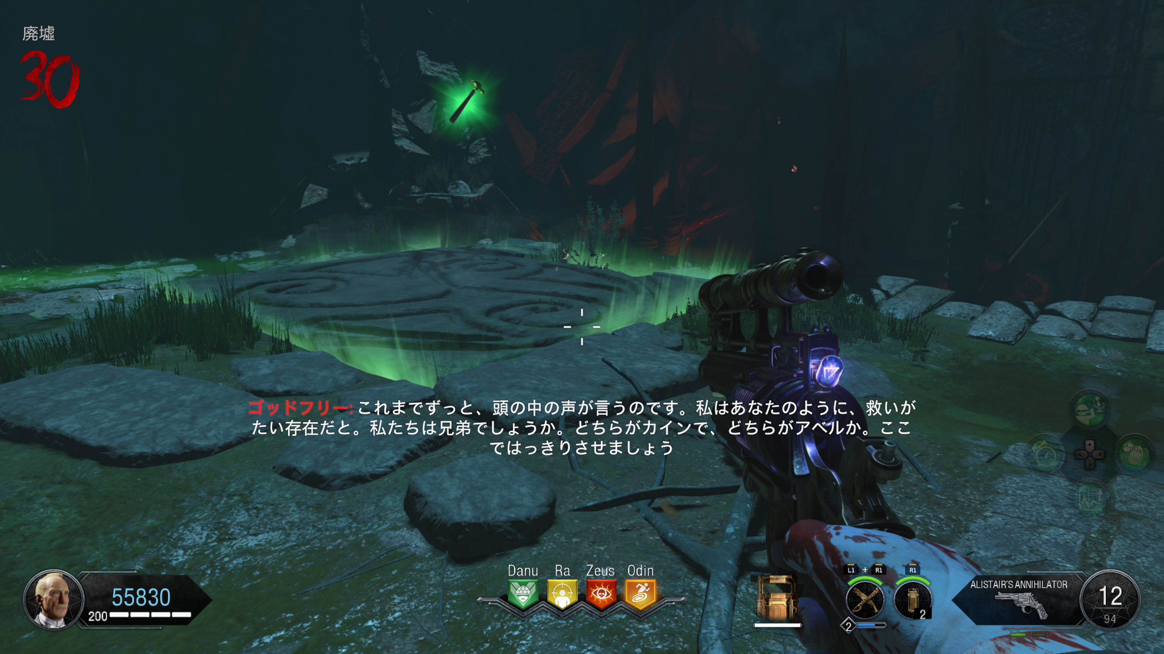 メインクエスト †パックアパンチ解放 †大階段でセンチネルの神器を使う。 その後、各部屋に石の入った壺があるので、打撃で破壊。周囲でゾンビを4キルすると石が輝くので、全て行う。候補地7か所。石は3か所 主寝室 ワインセラー(1) ワインセラー(2) 図書室 書斎 トロフィールーム 寝室廊下 石はチャージが完了すると、中を覗き込むことができる。 時計 ビリヤードルーム、メインホール、ダイニングルームに時計があるのでインタラクト。 インタラクトすると地面に紋章が現れるので、その中で一定時間待機。 完了すると音叉が出てくるので拾う。また、クリアでトロフィー「オンザクロック」入手。 PERK 表示されたPERKの像へ移動。 周辺にヴァンパイアが現れるので全員倒す。 完了すると音叉が出てくるので拾う。 人形 2階玄関ホールに人形があるのでインタラクト。幽霊が現れる。 幽霊の周囲に行くと移動するので、近づいては追いかけるを繰り返す。 最終的に墓地まで移動。 完了すると音叉を落とすので拾う。 女性の絵画 流れは人形と一緒。ゴールは温室テラス。 ロープの輪っか 流れは人形と一緒。 少女と老人 流れは人形と一緒。 悪そうな顔の女 流れは人形と一緒。 聖書 書斎の本棚。 流れは人形と一緒。 音叉を三つ入手したら、森のテラスにある玄関の黒い塊に使用。玄関が開くので奥へ進む。 一番奥にPAPがある。 途中、狼男が出現するので注意。 一番奥まで行くとPAPがある。 シルバー弾入手 †まず、6つのパーツを集める。候補地はそれぞれ三か所 ボトル 図書室からメインホールへ抜ける途中の西廊下のソファー ダイニングルームの時計の裏側にある赤いテーブル 燭台 メインホールの壁の前の壺 ビリヤードルームの床 ワインセラー右側の壁のあたり 皿 ワインセラー、テーブルの上 ワインセラー、棚の上 糞 墓地と霊廟のあたり。霊廟から屋敷側を見て正面の壁の左端 墓地と霊廟の階段の近くの木の後ろ 木炭 ビリヤード室の暖炉 メインホールの暖炉 硫黄 その後、ワインセラーの組立台で銀を作る。 ALISTER'S FOLLY †図書室に暗号を入力できるパネルがある。 マップ各地に正解の記号が点在しているので、それを確認して入力する。 青のシンボルは墓~霊廟あたり。候補地4箇所。 緑のシンボルは庭園。候補地4箇所。 黄色のシンボルは森のテラス。候補地4箇所。 赤のシンボルは、主寝室、西ギャラリー、ワインセラー、ダイニングルーム。 どれもMAP外やバリケードの外にある。 正解のコードを入力すると銃が取れるようになる。 一度入手すると、M.BOXでも出現するようになる。 バリスティックシールド †各地にある盾のパーツを組立台で組み立てる。部品はそれぞれ3箇所にランダムでスポーン シールドプレート メーター 喫煙室で組み立てる。 Chaos Theory †狼男をシルバー弾で倒すと、狼人間カオス素材を落とすので入手。 その後、温室研究所でプリママテリア装置を起動。 暫く待つと装置の側面にプリママテリアが出てくるので入手。 図書室へ行き、バリスティックシールドで左側の本棚を殴ると、隠し空間が現れて、銃のパーツが入手できる。 再度温室研究所へ向かい、ALISTER'S FOLLY を Chaos Theory 組立台でパワーアップすることができる。 R2でチャージショット発射可能。 Alistair's Annihilator †霊廟の正面、消えているランプの前あたりで、Chaos Theoryのチャージショットでヴァンパイアを倒す。黄色い何かに当ててる間にさらに竜巻を当てるといいのかもしれない。 そのうち、ヴァンパイアが胆汁を落とす。 何個か胆汁を拾っていると、霊廟正面の墓が赤く光る。 インタラクトすると、赤いヴァンパイアが現れるので倒す。 すると、吸血鬼カオス素材が手に入るので入手。 これを温室研究所のプリママテリアにかけるとパーツが一つ入手できる。 次に、霊廟の正面、1ラウンドごとに、ランプが一つ追加で点灯する。 これをChaos Theoryで撃つと、他のランプが点灯する。一定時間以内にランプを撃ち続けていると、3箇所目くらいで蝙蝠が空に向かって飛び立つ。それをChaos Theoryで撃ち落とすと蝙蝠カオス素材が入手できる。 これを温室研究所のプリママテリアにかけるとパーツが一つ入手できる。 最後に森で、土に埋まってキノコが生えている骨の周囲にいく。 この骨の上で、チャージショットをゾンビを直接当て、黄色い何かが発動すると、地面を掘ってパーツが出現する。三か所のうち正解は一か所。 これを入手。 三つのパーツを集めた後、温室研究所の Alistair's Annihilator組立台で、Chaos TheoryをAlistair's Annihilatorに加工できるようになる。 結晶からチャレンジを受ける †PAP解放の際にチャージした結晶を再度インタラクトすると、イラストが見える。それに対応したクエストをこなす必要がある。 騎士 †ALISTER'S ANNIHILATOR とシールド必須。 図書室のファイアゲートの罠を作成する。 ファイアゲートを起動するためのアイテムはランダムで各地に散らばってる。 暖炉にランダムに決まる順番に