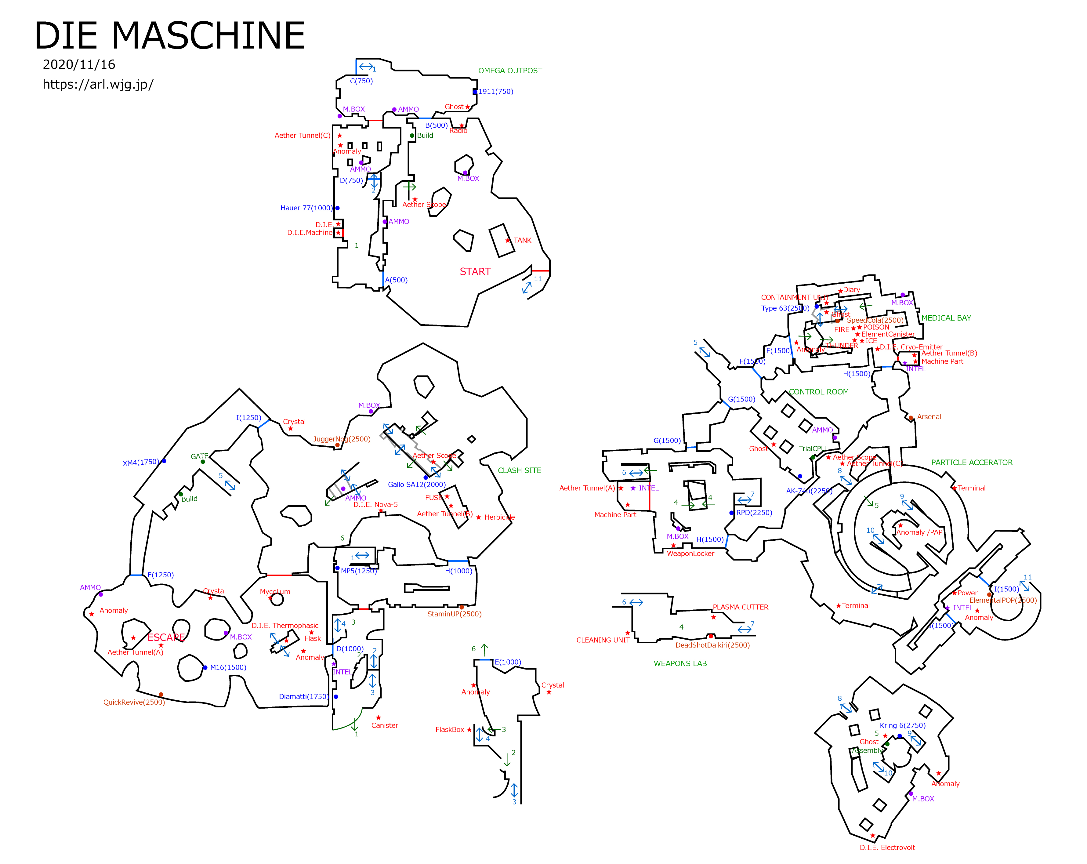 Call of Duty Black Ops Cold War/ゾンビモード/MAP攻略 DIE MASCHINE †MAP †ステージ説明 ポーランド、モラスコ 世界中で次元のゲートが開きアンデッドの大群が人類を脅かす。暗闇から浮かび上がる新たな冷戦の脅威。すべての根源であるナチス施設の廃墟を調査せよ これまでのプレイヤー向けの最低限の攻略情報 †・サルベージ、高品質サルベージという新しい通貨が出現 初期状態だと、犬と中ボスに瞬殺される可能性が高いので、早めにPERKのジャガノをレベル3まで上げて、加えて高速蘇生をレベル2まで上げておくと、生存確率が一気に上がる。 あとは、 ・全体的に弾丸が安い などを理解できれば、おそらく今まで通りプレイできるはず。 メインクエスト †手順さえ覚えればおおむね1時間程度でクリア可能。 PAP †施設に潜入せよ 加速器を安定させろ 異変を調べろ マシーンの部品を回収せよ PAP起動後、変異がMAP各所に出現するフラグが立ち、直後より次の手順を実施可能。 エーテルスコープ †MAP各所の変異からダークエーテルに入ることで、MAP各所にエーテルスコープのパーツが出現する。 パーツの場所は、初期位置の階段の横、墜落現場の飛行機の翼の上、粒子加速器のエーテルトンネルの裏。 パーツを集めたら、粒子加速器の下の組み立て台で組み立てを行い、エーテルスコープを入手。 尚、一度ダークエーテル中の作業が時間切れになった場合は、ゾンビを複数体倒すことで、変異出現ポイントへMAP上で☆マークが出現し、そこから入ることができる。 幽霊 †診療所の変異からダークエーテルに入っている間に、診療所の2階小部屋の机の上を見ると、フォーゲル博士の日記があるので、拾う。 その後、診療所のスピードコーラの裏→制御室CPUを正面に見て右側→粒子加速器の組み立て台の前のジュースでエーテルスコープが反応する。 各所で光の塊が現れるので、インタラクトすることで幽霊が出現するので、それぞれ、日記を渡す。するとセリフが流れる。セリフが流れ始めたらすぐに次の場所の幽霊を出現させることが可能。 ※スペクトラム反射 粒子加速器の幽霊までしゃべらせたら、次の手順のパスワードが出現する。 ダークエーテル脱出後、診療所の日記があった机のPCの横のメモにパスワードが書かれているので、PCをインタラクトすれば自動的にパスワードが入力され、診療所にキャニスターが出現する。 このタイミングで、変異での移動が必須のD.I.E.マシーン強化に関しては、条件が整い次第変異が強制的に出現するようになる。 診療所のキャニスターを撃つ †D.I.E.マシーンを四種強化しておく。 診療所の中央の天井にキャニスターがあり、留め具のようなところに、対応した強化D.I.E.マシーンを打ち込むと、反応がある。それぞれの留め具は4属性それぞれのD.I.E.マシーンに対応している。詳細はMAP参照。 4種すべてを実施すると完了。次の手順の変異が診療所南出口に出現する。 除草剤 †再度変異からダークエーテルへ行く。 ※スペクトラム反射 診療所のType63の横あたりに行くと光が現れインタラクトできる。インタラクトしてセリフが終わったのち、ダークエーテルレンチが地面に落ちているので入手。 スタート地点の戦車の側面をレンチでインタラクトできるので、3回実施。 その後、セムテックス、グレネード、C4等で戦車を爆発させると、戦車が発砲を行う。 墜落現場のエーテルトンネルを塞ぐ飛行機の裏の木のあたりに玉が除草剤の入った玉は落ちてるので入手。除草剤に近づいた際、周囲にゾンビとプレイグハウンドが大量に発生するので注意。 尚、除草剤は持っている間攻撃ができなくなってしまう。 除草剤を診療所のType63の横あたりのCONTAINMENT UNITに設置。 キャニスターへメガトンを吸わせる †メガトンを倒し、分裂した個体二匹をキャニスターの真下へ誘導。キャニスター吸われる。 写真 †「リビングルーム」にある変異からダークエーテルへ移動。 ※ここで、クイックリバイブ前のエーテルトンネルを正面から見て右手後方で追加スペクトラム反射を見ることができる。また、チャレンジPCのある部屋のAK-74uが売っているあたりでも追加スペクトラム反射を見ることが可能。 オメガアウトポストへスタート地点から見て入った先、右側手前奥へ行くと、エーテルスコープが反応し、幽霊を出現させられる。イベント終了後、ダークエーテルから戻ると、同じ場所に写真がある。 写真を取得するとボス戦開始。 ボス戦 †粒子加速器にワープし、ボス戦開始。 ボス戦自体は、防衛戦。 基本的に、メガトン等の中ボスは倒すと弾丸を落とすので、積極的にD.I.E.マシーンで倒して弾を稼いだほうが良い。 ソロの場合、強化したD.I.E.マシーンはあったら楽。お薦めはエレクトロボルトで、これがあればほぼ他の武器は不要。 基本的に防衛するキャラクターは、ソロの場合、どれだけ殴られても倒れることは無い。また、D.I.E.マシーンで攻撃してもダメージを喰らわないので、基本的には