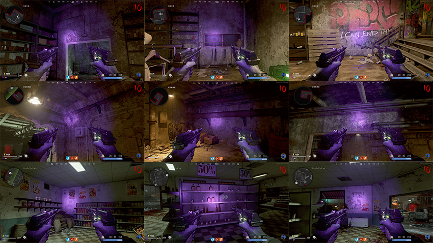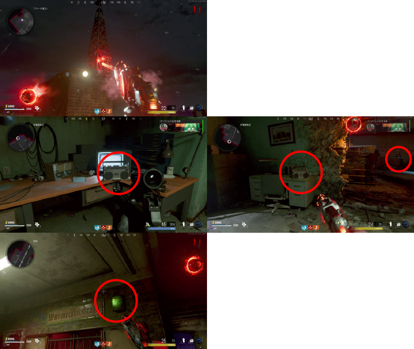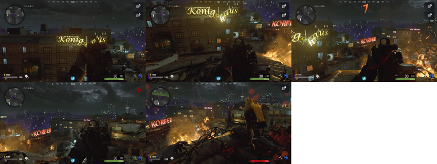 MAUER DER TOTEN †MAP †ステージ説明 東と西に分裂した街。仇敵との不安定な同盟関係。太古の敵が影から忍び寄る。世界を危機から救うのは誰だ? OUTBRAKEのサイドストーリにて、オペレーションインバージョンの阻止、科学者の亡命を手伝った後、ヘリコプターのパイロットが人質に取られ、何故かレクイエムがオメガの言いなりになっているところからスタート。オメガを裏切った科学者の阻止が目的らしい。 メインクエスト †手順を覚えれば小一時間ほどでクリア可能。ソロの場合、17,8ラウンドでボス戦に到達できれば、雑魚ゾンビもあまり固くなく、クリアしやすい。 電源投入 †地下の電源室で電源スイッチを入れるとヒューズが壊れるので、2つのヒューズを見つけて設置し、電源を入れる。 ・東ベルリン通りでテンペストが出現するので倒すとヒューズを落とす。 電源を入れると各地のジップラインやラペリングが解放される。 PAP †地下を経由してチェックポイント(チャーリー)にてPAPマシーンをインタラクト。中ボス戦になり、倒すと起動できる。 KLAUS起動 †PAPで武器に脳死をつける必要あり。その後、以下をそれぞれ実施 ・ホテルルーム305で脳死のゾンビに壁を破ってもらってジャック捜査官の首を絞めている手首を入手 以上2つのアイテムを入手して、地下セーフハウスのクラウスに設置すると起動する。一定時間、自動追尾しながら戦闘してくれる。戦闘中は位置的にタクティカル装備枠を奪われるが、クラウスがいなくなると、使えなくなっていたタクティカル装備は復活する。 一度起動した後は、地下のセーフハウス、地上の西ベルリン通り、中層階の屋根(ケルバー)にて、2000ポイントで再起動可能 ブラックライト入手 †クラウス起動後、制御室の奥のロッカーの前の床をL1で設定。するとクラウスがやってきてロッカーを開けてもらえる。ロッカーの中にブラックライトが入っている。 ワンダーウェポン †下記三か所の壁に、数字が書かれている。 1.衣装工場の弾薬箱の上 それぞれの数字が書かれた部屋の壁のどこかにブラックライトを当てると、桁の数字が浮かび上がるので、それぞれの〇で囲まれた数字の番号と、浮かび上がった数字をメモ。場所はランダムで、数秒当てる必要あり。ゆっくりと部屋の壁や棚など、全体に光を当てていると見つかる。候補地はそれぞれ3か所? 1.衣装工場 弾薬箱横の壁の黒板 2.従業員通路 3.スーパーマーケット それをホテルルーム305号室奥の金庫で番号入力する。インタラクトで番号入力モードになり、視点移動でダイヤルに視点を合わせるとそれぞれタクティクルボタンとリーサルボタンで回せられる。左から1,2,3の順に番号を設定し、正解すると中からCRBR-Sが手に入る。尚、番号入力中はゾンビが近寄ってきても攻撃はしてこない。 KLAUS強化 †PAPのある場所の横、オートターレットで撃たれる「デスストリップ」で瓦礫の山を掘っているとマイクロウェーブの円盤がドロップするので入手し、衣類工場のアップグレードステーションのフレームに装着する。 クラウスを連れて一定数ゾンビをキルしてもらっていると、フレームのモニターが赤色から緑色になる。その状態でアップグレードステーションの手前あたりの床をタクティカルで移動指示すると、クラウスがフレームに入る。その後、周囲で1分間防衛戦。 正直BOCWゾンビモードの防衛戦の中で最上位に入るほど攻撃が激しい。ソロの場合は、CRBR-Sのノーマルバージョン(リロードが早いため)、スピードコーラなどを持った上で臨んだほうが良い。また、アップグレードステーションの正面階段よりも、右側の窓から入ってくるゾンビを見逃しやすいので注意。 達成後、青白い光が発生し、クラウスが強化される。 メインクエスト †KLAUSにハッキングヘルメット装着 †以下のアイテムを入手 ・アパート(屋上) 弾薬箱を向かって左上部にアンテナがあるのでCRBR-Sで撃つとアンテナが入手できる それらを入手後、クラウスをインタラクトするとハッキングヘルメットを組み立てて装着できる。 研究所突入 †下水道への道の奥でクラウスを呼ぶと、壁を壊してくれる。目の前の床をタクティカルボタンで設定すること。 CRBR-S入手後、雑魚から入手気できるアイテムで CRBR-S フレイザー(武器発射ボタンぽしっぱなしでビームのようなものを発射できるタイプ)を作成。 下水道への道の奥でKLAUSが壊した壁の中の鉄板をCRBR-S フレイザーで数秒撃ち続けると中の研究所に入れるようになる。 研究所に入ると強制的にラウンドが進み、トーメンターラウンドに突入。 それぞれ入手後、MAP各所に出現しているエッセンスハーベスターにキャニスターを設置し、周囲にエンドステーションルアーを設置。テンペストが3匹出現するので倒すと、しばらくしてキャニスターが紫色に輝き取得できる。 取得すると走れなくなり、敵が大量に沸くので、倒しながら研究室に戻り、キャニスターを再度設置する。 これを3つすべて行う。 